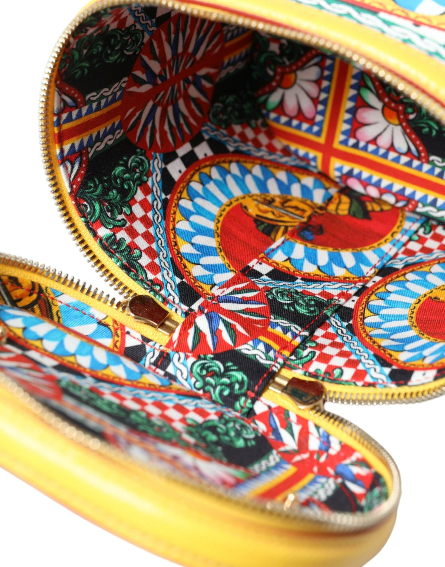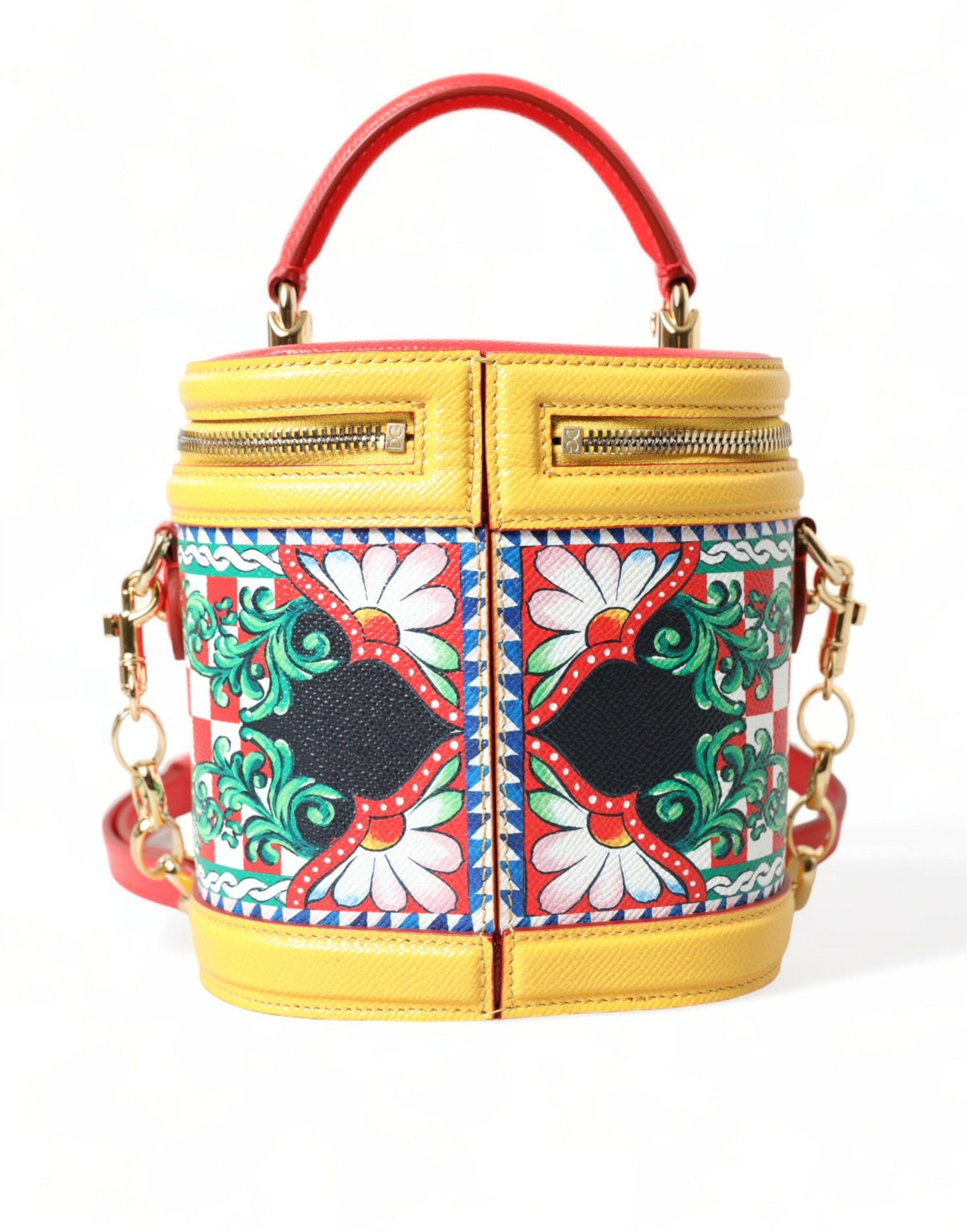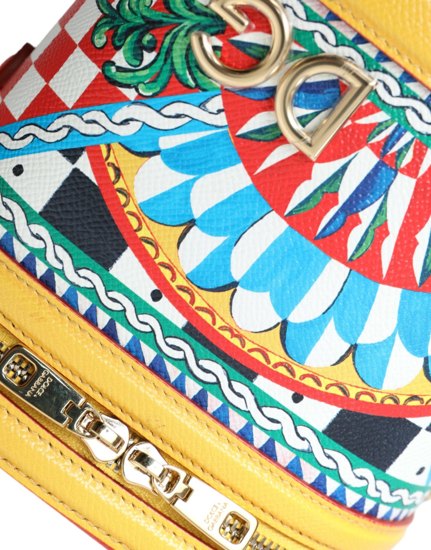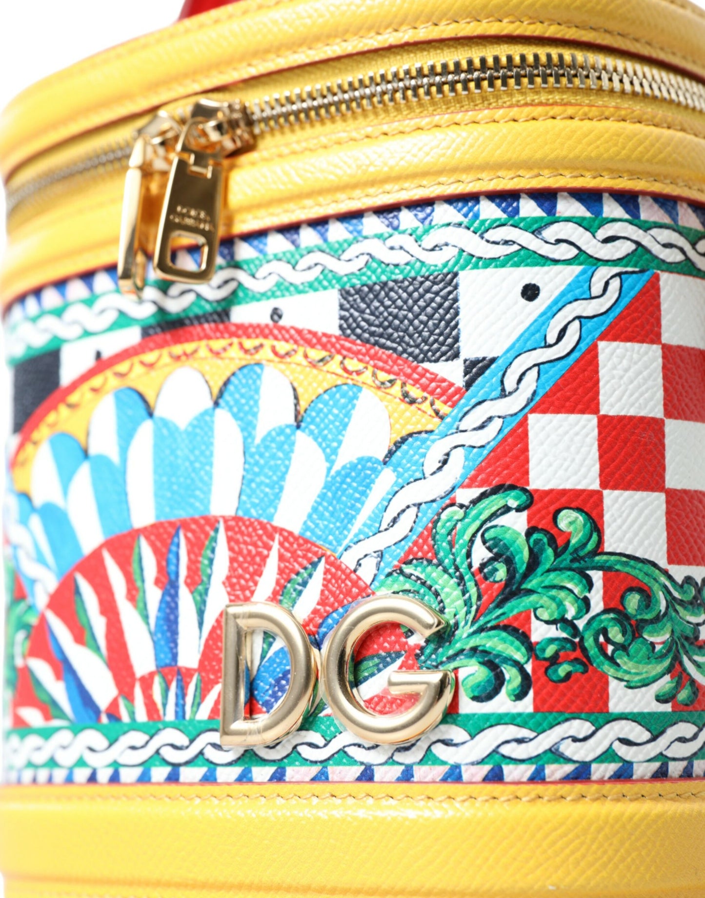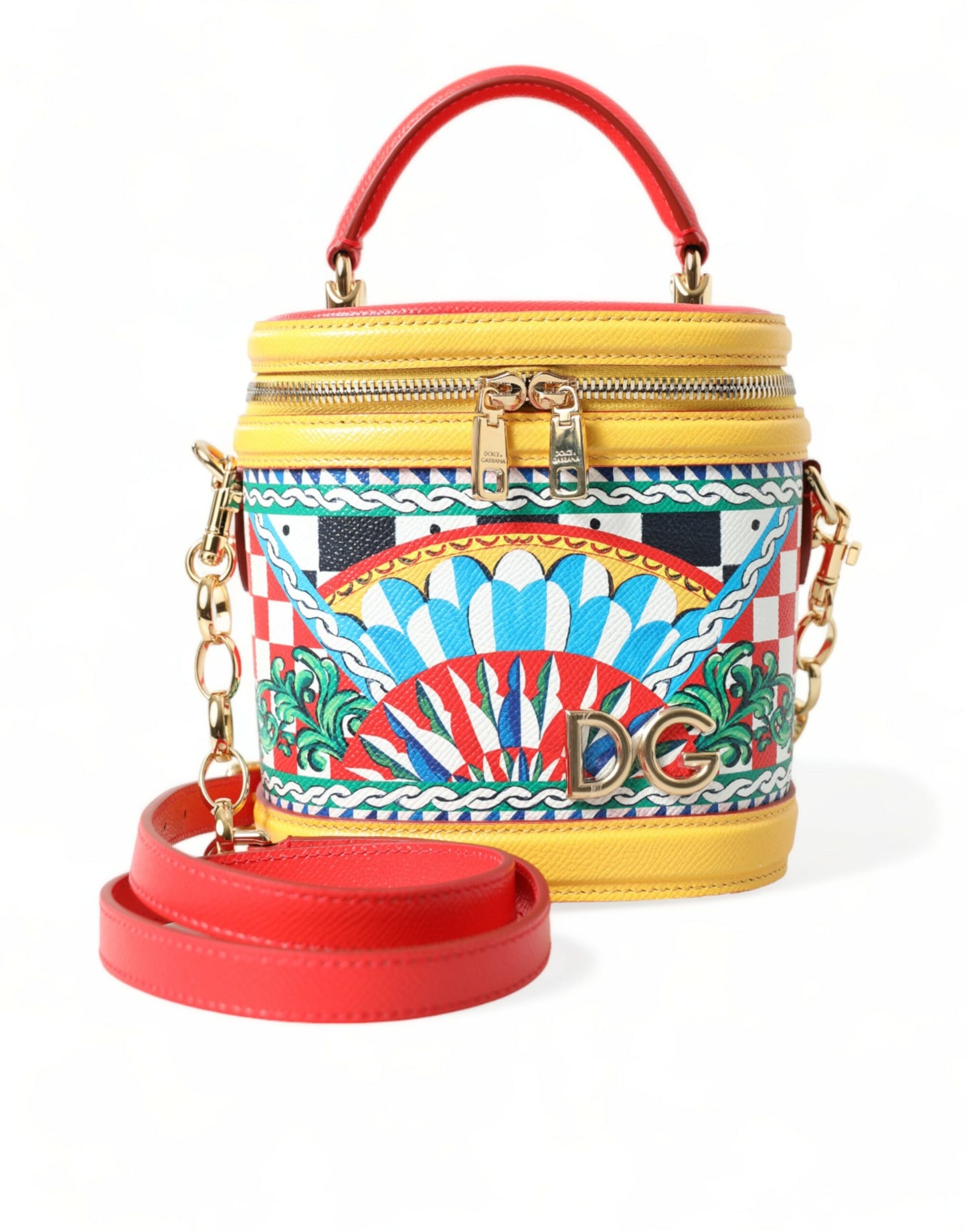 Indulge in the essence of Sicilian elegance with this sumptuous Dolce & Gabbana DG Girls Vanity bag. A perfect addition to your style repertoire, this bag is adorned with a vibrant Carretto print and meticulous gold metal detailing. Crafted from the finest leather, it features a versatile top handle along with a detachable shoulder strap. Its spacious fabric-lined interior and a secure zip-around closure cater to both convenience and style. This piece is not just a fashion statement but a testament to exceptional Italian craftsmanship.