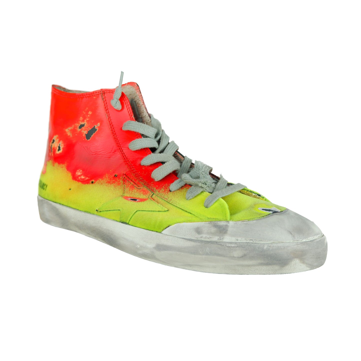 Dazzle with every step in these fluo multicolored patent leather sneakers. These chic sneakers are the perfect blend of luxury and comfort, meticulously crafted from 100% calf leather for supreme quality and durability. Designed and made in Italy, they exude elegance with their vibrant hues and sleek finish, ensuring you stand out in any crowd.