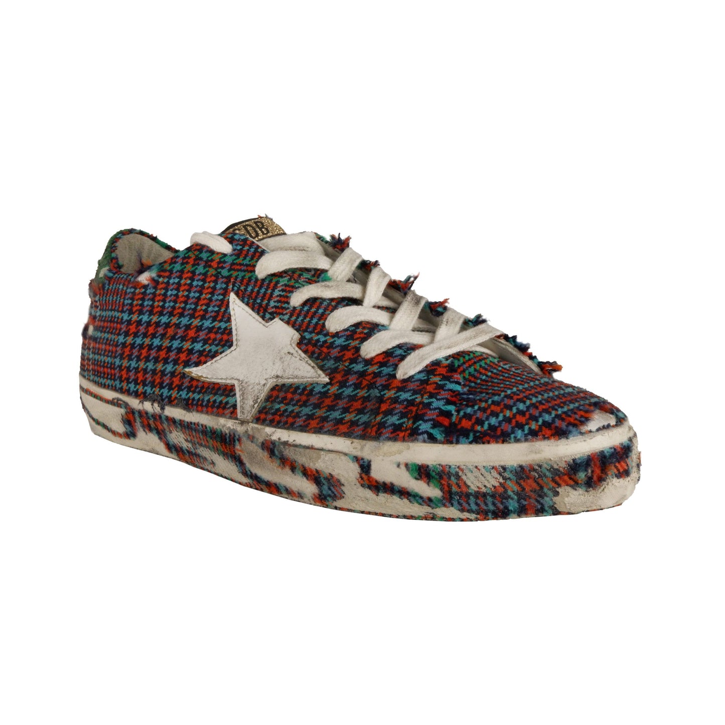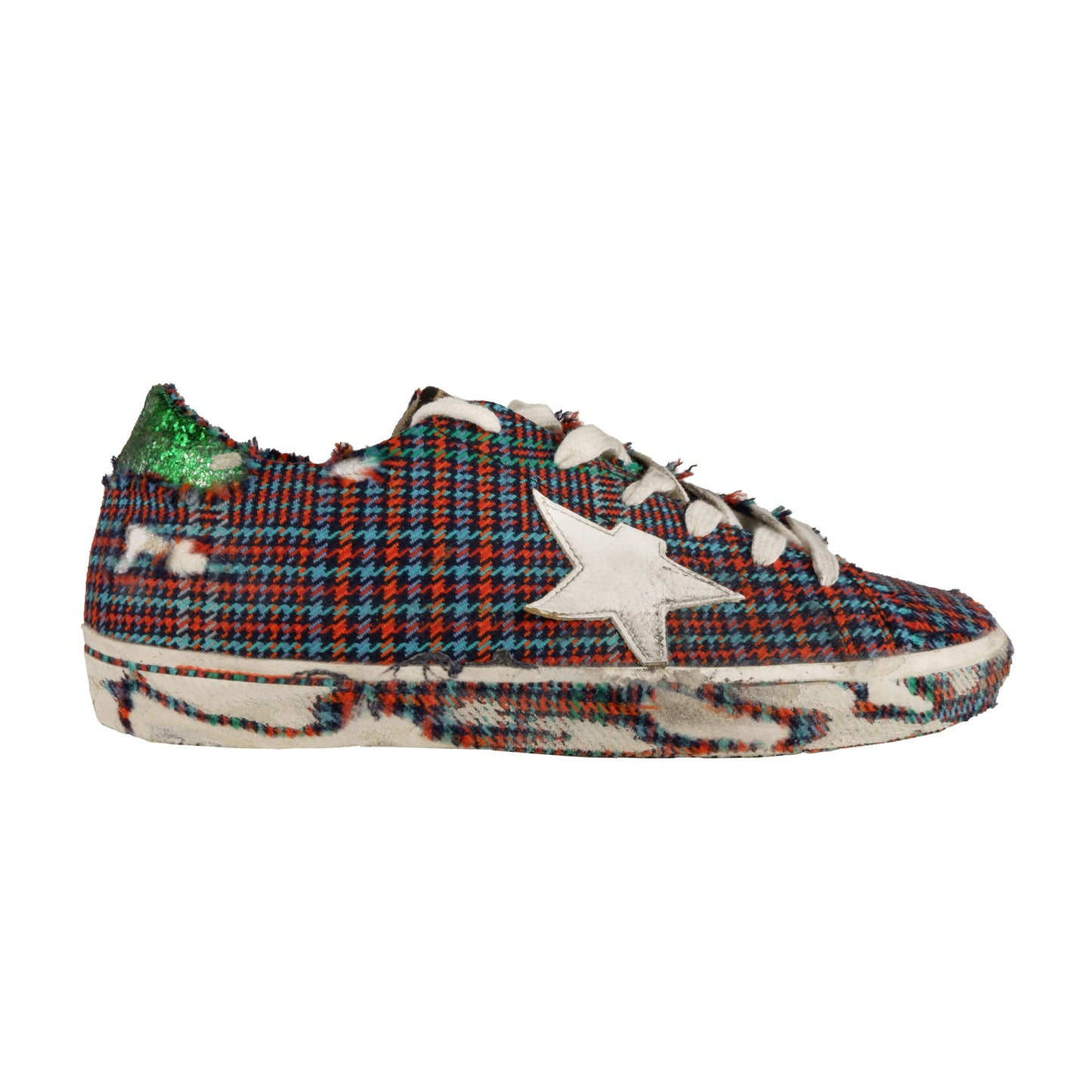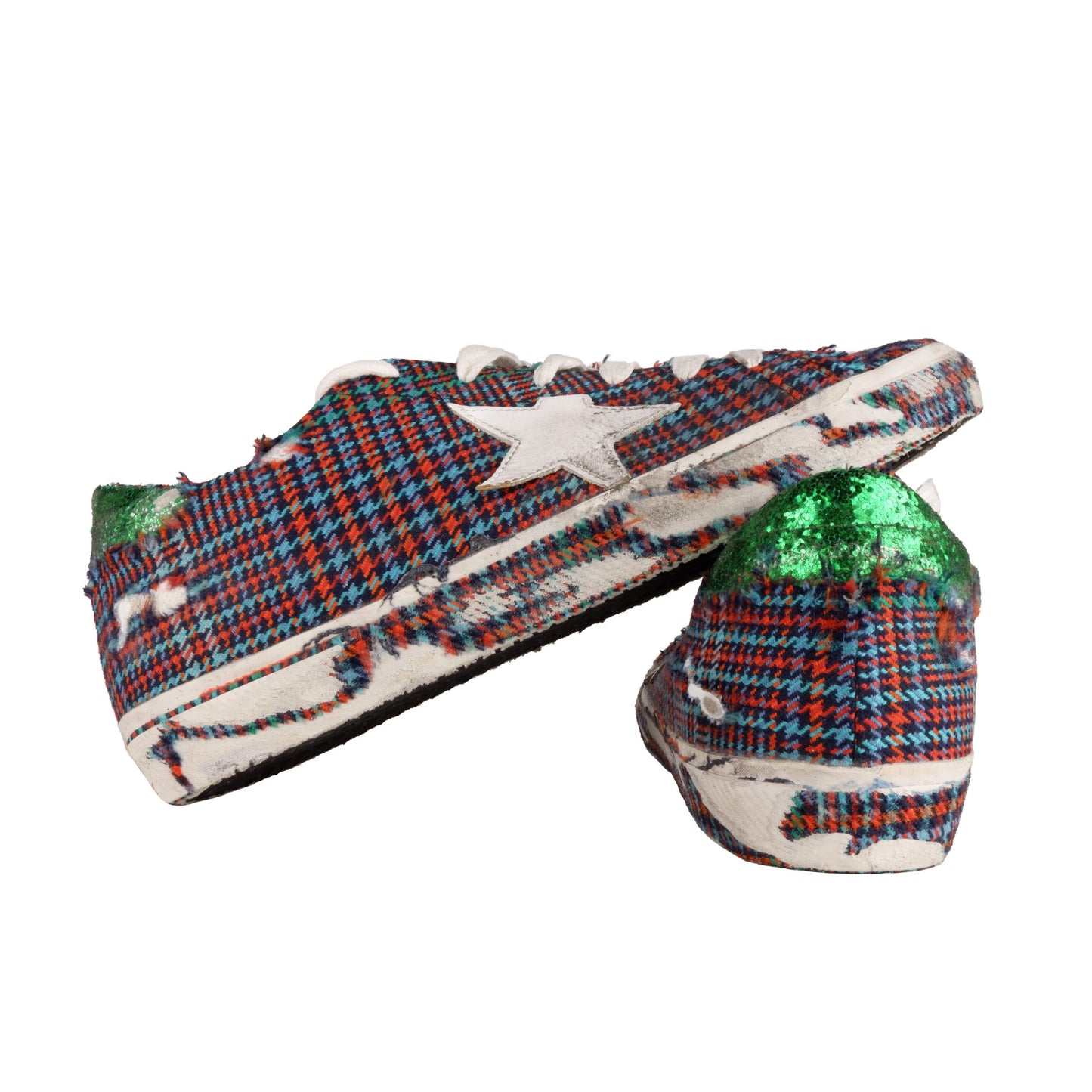 Experience the perfect blend of elegance and comfort with these sneakers featuring a vibrant multicolored houndstooth pattern, complemented by a striking green glitter heel. Crafted from the finest leather, these sneakers boast a signature white leather star logo, adding a touch of luxury to your everyday style. The durable rubber sole ensures a comfortable stride. Proudly made in Italy, these shoes are a testament to exquisite craftsmanship and timeless design.