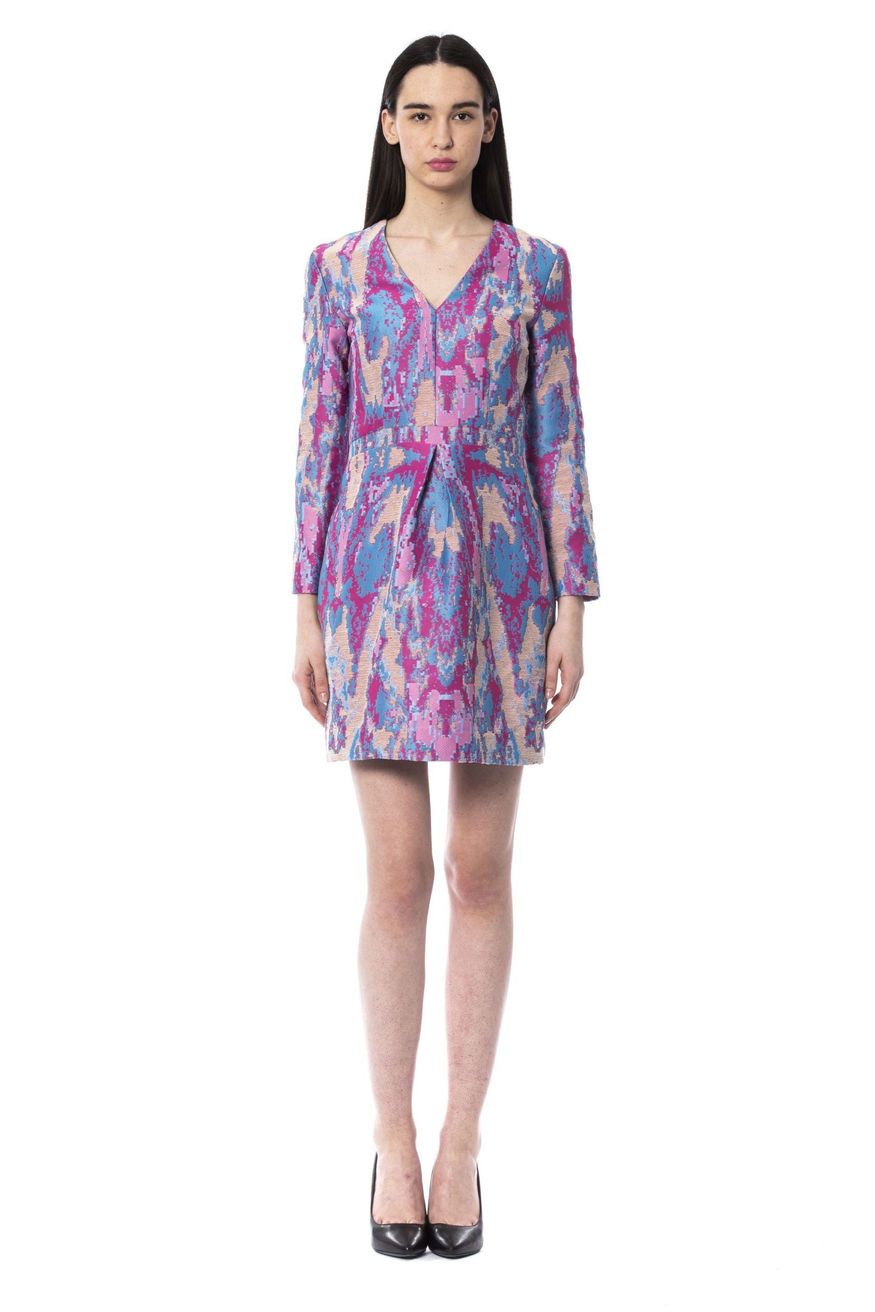 Embrace elegance with this eye-catching ‘BYBLOS’ V-neck Dress, perfect for any occasion that calls for a touch of sophistication. Featuring a bold, multicolored print and a short silhouette tailored to accentuate your style with a modern twist.
