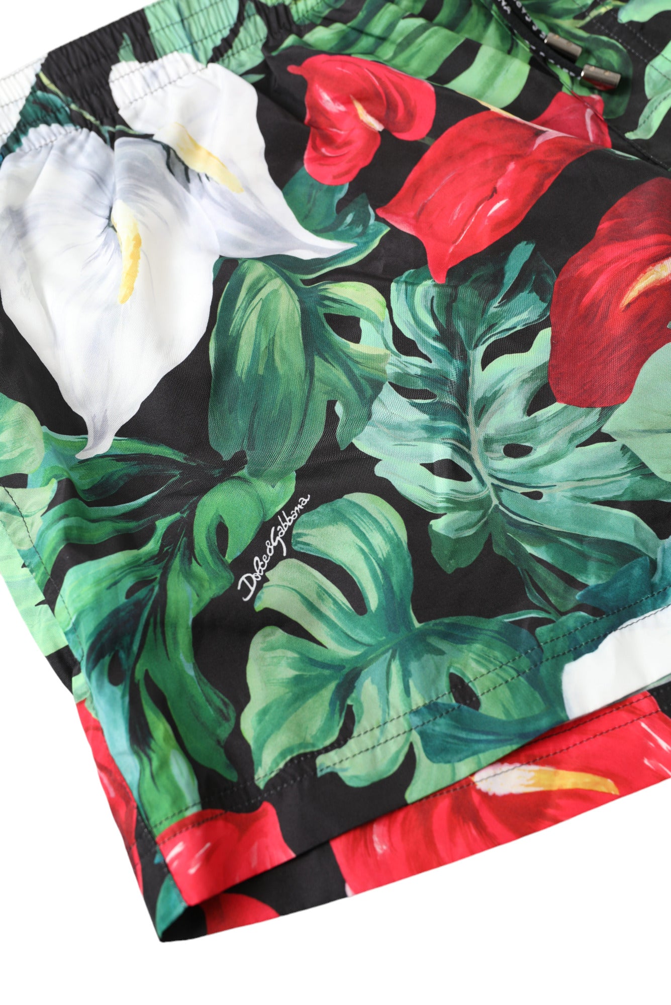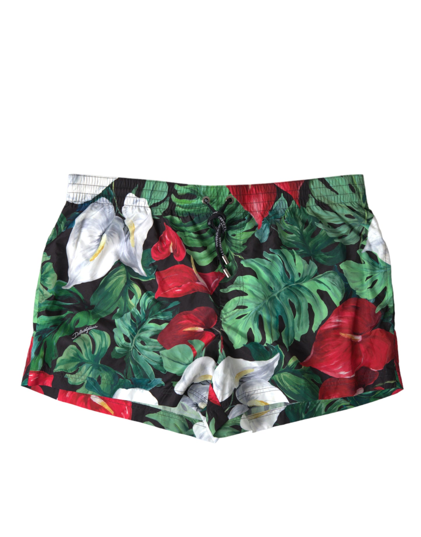 Indulge in the essence of summer with these stunning, 100% Authentic Dolce & Gabbana swimming trunks, brand new with tags. Adorned with vibrant monstera leaves and anthurium flowers, these multicolored trunks are a true statement piece. Crafted for comfort and an adjustable fit, they feature a convenient back zip pocket and an elastic waist with a drawstring. Perfect for any beachwear occasion, they radiate luxury and style, synonymous with the Dolce & Gabbana brand. Made in Italy, they promise great fit and comfort with a splash of high-end fashion.