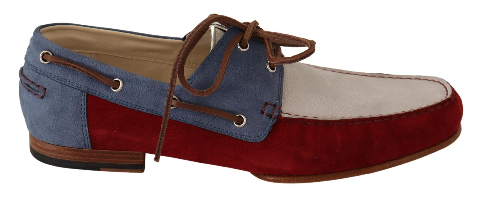 Experience the epitome of Italian craftsmanship with these exquisite Multicolor Leather and Suede Loafers from the esteemed house of Dolce & Gabbana. These brand new loafers come with tags, ensuring their authenticity and untouched quality. Flaunting an elegant almond toe, a debonair lace-up front fastening, and a comfortable slip-on style, these shoes are designed for the gentleman who appreciates luxury and high-end fashion. Whether for formal events or casual outings, the branded insole and flat, leather sole promise both style and comfort, making them a versatile addition to your wardrobe.