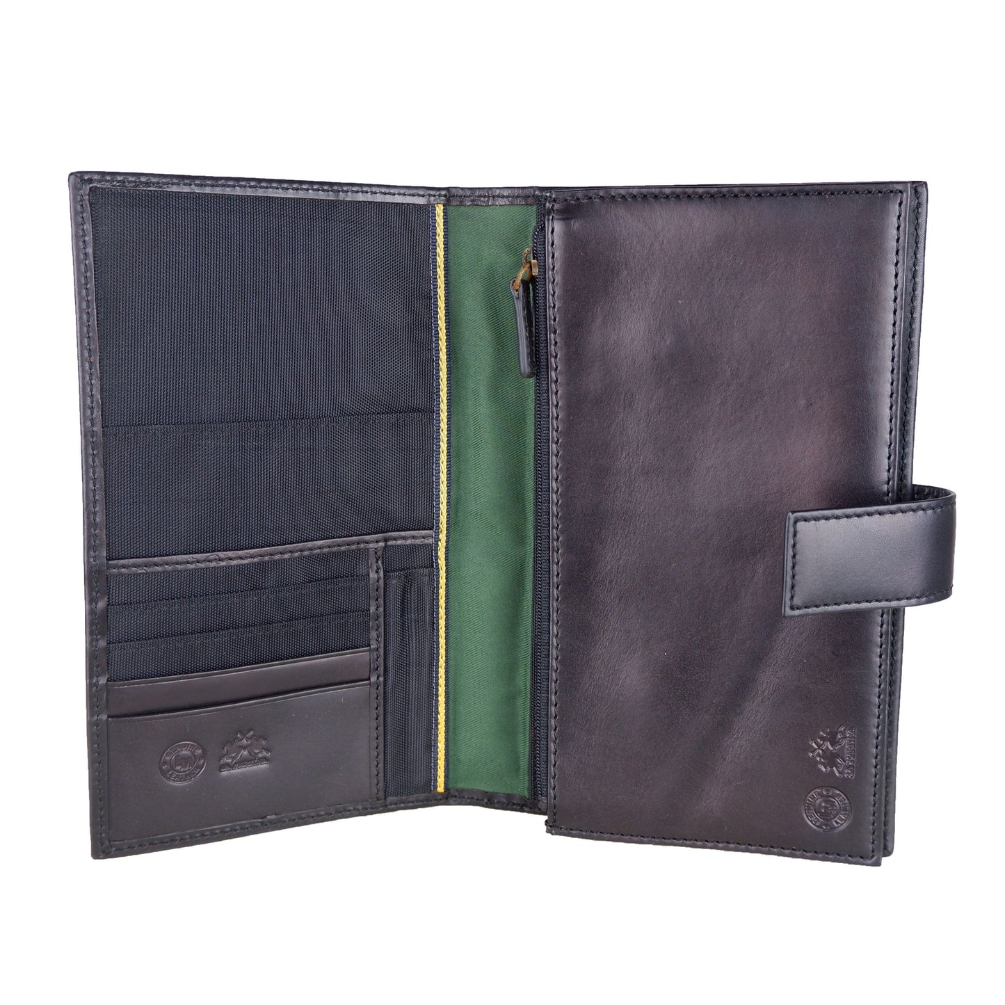 Sleek and stylish, this travel documents holder is the perfect companion for the modern voyager. Crafted with a blend of fine materials, it features a distinguished black hue that exudes sophistication. The front is adorned with a subtle logo, offering an understated touch of luxury. Equipped with leather inserts and a removable card and coins holder, it ensures all your essentials are organized and easily accessible. Its compact dimensions make it an ideal travel accessory for those who appreciate a seamless blend of functionality and elegance.