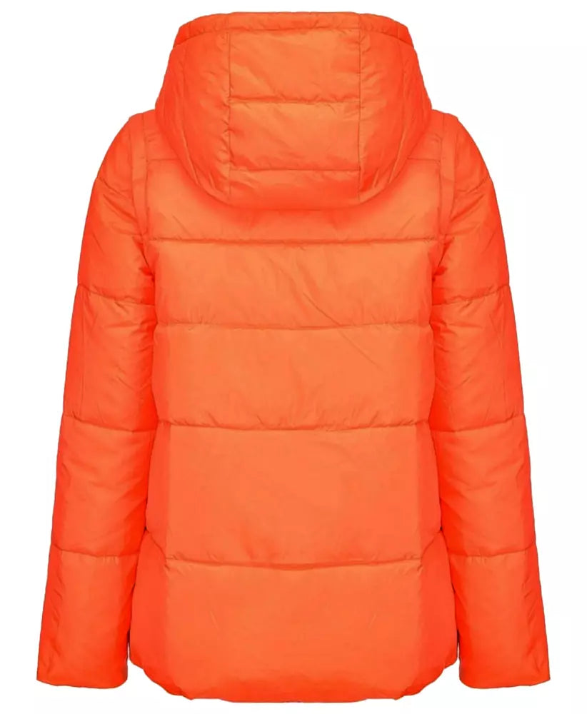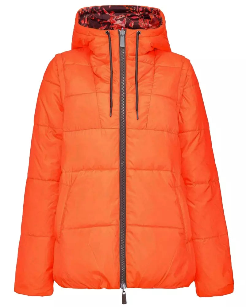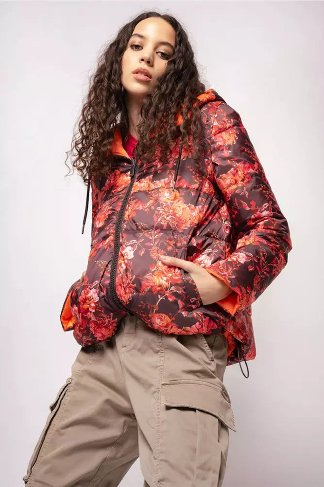 Step into versatility and style with this eye-catching reversible down jacket. Adorned with a vibrant orange hue on one side and an enchanting floral print on the flip, this jacket promises to be a statement piece in your wardrobe. The design includes four practical pockets, a zip closure for added warmth, and a snug hood for those chilly days. Unique detachable sleeves transform it effortlessly from a cozy jacket to a stylish vest, adapting to your fashion needs. Crafted with excellence in Italy, this jacket is a true blend of functionality and high fashion.