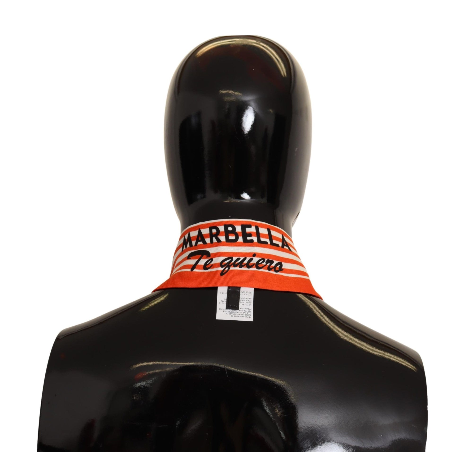 Indulge in the opulence of an Authentic Dolce & Gabbana striped foulard scarf. This luxurious accessory, new with tags, is crafted from the finest 100% silk, featuring an eye-catching Marbella print. Its vibrant orange hue complemented by crisp white is sure to add a burst of color and elegance to any ensemble. Perfectly sized and adorned with delicate logo details, it’s a testament to Italian craftsmanship.