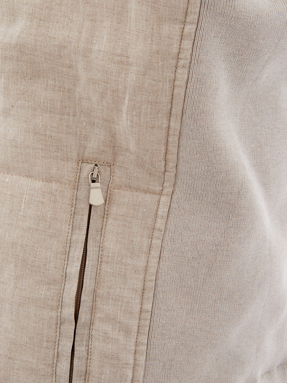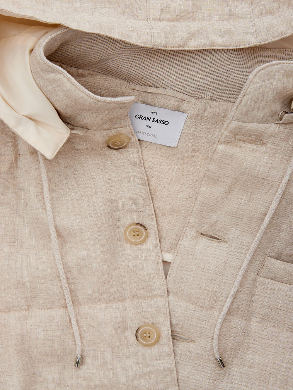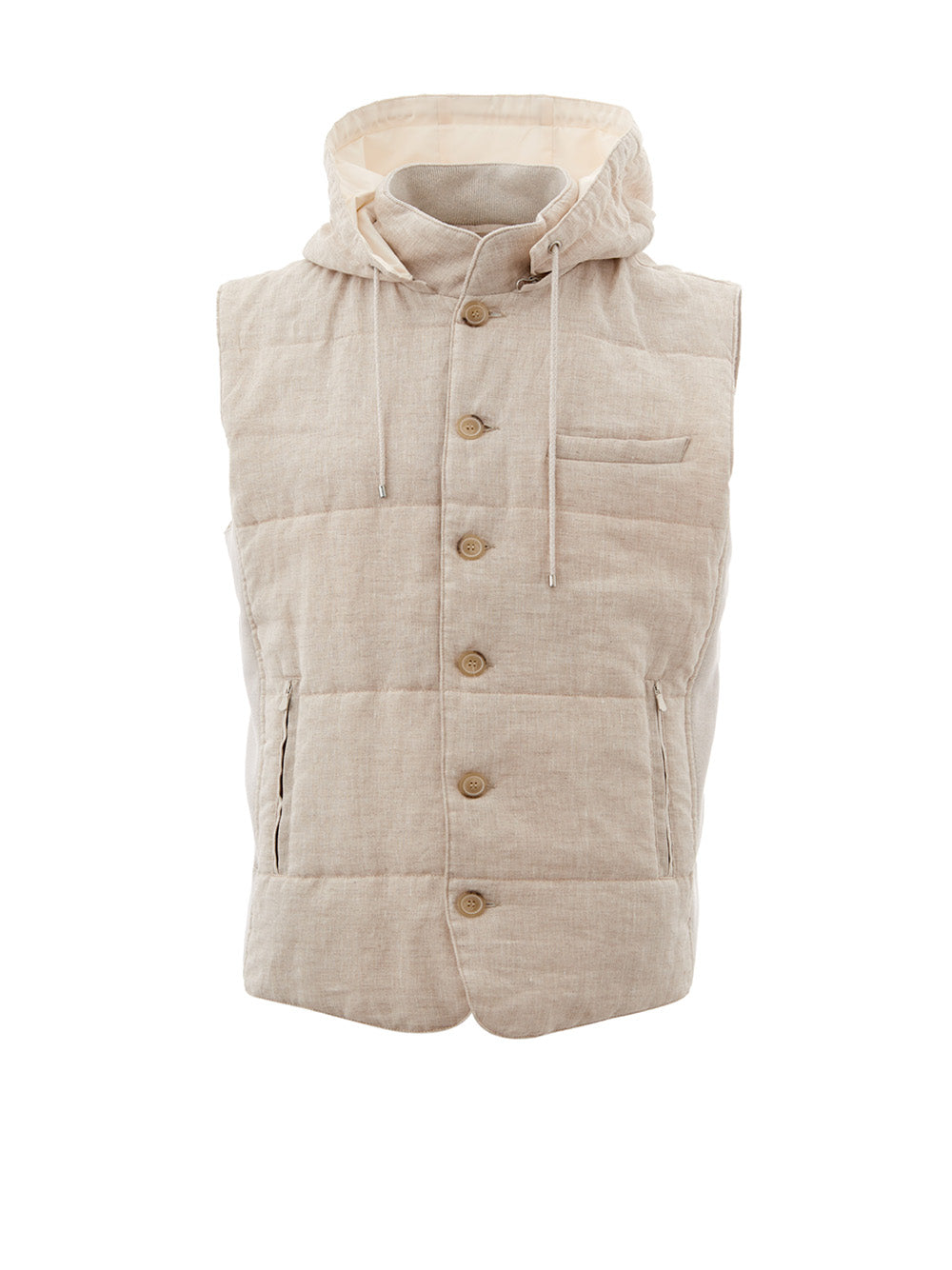 Embrace timeless style with this stunning sleeveless jacket from the esteemed Gran Sasso collection. Expertly crafted in Italy, this beige padded quilted linen vest features a sophisticated front button closure and two handy side zipped pockets. Its unique contrasting fabric side panels add an extra touch of elegance, and the adjustable and removable hood provides versatile styling options. Perfect for layering, this piece offers a regular fit that promises both comfort and fashion.