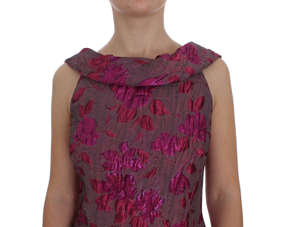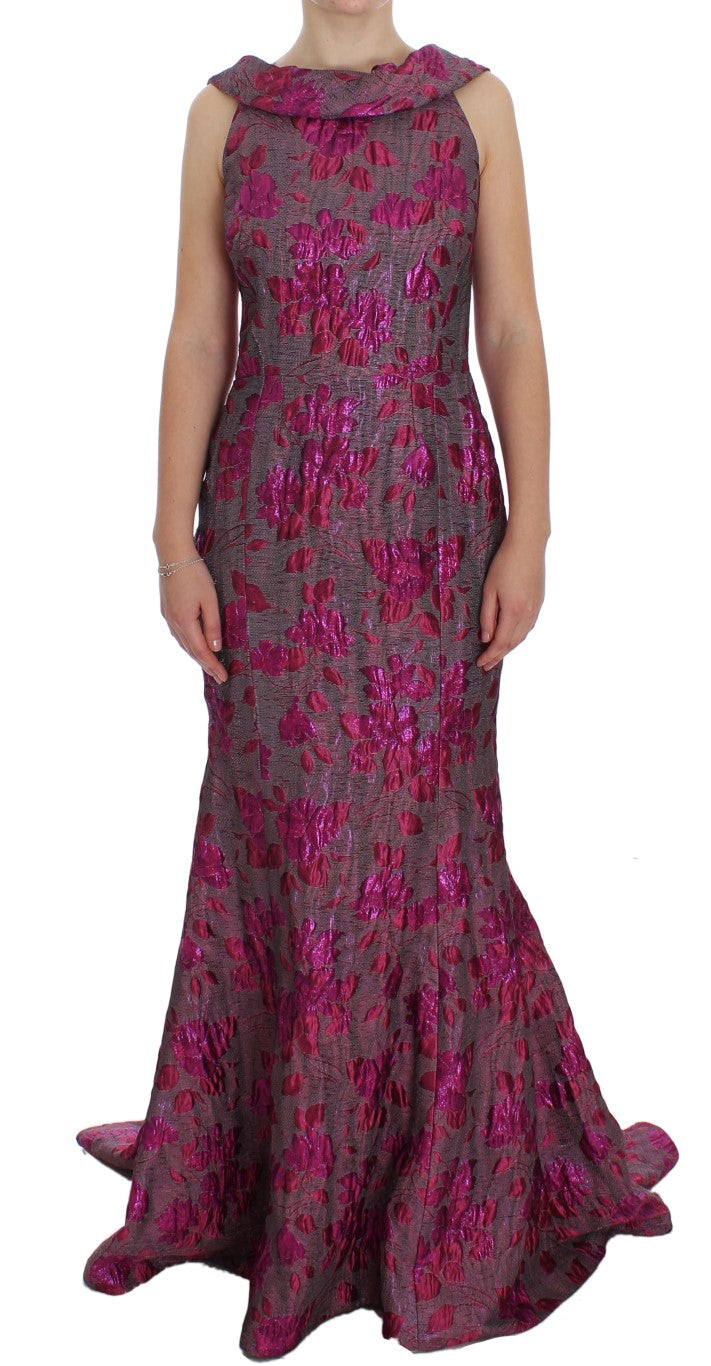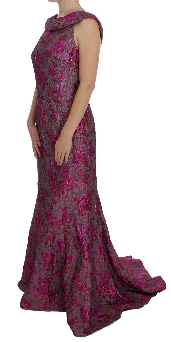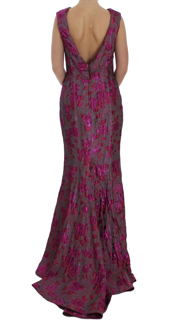 Enchant the evening with this breathtaking full-length pink floral brocade gown by Dolce & Gabbana. Elegantly crafted, this gorgeous piece is a testament to classic style and sophistication. Perfect for making a statuesque impression at any upscale event. The dress features a sheath silhouette, complemented by a luxurious silk stretch inner lining for that seamless fit. A discreet back zipper ensures a sleek contour. Immaculate craftsmanship and attention to detail are embodied in the logo detail, a signature of the Dolce & Gabbana maison.