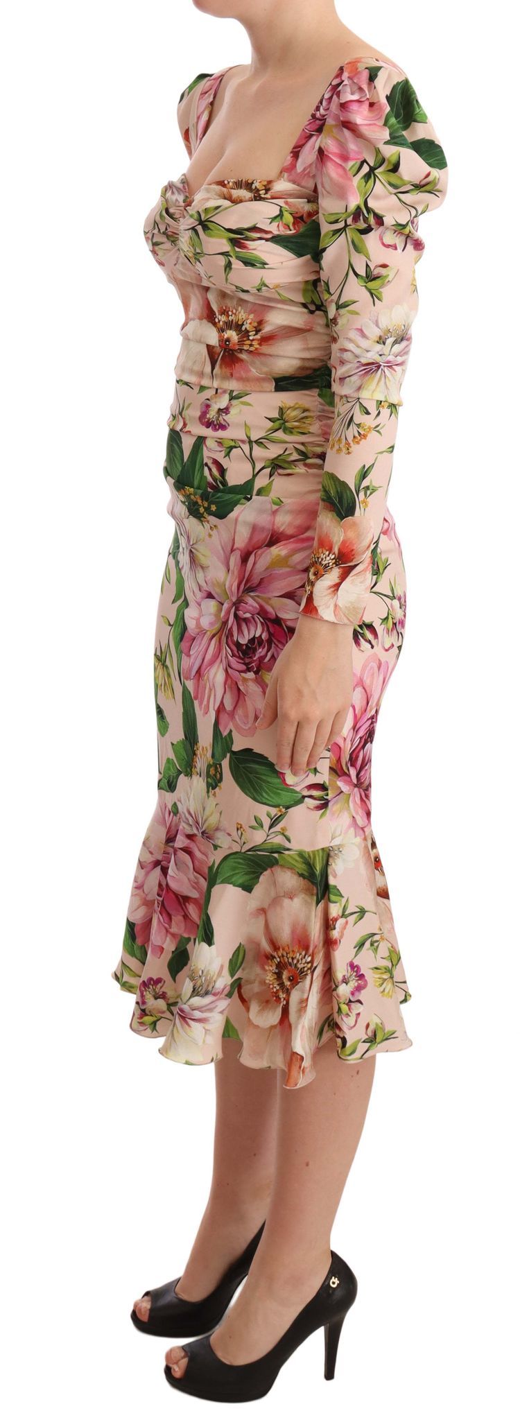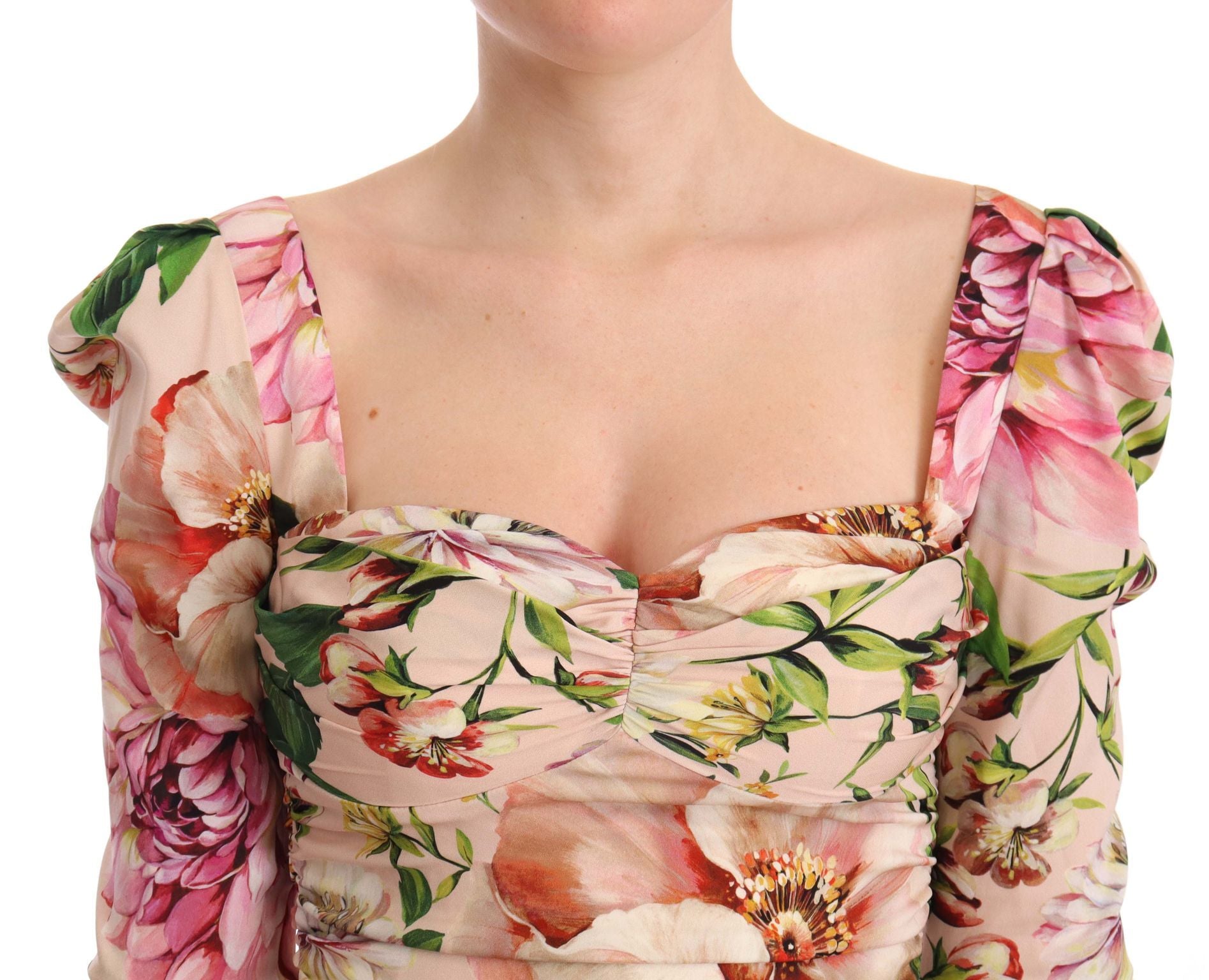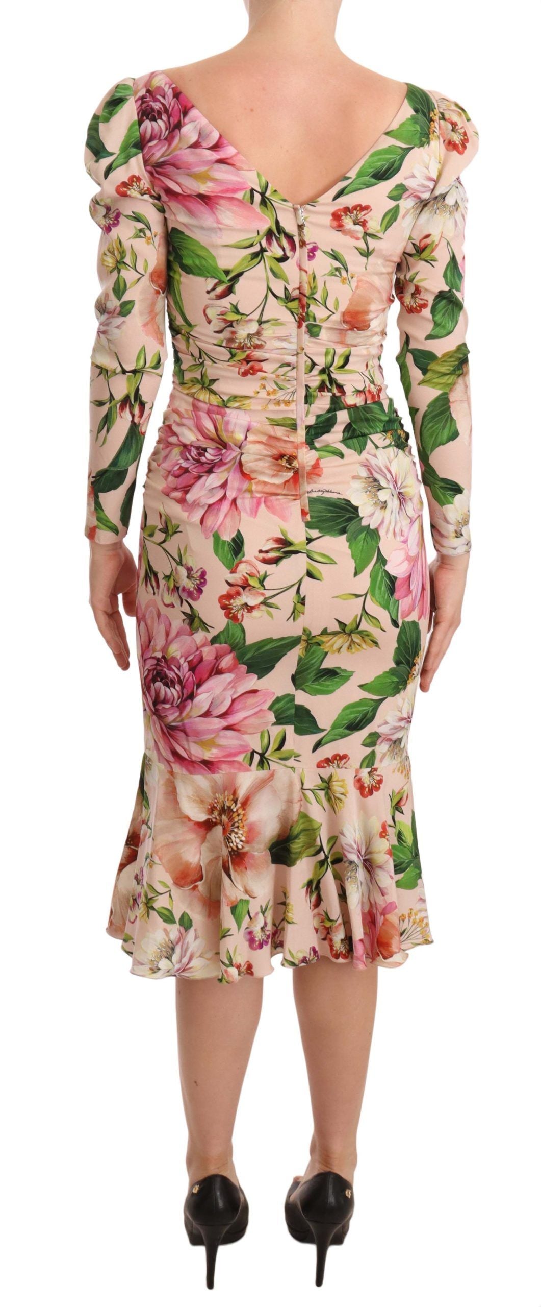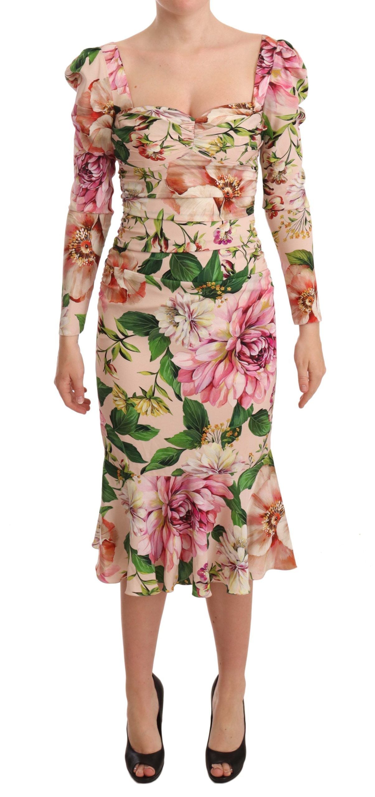 Embrace the essence of spring with this stunning Dolce & Gabbana midi sheath dress, brand new with tags. Adorned with a vibrant multicolour floral print, it showcases a boned bodice with a romantically styled sweetheart neckline. The dress ensures a perfect silhouette with a flattering fit, and the concealed zip closure at the back provides a seamless finish. Crafted in the heart of Italy, this dress is lined with sumptuous pink silk blend that promises a luxurious feel against the skin.