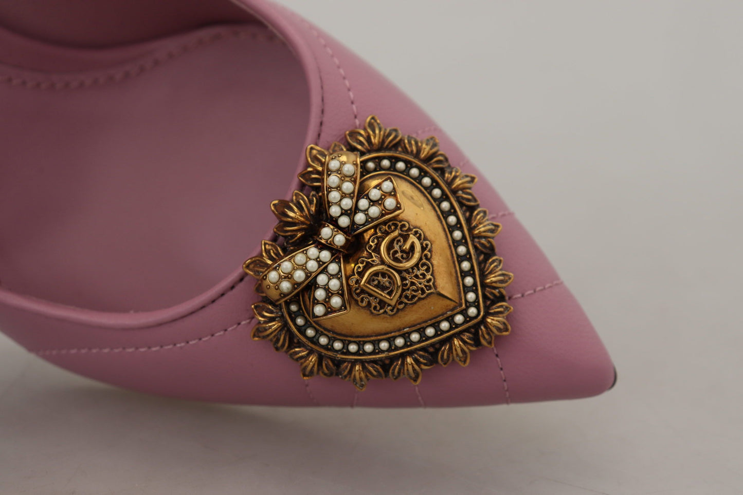 Indulge in the elegance of these gorgeous, 100% Authentic Dolce & Gabbana pink leather heels pumps. Exuding both grace and sophistication, these pumps feature a striking gold devotion heart, adding a touch of opulence to your ensemble. Perfectly crafted with a luxurious leather bottom sole, they boast the renowned logo details. These heels are a testament to exceptional Italian craftsmanship, designed to elevate any look with their romantic hue and sumptuous texture.