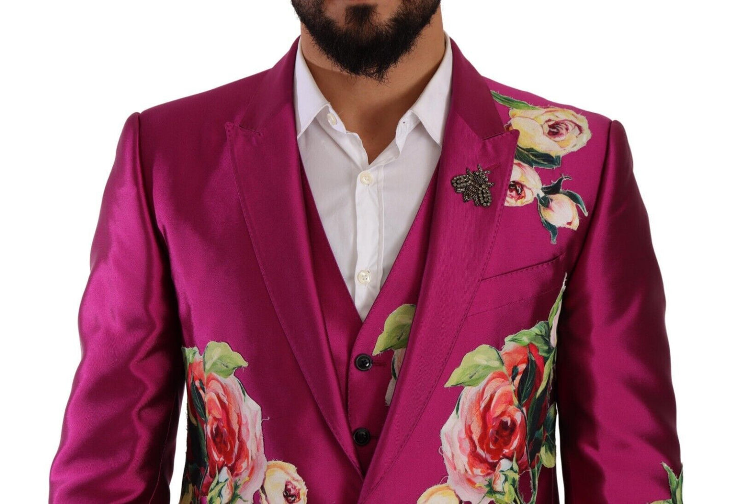 Experience the pinnacle of sophistication with our exquisite Dolce & Gabbana three-piece Martini suit. Meticulously crafted in Italy, this 100% silk suit is a testament to luxury and refined style. The blazer boasts a peak lapel, chest pocket, side flap pockets, button cuffs, and a slim-fit silhouette for that perfect tailored look. Accompanied by a stylish vest featuring a full button closure and adjustable strap back, and trousers with a mid rise fit, side pockets, and a seamless 3-way zipper closure. The pink hue complemented by a graceful floral theme adds an air of opulence, making this suit an absolute must-have for any gala, wedding or high-profile event.