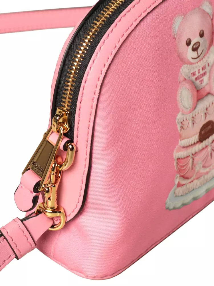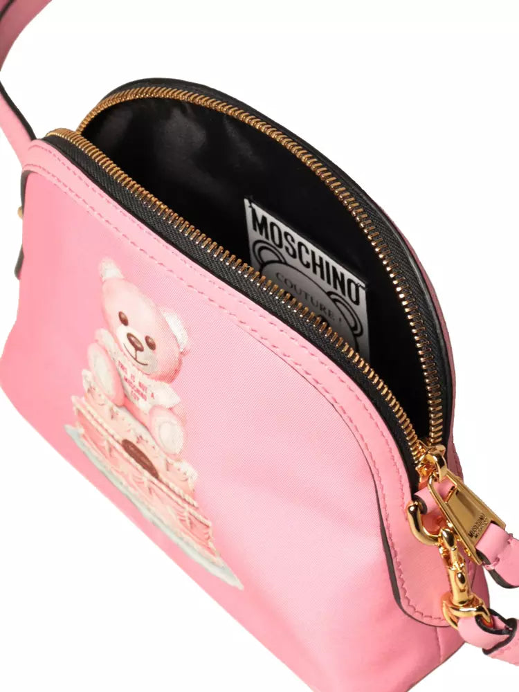 Indulge in the playful elegance of Moschino Couture with this delightful Teddy bear and cake print clutch. Crafted from a durable nylon blend, this bag features a convenient zip opening and a chic removable shoulder strap made of premium pink calfskin, perfect for a versatile style. Its compact dimensions make it a fabulous companion for your essentials. Expertly made in Italy, it embodies both fashion and function.