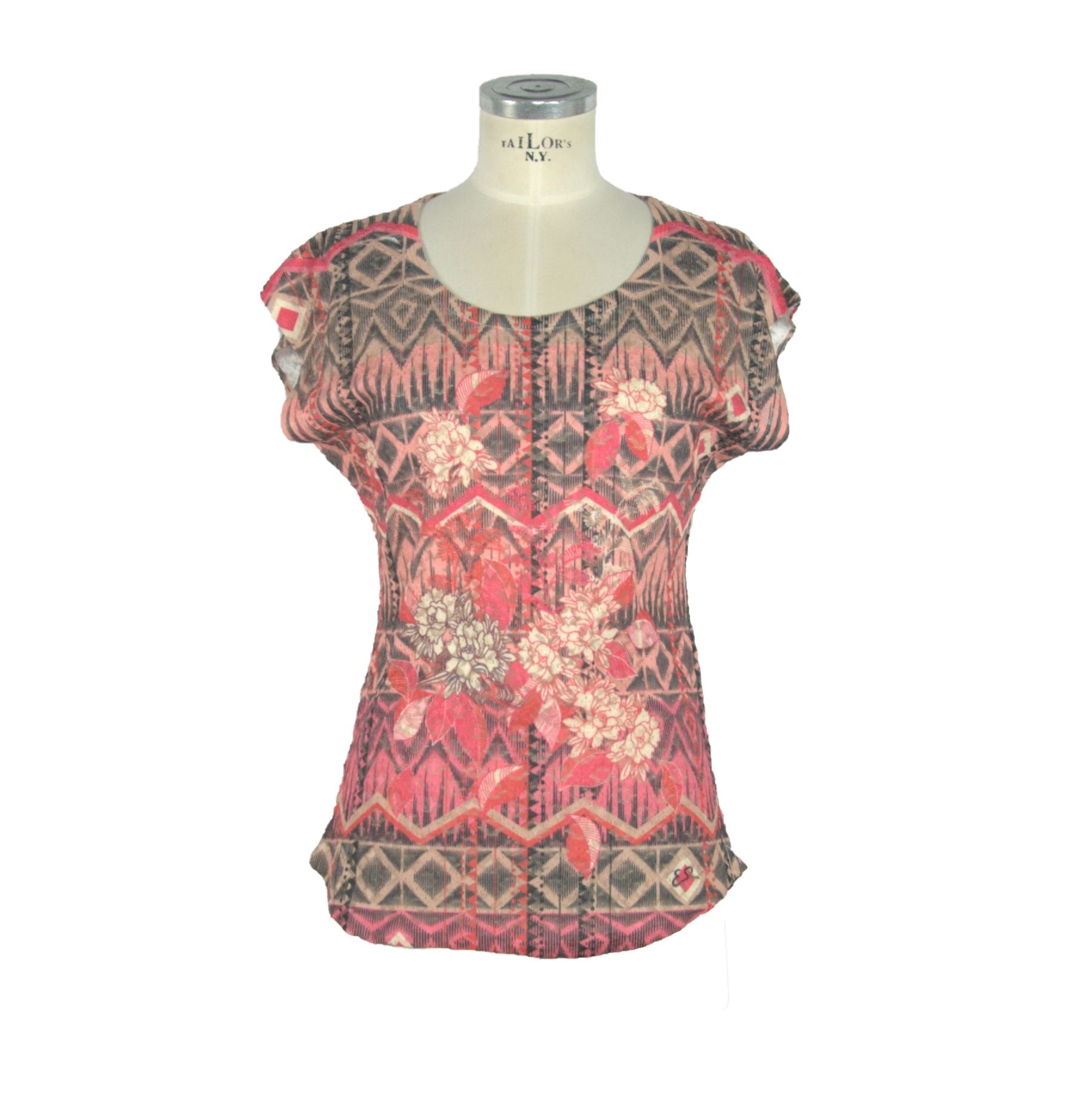 Elevate your casual wardrobe with this breezy and stylish pink t-shirt, perfect for those who cherish a blend of comfort and charm. Designed with a flattering boat neckline and airy short kimono sleeves, this top is crafted from a light, micro-perforated polyester yarn. Adorned with an eye-catching fantasy print applied through a sublimation process, it ensures a high-quality design that lasts. Made with attention to detail, this tee is a testament to effortless fashion. Pair it with your favorite jeans or skirt for a polished look.