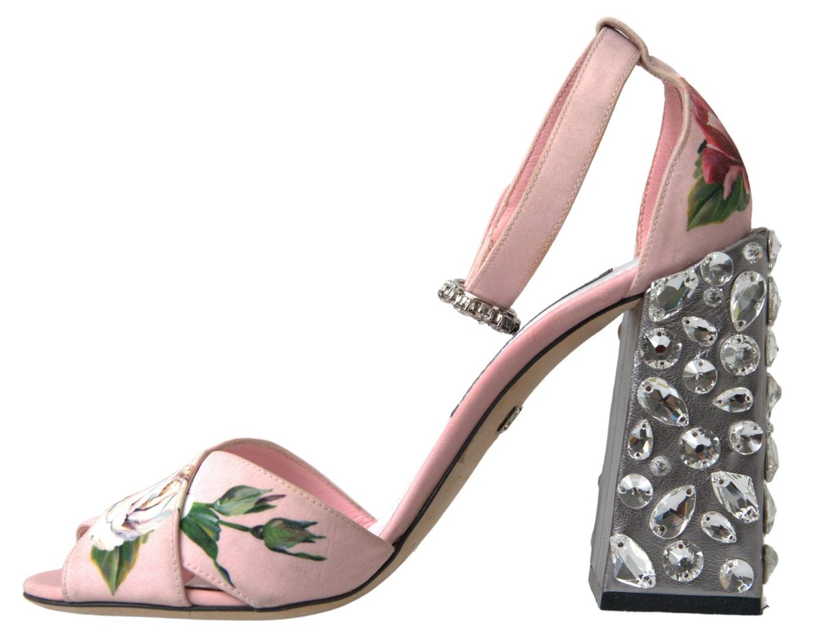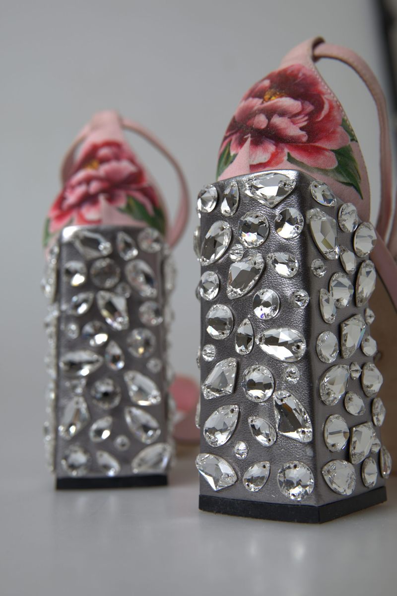 Step into spring with elegance in these Dolce & Gabbana slingback sandals adorned with a bejeweled block heel that adds a sparkle to your every step. Perfect for any sophisticated occasion, these luxurious leather sandals merge the vibrancy of a floral print with the chic allure of pink, promising to elevate your ensemble with their unmistakable charm and unmatched craftsmanship, all while embracing your feet in comfort and style.