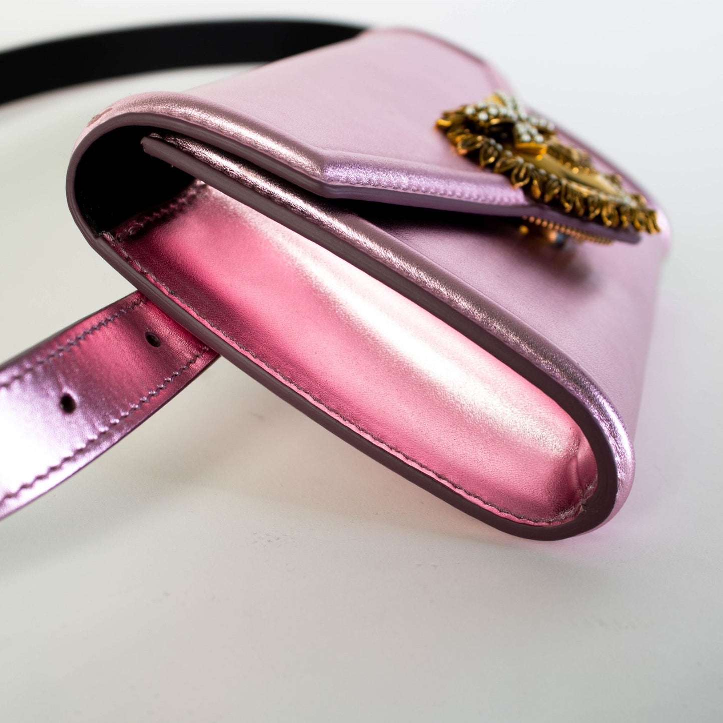 Discover the epitome of evening elegance with our stunning satin clutch. This gorgeous accessory, bedecked with a captivating jewel heart closure, comes directly from the highly-coveted Dolce & Gabbana collection. Perfect for a sophisticated night out, this pink bag exudes a romantic devotion with every detail, from its sleek design to the luxurious leather construction. Made in Italy, it promises not only impeccable style but also unmatched quality and craftsmanship.