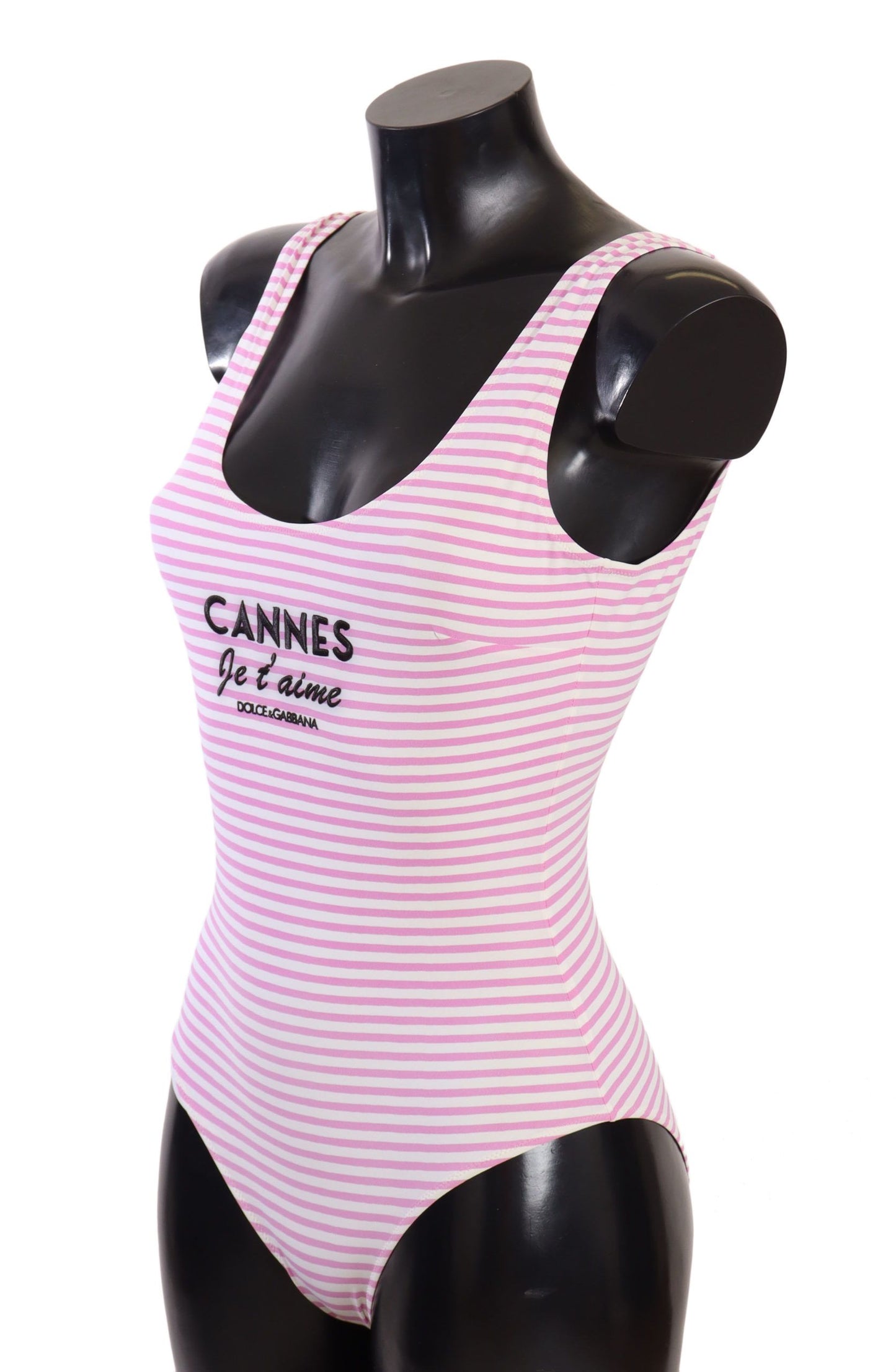 Experience the epitome of Italian elegance with this stunning Dolce & Gabbana one-piece swimsuit. Adorned with a chic stripe pattern and a captivating Cannes print, it’s the perfect blend of style and comfort for your luxurious beach getaways.