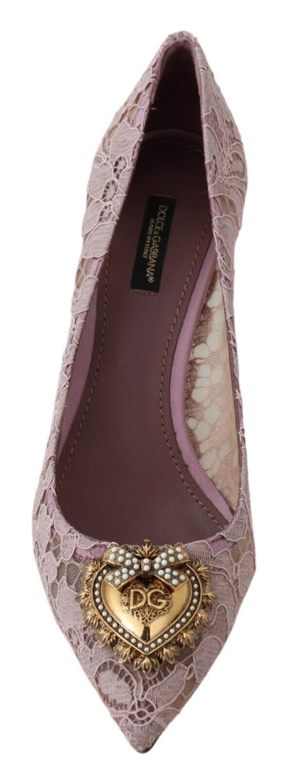 Step into luxury with these Elegant Pink Lace Heels, a testament to the refined craftsmanship of Dolce & Gabbana. These brand-new heels feature a heart devotion embellishment that adds a touch of romance to your ensemble. Crafted with a leather bottom sole for superior comfort and durability, these pumps are a perfect blend of beauty and utility. Logo details are subtly placed, showcasing the iconic brand’s touch. Make these made-in-Italy heels a glamorous addition to your shoe collection.