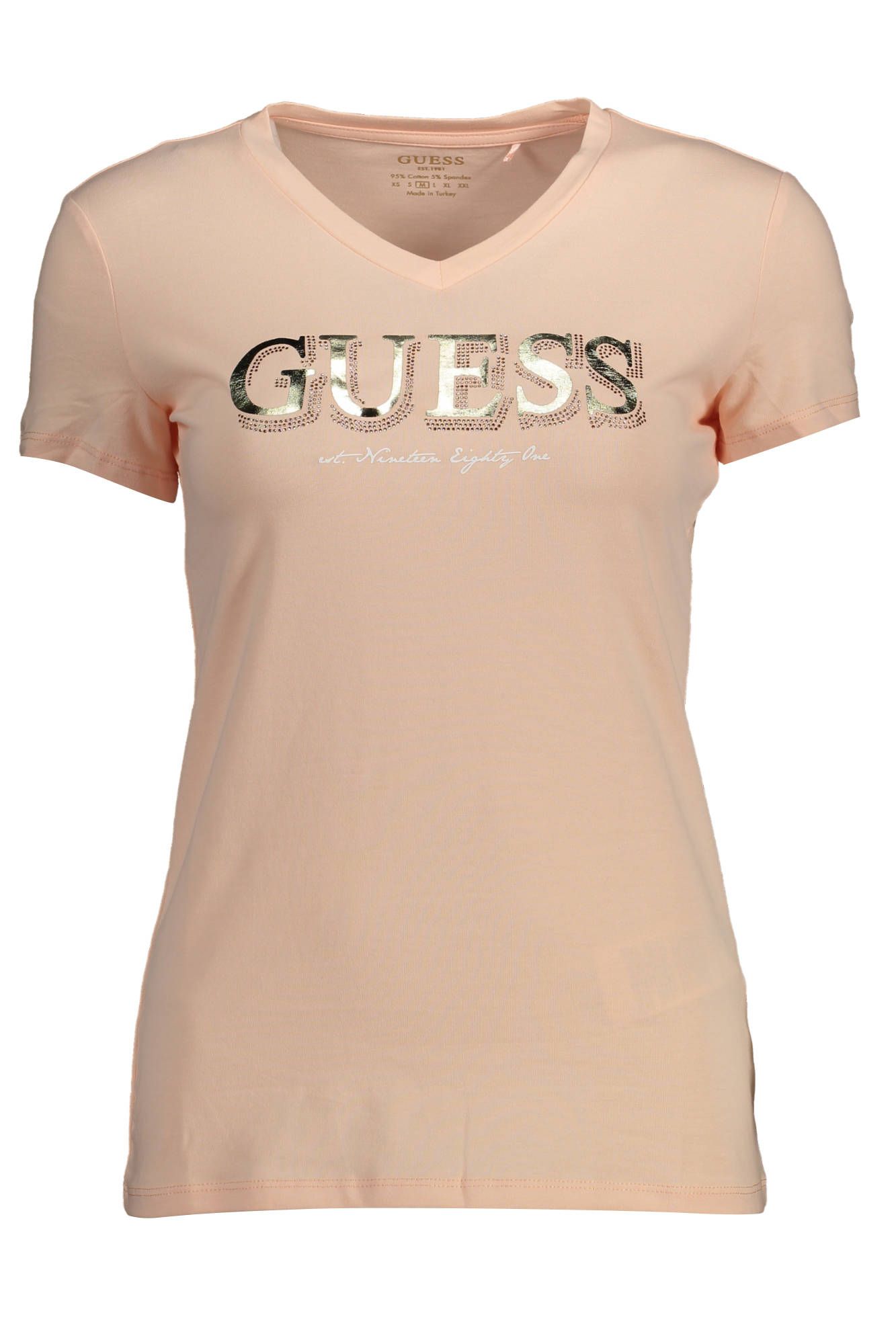 Exude casual elegance in this stunning short-sleeved tee from Guess Jeans. Designed with a flattering ‘V’ neckline, this top is accentuated with a dazzling iridescent application and shimmering rhinestones, topped off with a distinct Guess Jeans logo print for an added touch of luxe. It’s a versatile piece that pairs effortlessly with your favorite denim or skirts for a glamorous daytime look.
