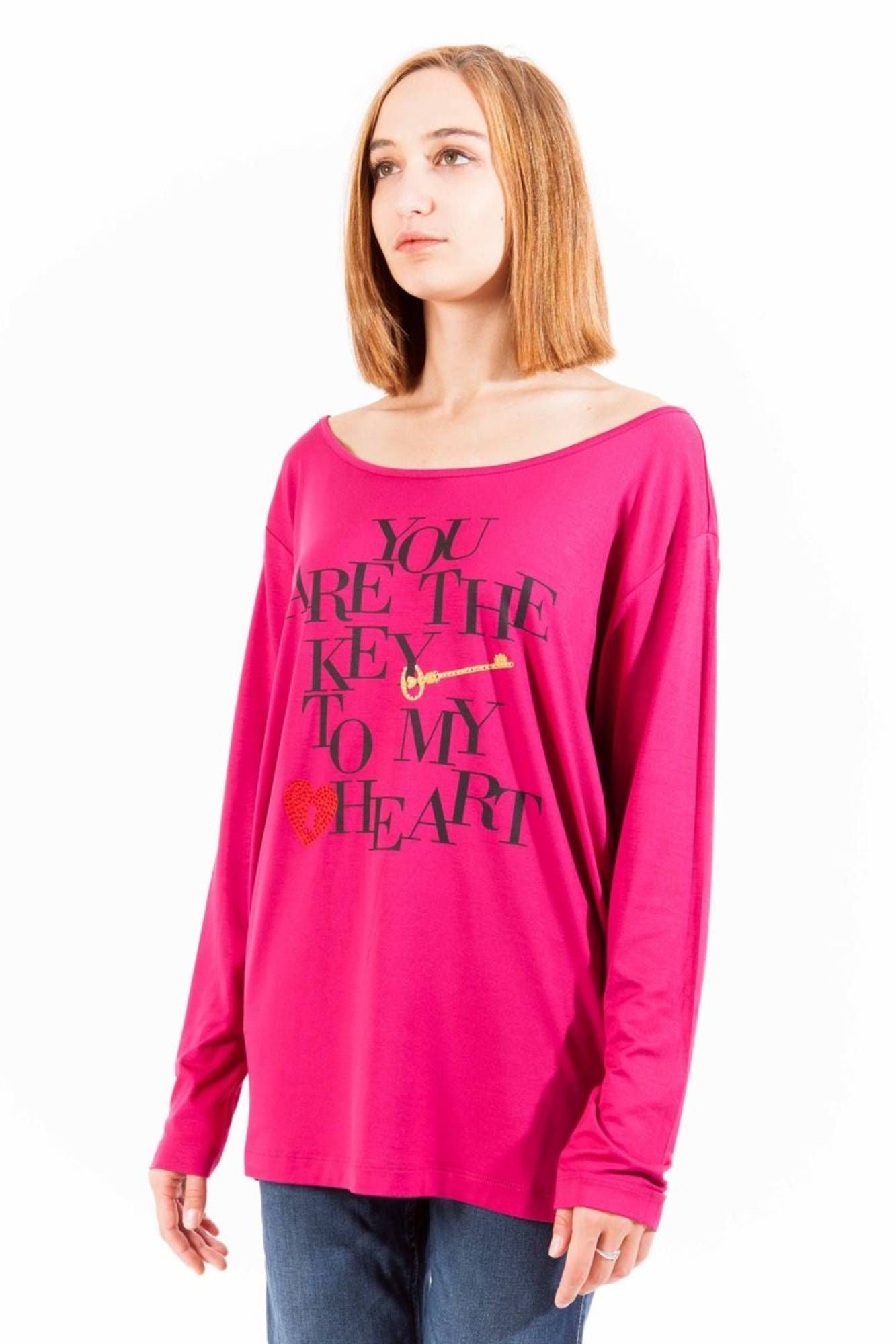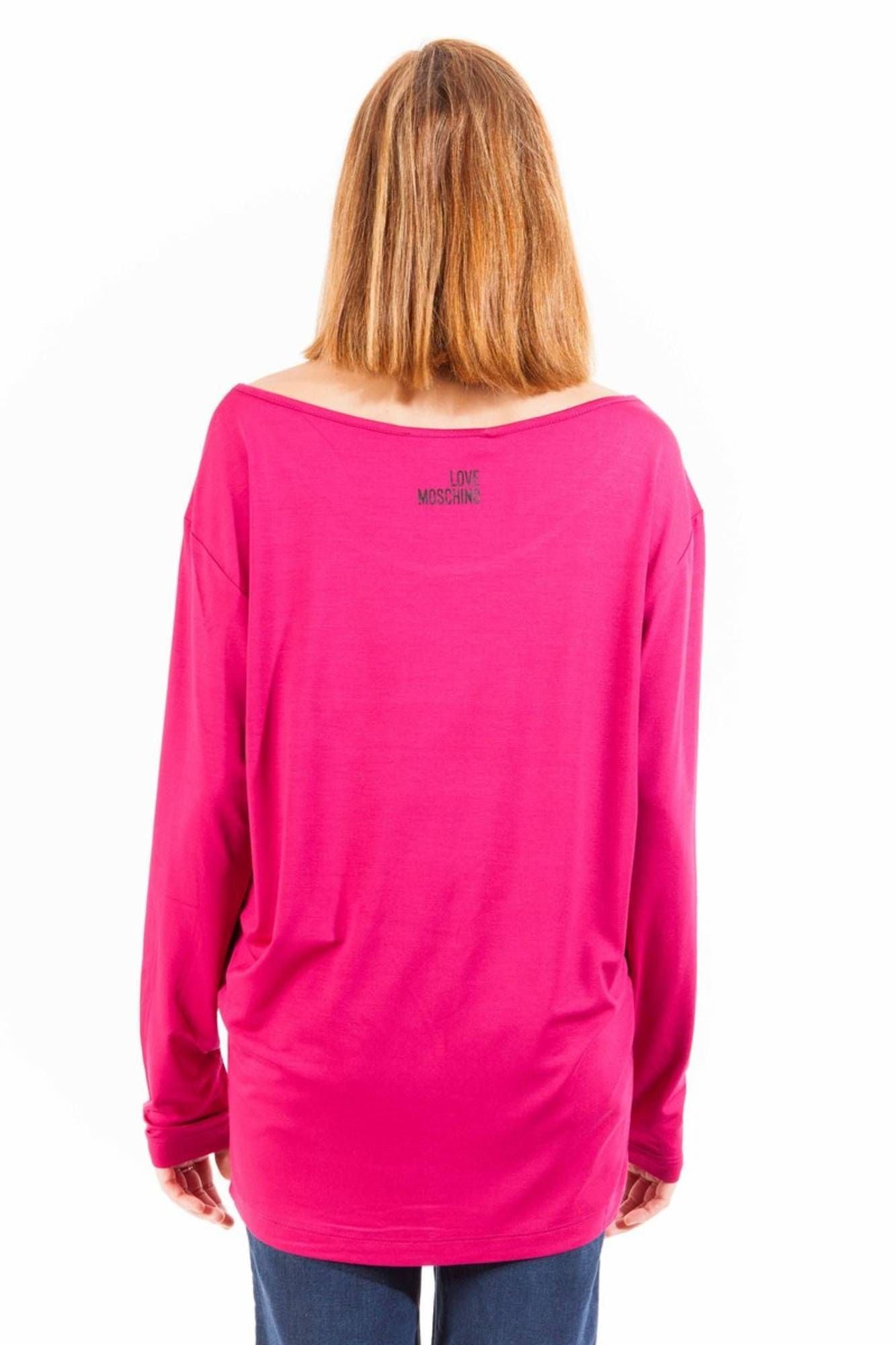 Embrace casual elegance with this chic pink long sleeve t-shirt from Love Moschino. Featuring a fashionable wide neckline and adorned with a striking logo print, this top adds a splash of playfulness to any wardrobe. Crafted from soft cotton, it ensures comfort and style for any occasion.
