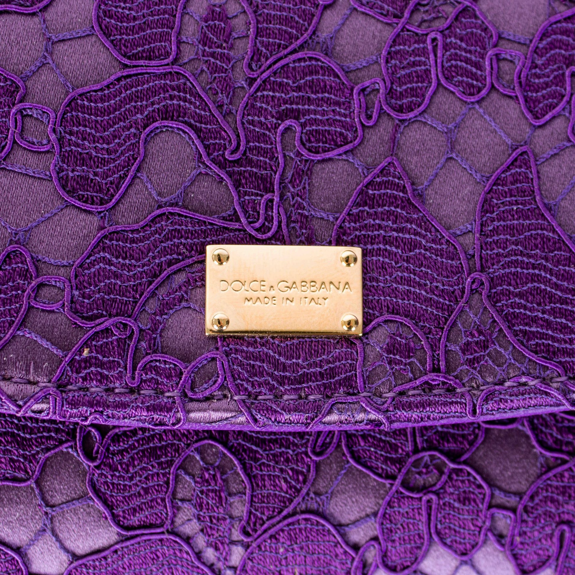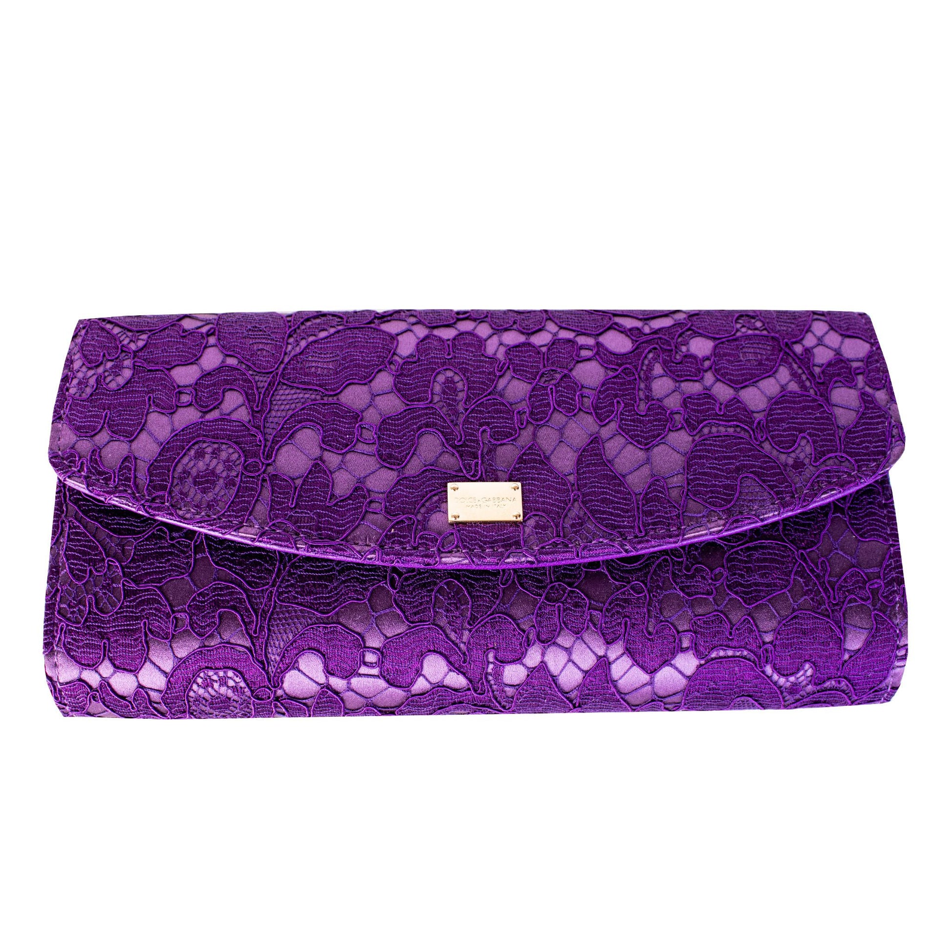 Discover the epitome of evening elegance with this stunning purple lace clutch bag, presented by the exquisite Dolce & Gabbana. This brand new item comes with original tags, offering an authentic touch of luxury. Featuring a delicate lace overlay contrasted with sumptuous leather, it includes a handy removable strap for versatile wear. A discreet gold plaque logo embellishes the front, adding a dash of opulence. Its secure closure is complemented by an internal pocket for your essentials. Proudly made in Italy, it encapsulates both style and functionality in a compact design.