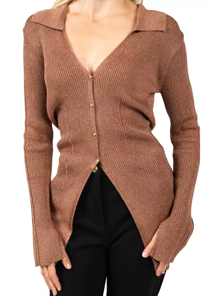 Elevate your knitwear collection with this luxurious ribbed V-neck sweater, crafted from a sumptuous viscose blend, and enriched with dazzling lurex inserts. This sophisticated piece is fastened with elegant metal buttons, adding a touch of Italian glamour to your everyday ensemble.