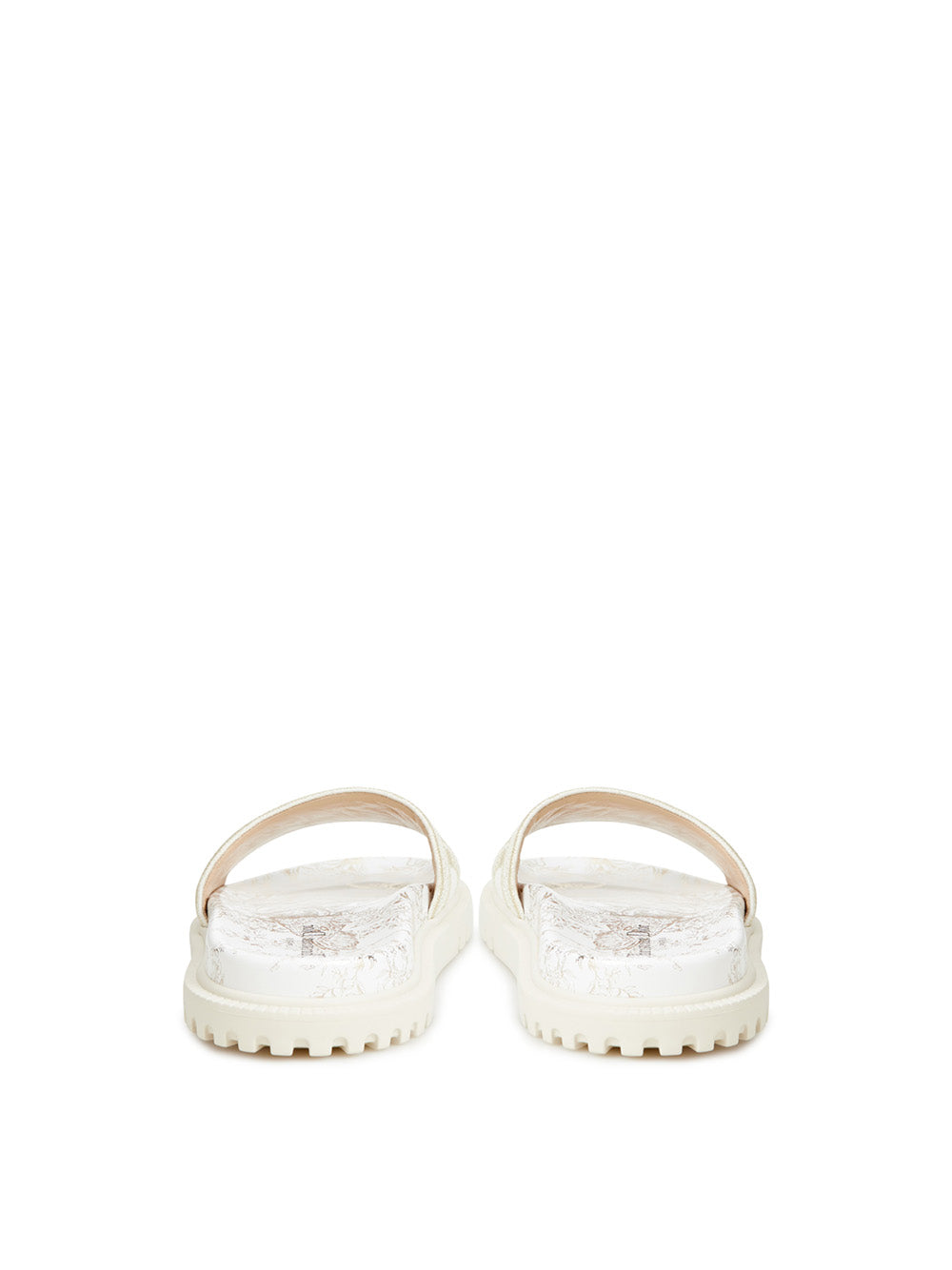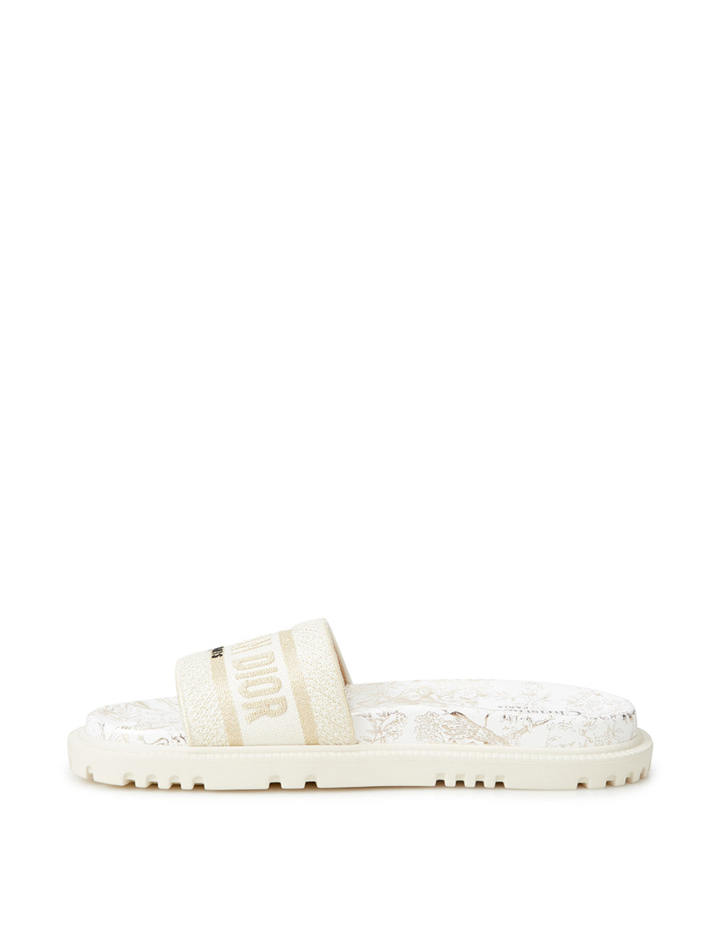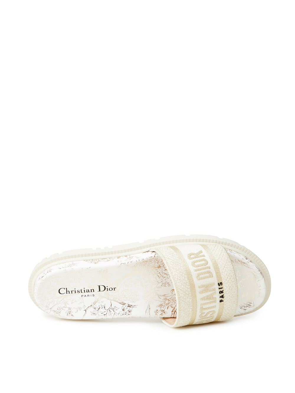 Gorgeous brand-new with tags, 100% Authentic Dior slippers that embody casual elegance with a refined touch. These ivory Dior Dway slippers feature a beautifully embroidered band showcasing the iconic logo, paired with an internal sole adorned with a striking gold/ivory print. Crafted with precision in Italy, they promise a regular fit for utmost comfort. Perfect for lounging in style or elevating your casual ensemble.