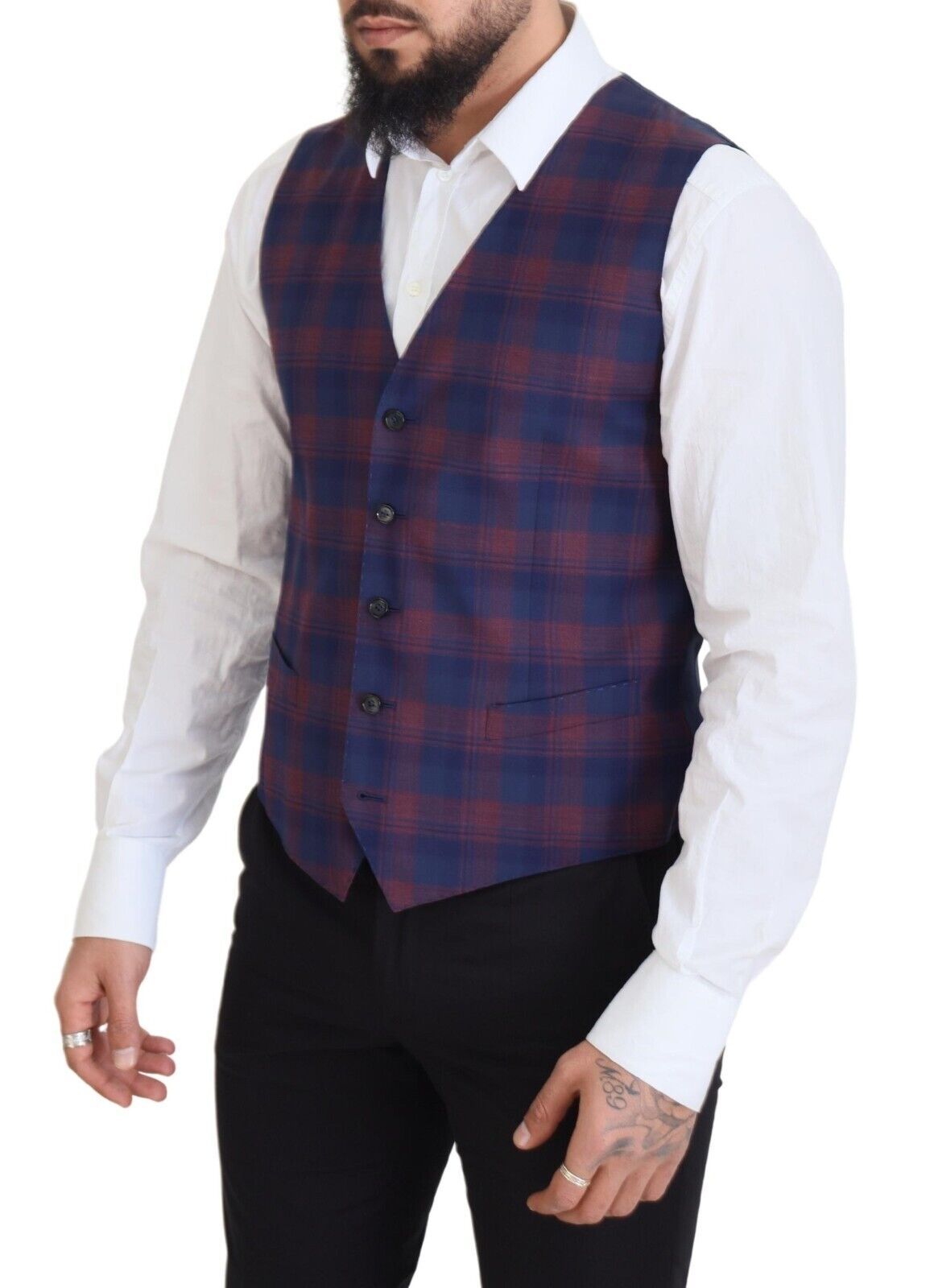 Dressing to impress has never been easier with this stunning, authentic two-piece suit by Dolce & Gabbana. This single-breasted blazer and matching vest come in a rich purple hue, perfect for adding a pop of color to your wardrobe. Crafted in Italy with the finest materials, the set features a sleek two-button closure blazer with peak lapels. The vest boasts a full button closure and an adjustable strap for a customizable fit. Silk and viscose line the interior, offering an additional touch of luxury and comfort.
