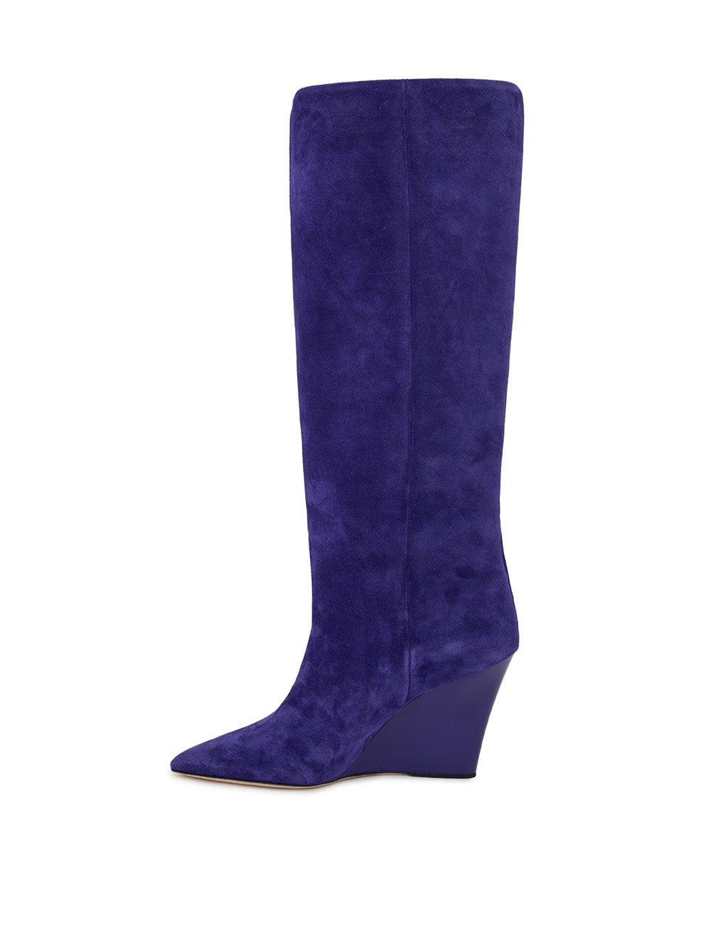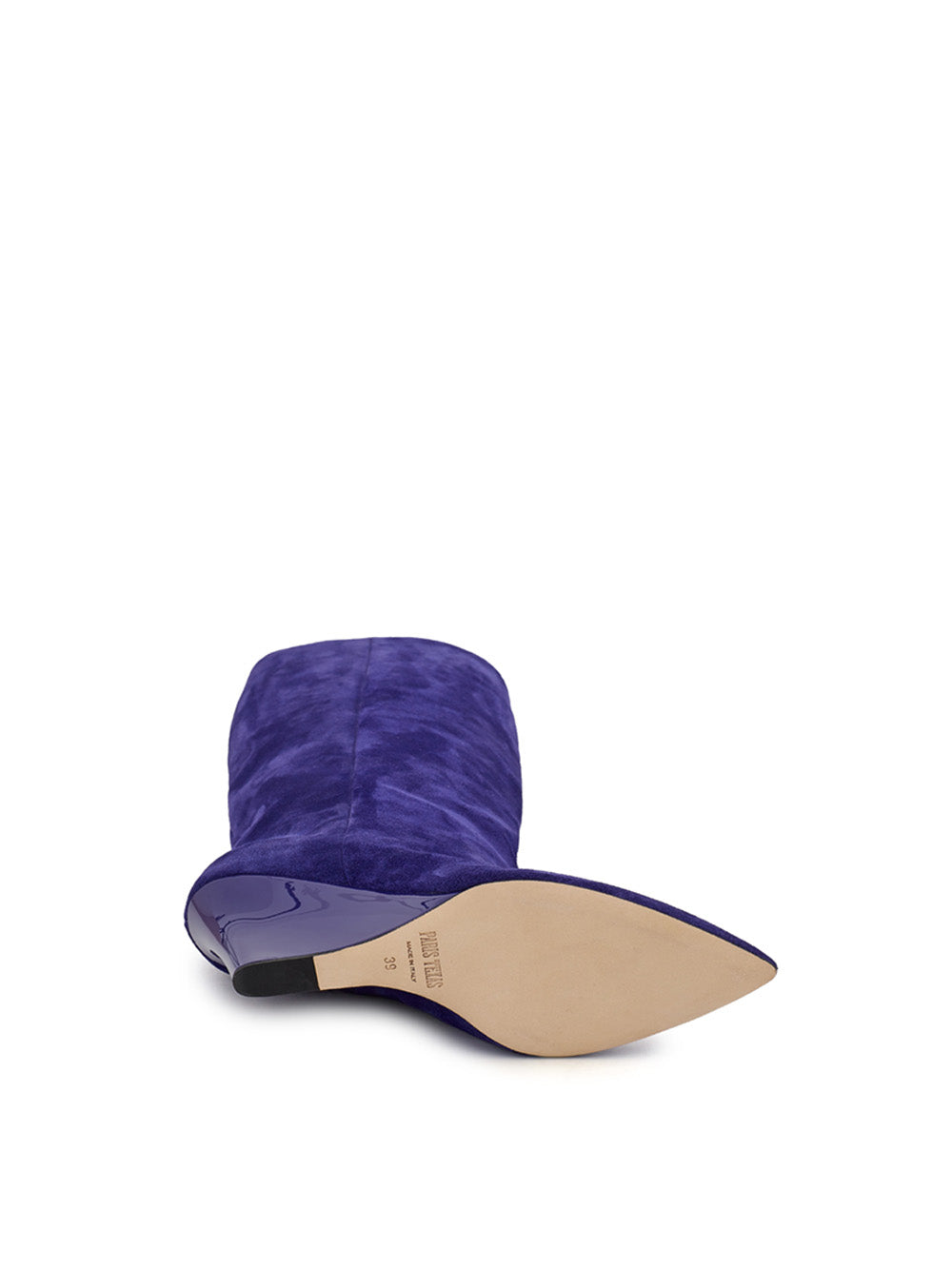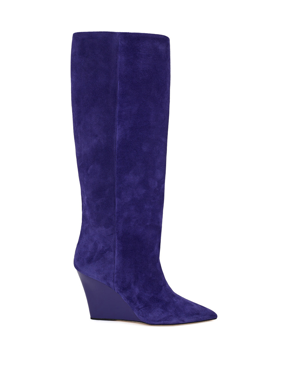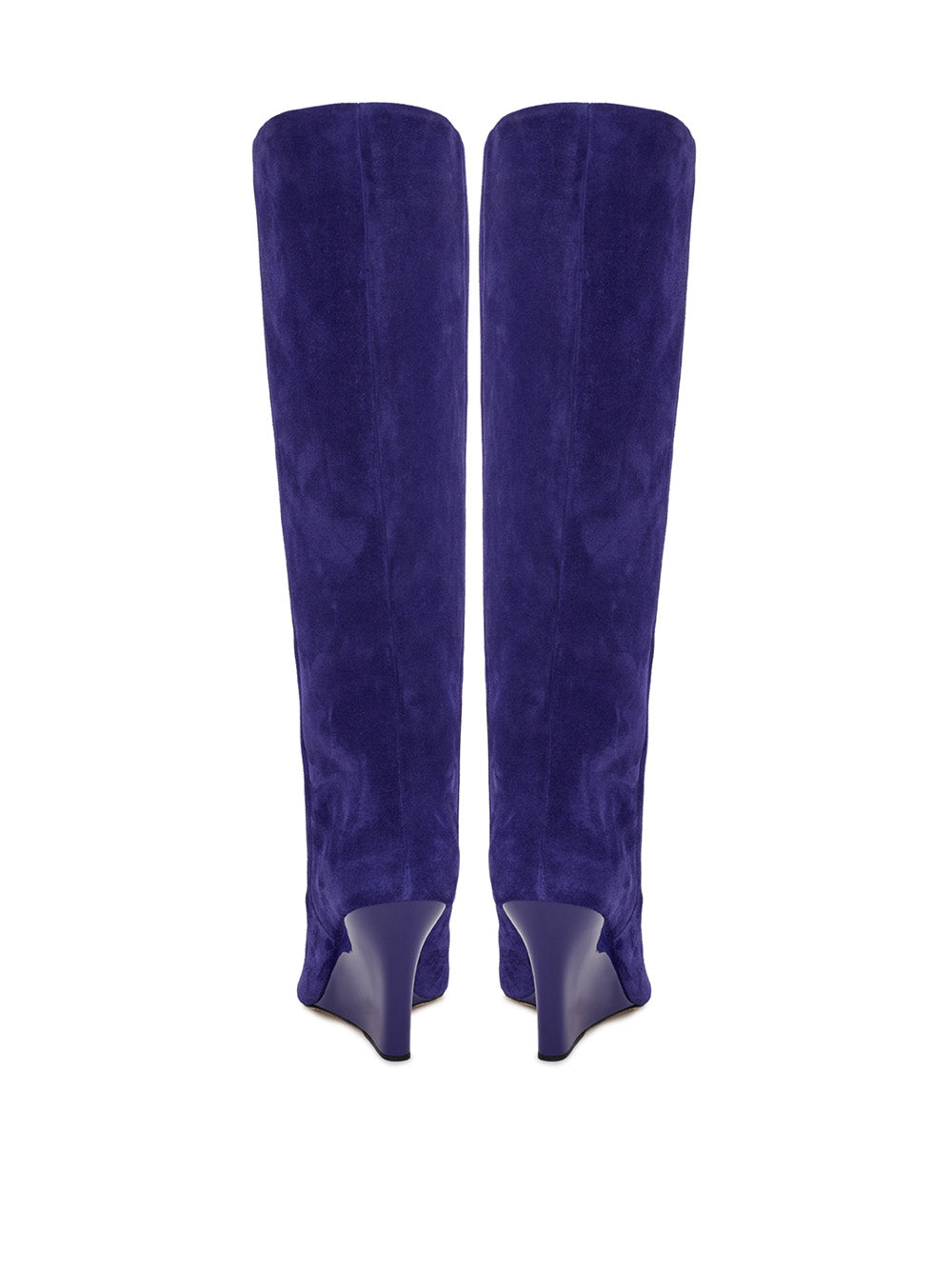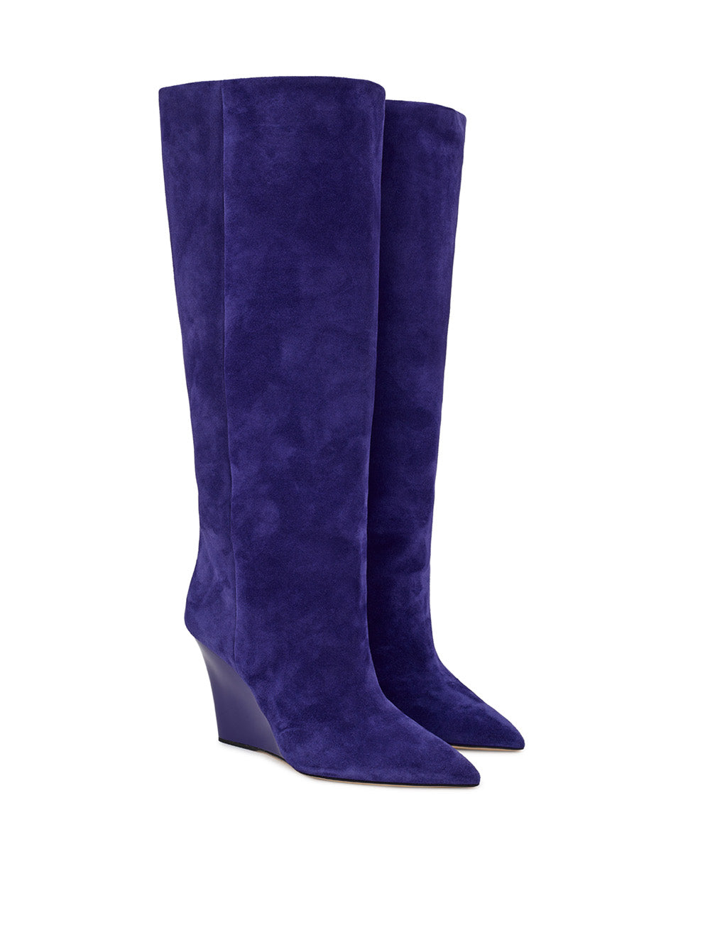 Step into luxurious style with these exquisite velvet knee-high boots by Paris Texas, crafted for the fashion-forward individual. The captivating purple hue combined with the elegant wedge heel ensures a standout look, perfect for elevating any outfit. Experience the fusion of plush comfort and Italian craftsmanship with these must-have boots.