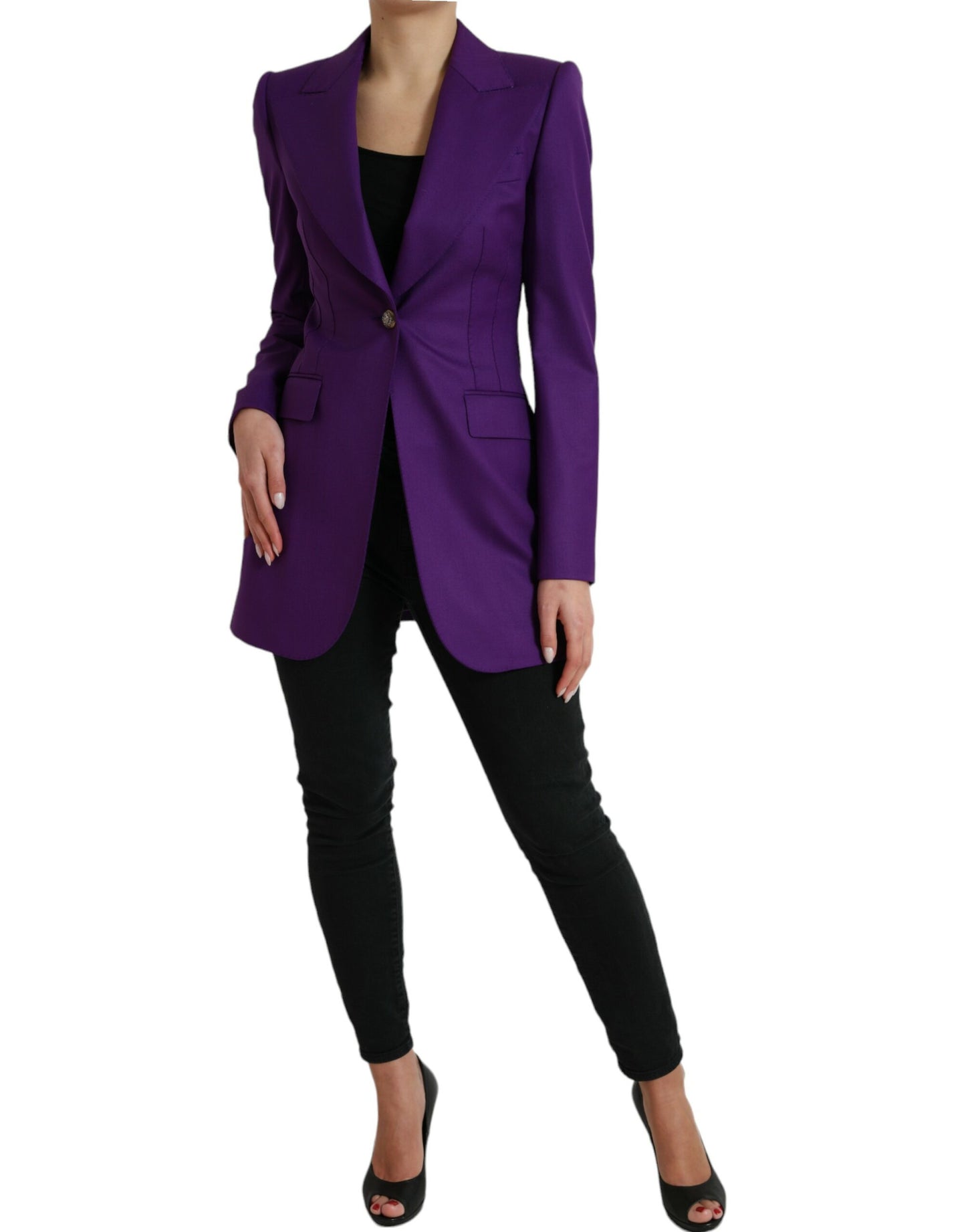 Gorgeous brand new with tags, 100% Authentic Dolce & Gabbana single-breasted blazer with wide, peaked lapels and flap pockets, made from smooth wool.