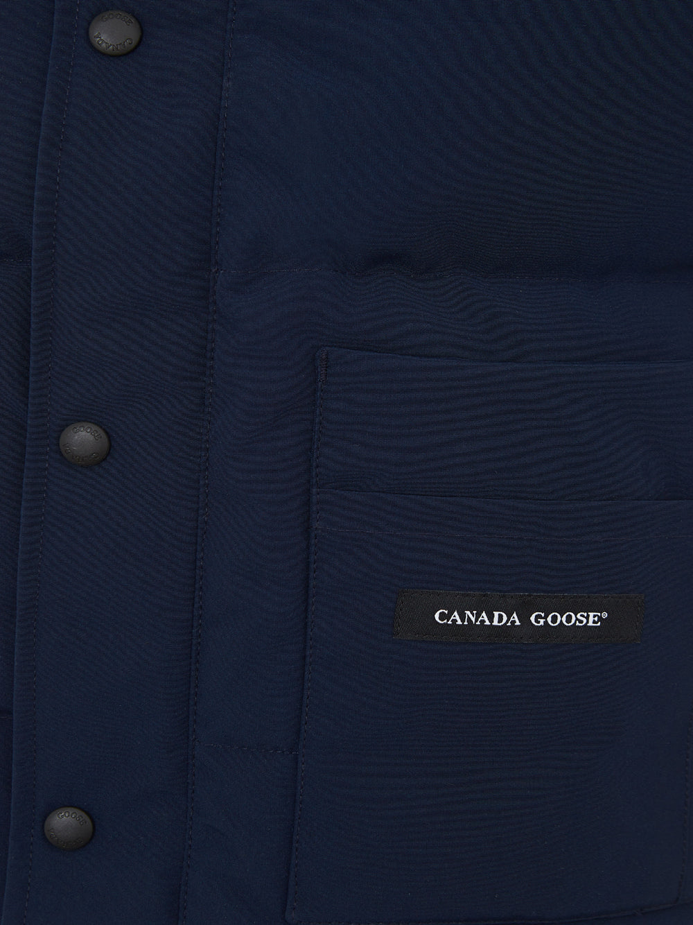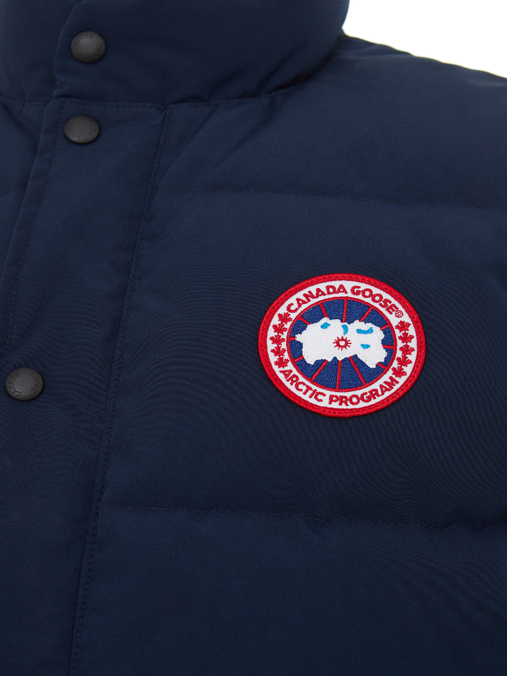 The iconic Canada Goose patch logo is subtly placed on the side, signifying the brand’s commitment to quality. Beyond its alluring exterior, the vest is crafted with durability in mind, featuring an inner pocket for added practicality and waterproof materials to withstand the elements. This garment embodies the fine craftsmanship for which Canada Goose is renowned, made with precision in Canada.