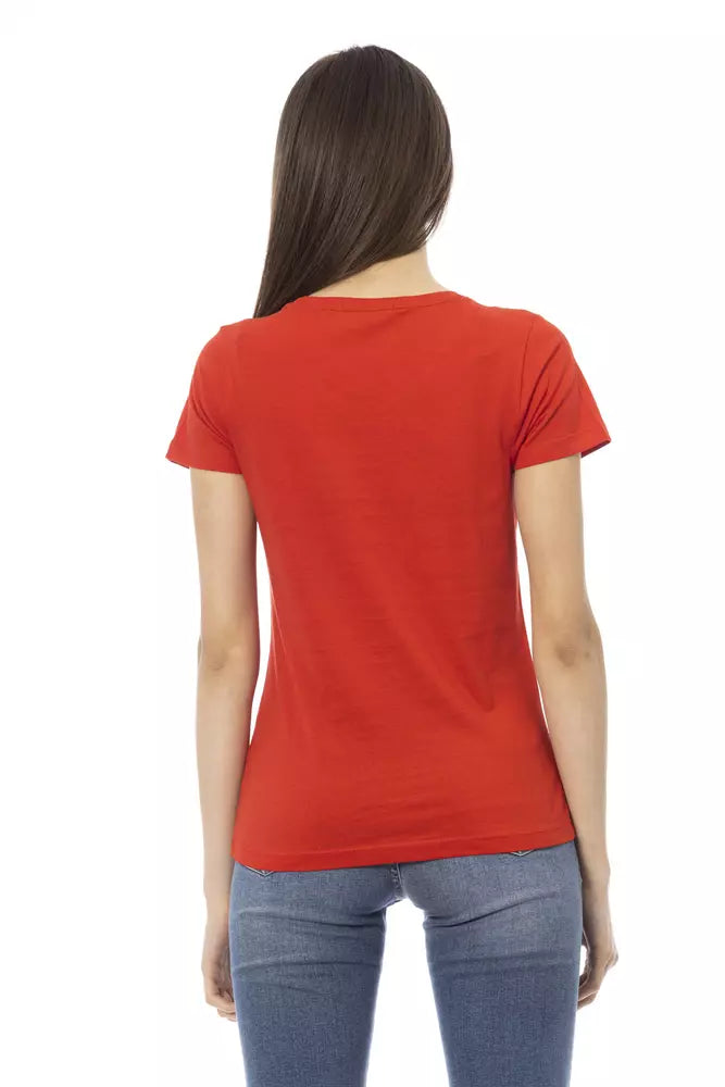 Sophistication meets comfort in this striking red V-neck T-shirt from Trussardi Action. A perfect blend of style and practicality, it boasts a chic front print that is sure to turn heads. Ideal for adding a pop of color to your casual ensembles.