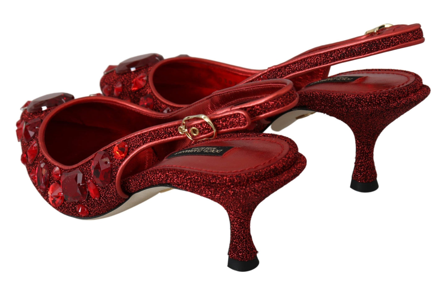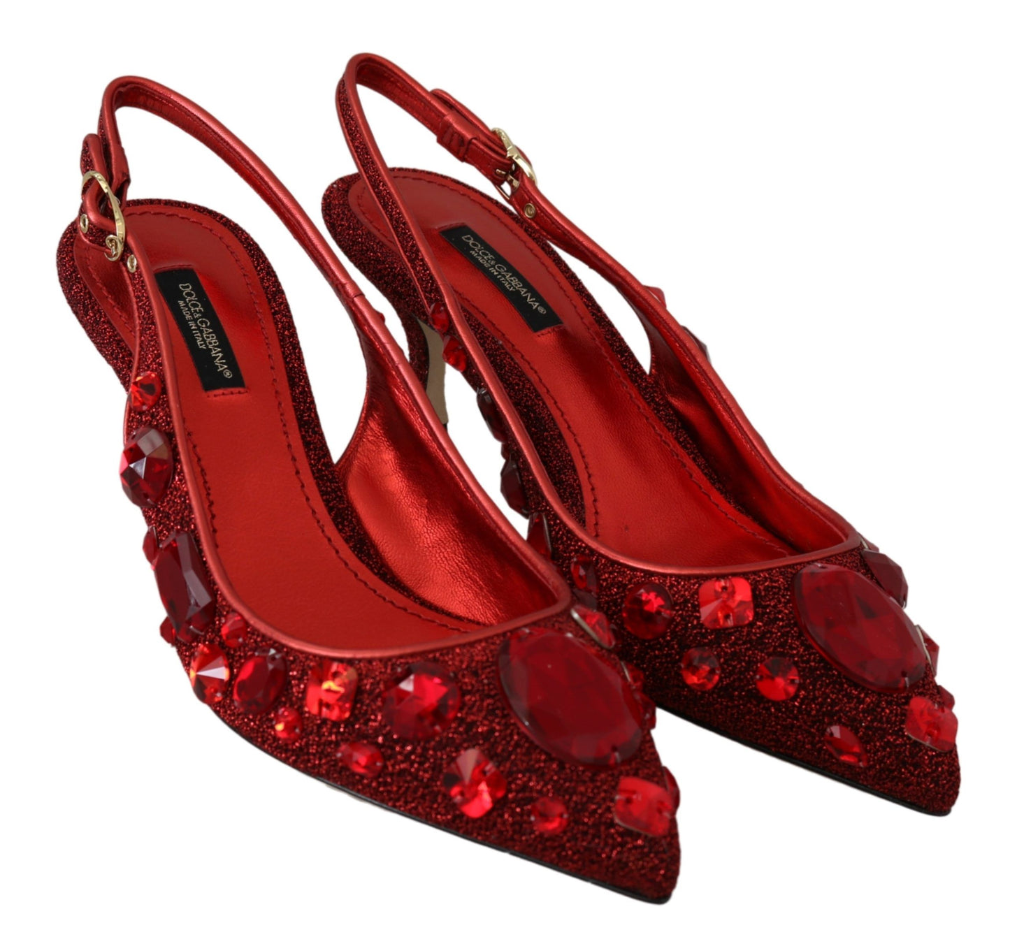 Step into luxury with these exquisite Dolce & Gabbana slingback pumps, perfect for adding a splash of festivity to your collection. Expertly crafted in Italy, these pointed-toe heels sparkle with red crystals set against a vibrant red background, exuding elegance and unparalleled craftsmanship.