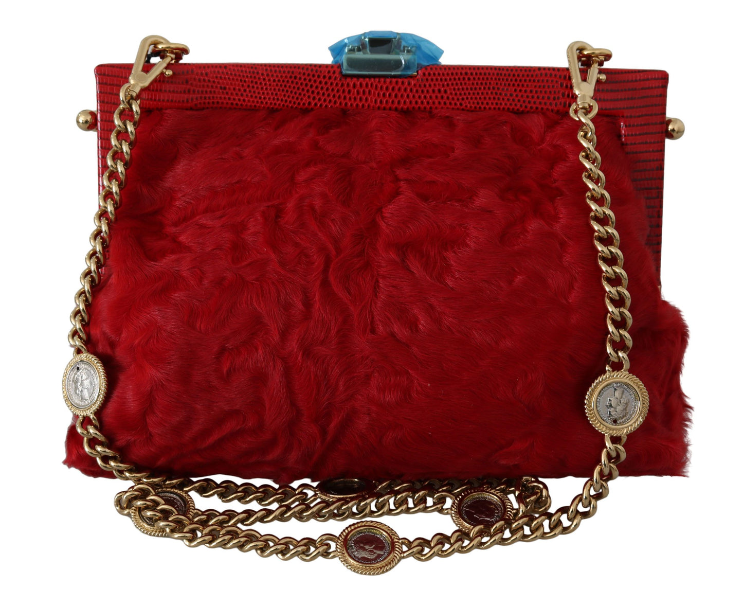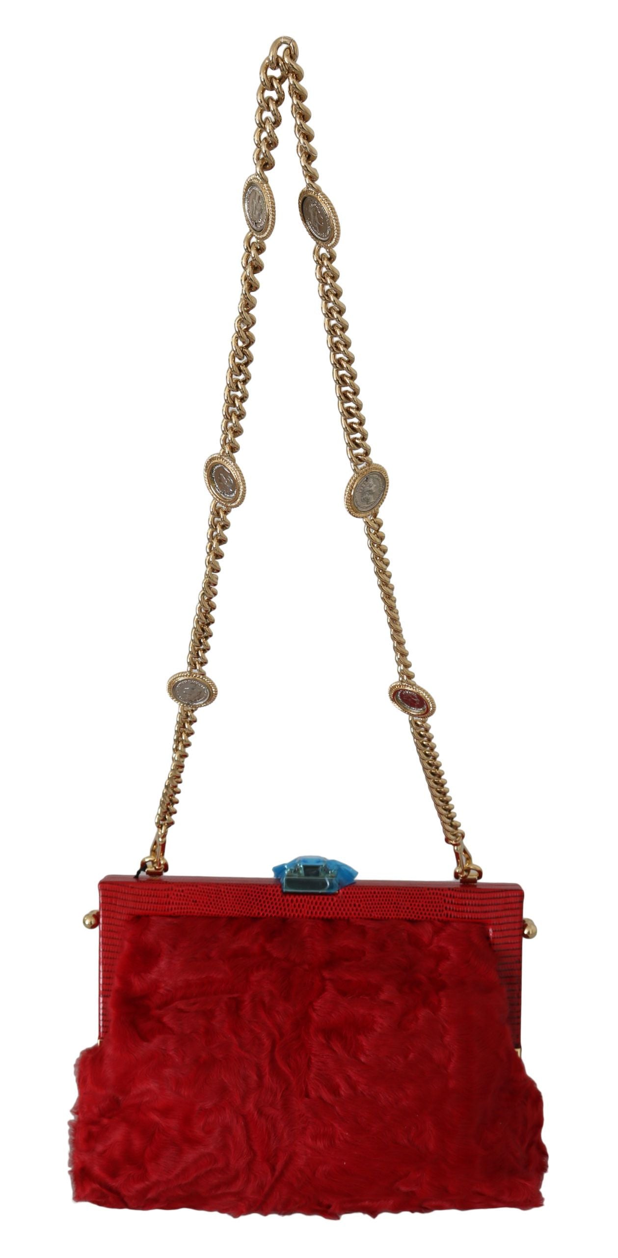 Indulge in the epitome of luxury with this exquisite Dolce & Gabbana shoulder hand clutch, a statement piece that ensures you stand out at any high-end soirée. The eye-catching red fur, adorned with gold baroque and sparkling crystals, effortlessly elevates your evening ensemble. Inside, the clutch features a refined red silk lining, and comes complete with a detachable gold metal chain, providing versatile carry options. The elegant clap closure and distinct logo details fuse functionality with Italian craftsmanship, making this VANDA bag an icon of sophistication and style.