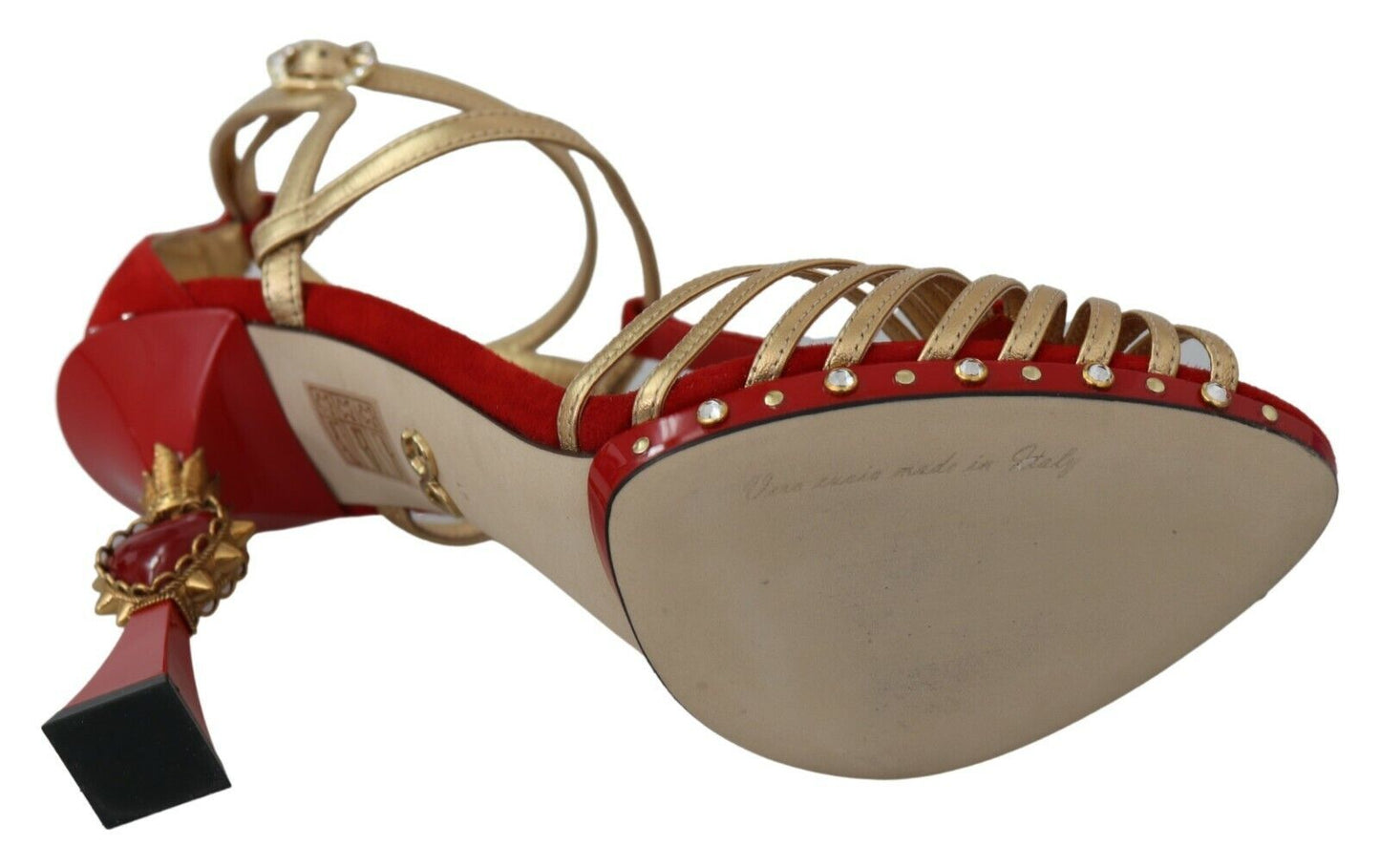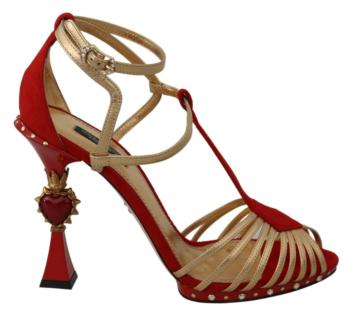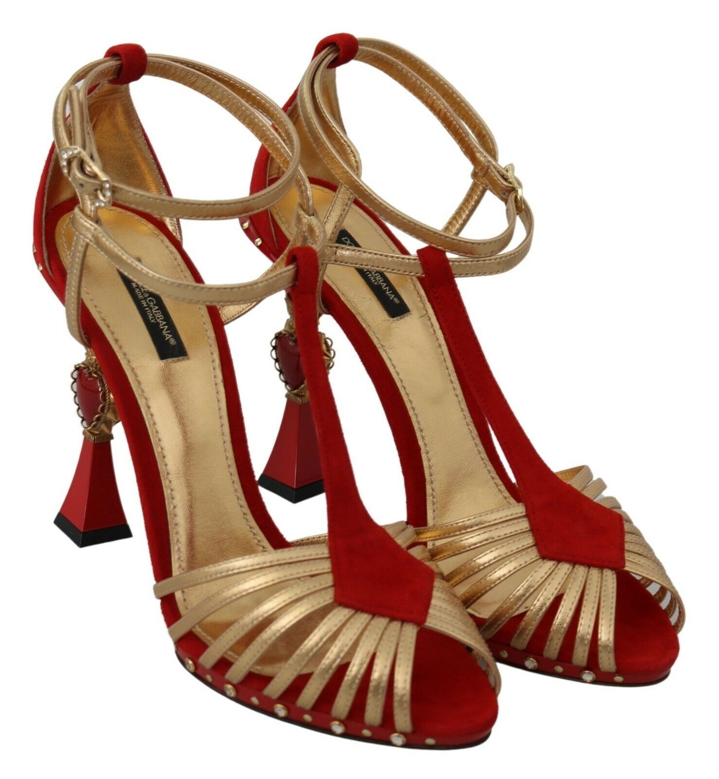 Exude elegance with these stunning Dolce & Gabbana ankle strap sandals, the perfect blend of luxury and passion. Crafted with a mix of supple leather and plush suede, these shoes feature a dazzling heart-shaped heel, accented by the brilliant sparkle of crystals on the gold buckle closure. The rich red hue embodies the classic Italian romance Dolce & Gabbana is renowned for. A chic leather sole adds a signature touch, ensuring these sandals are a timeless addition to any wardrobe. Handmade in Italy, they are a testament to impeccable craftsmanship and style.