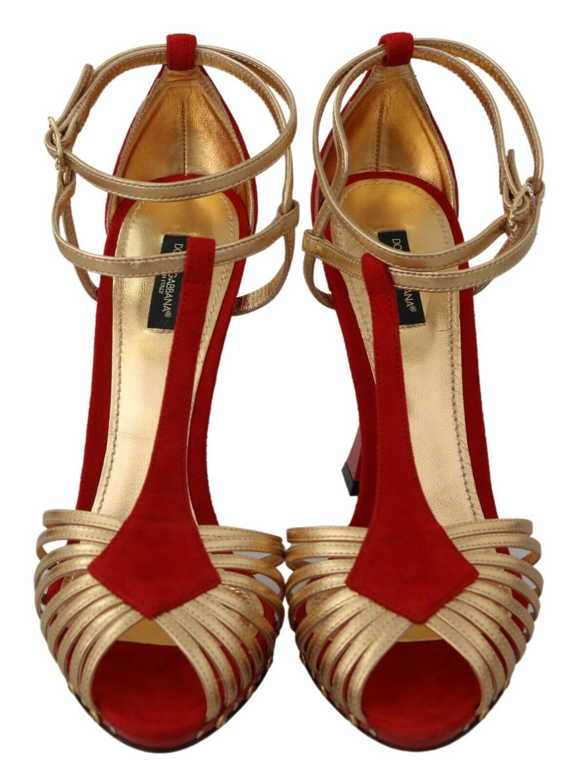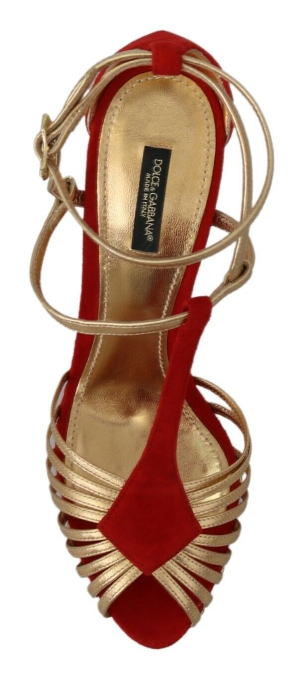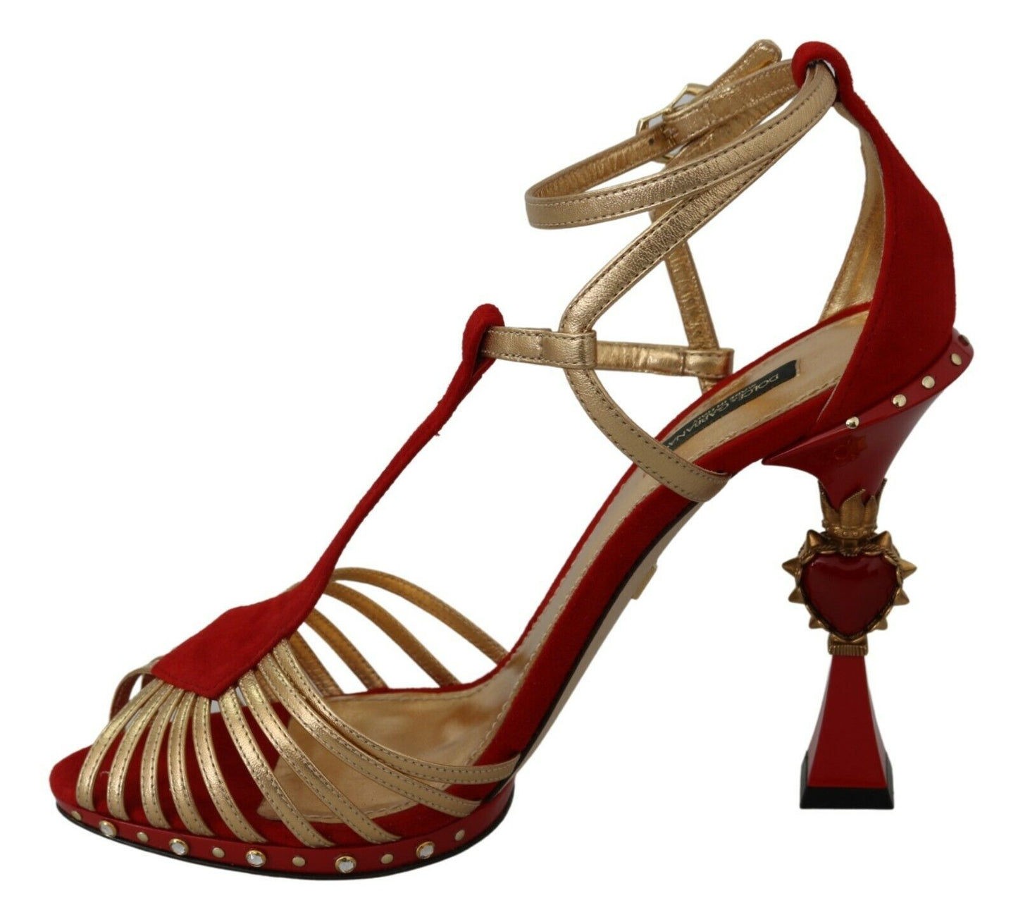 Exude elegance with these stunning Dolce & Gabbana ankle strap sandals, the perfect blend of luxury and passion. Crafted with a mix of supple leather and plush suede, these shoes feature a dazzling heart-shaped heel, accented by the brilliant sparkle of crystals on the gold buckle closure. The rich red hue embodies the classic Italian romance Dolce & Gabbana is renowned for. A chic leather sole adds a signature touch, ensuring these sandals are a timeless addition to any wardrobe. Handmade in Italy, they are a testament to impeccable craftsmanship and style.