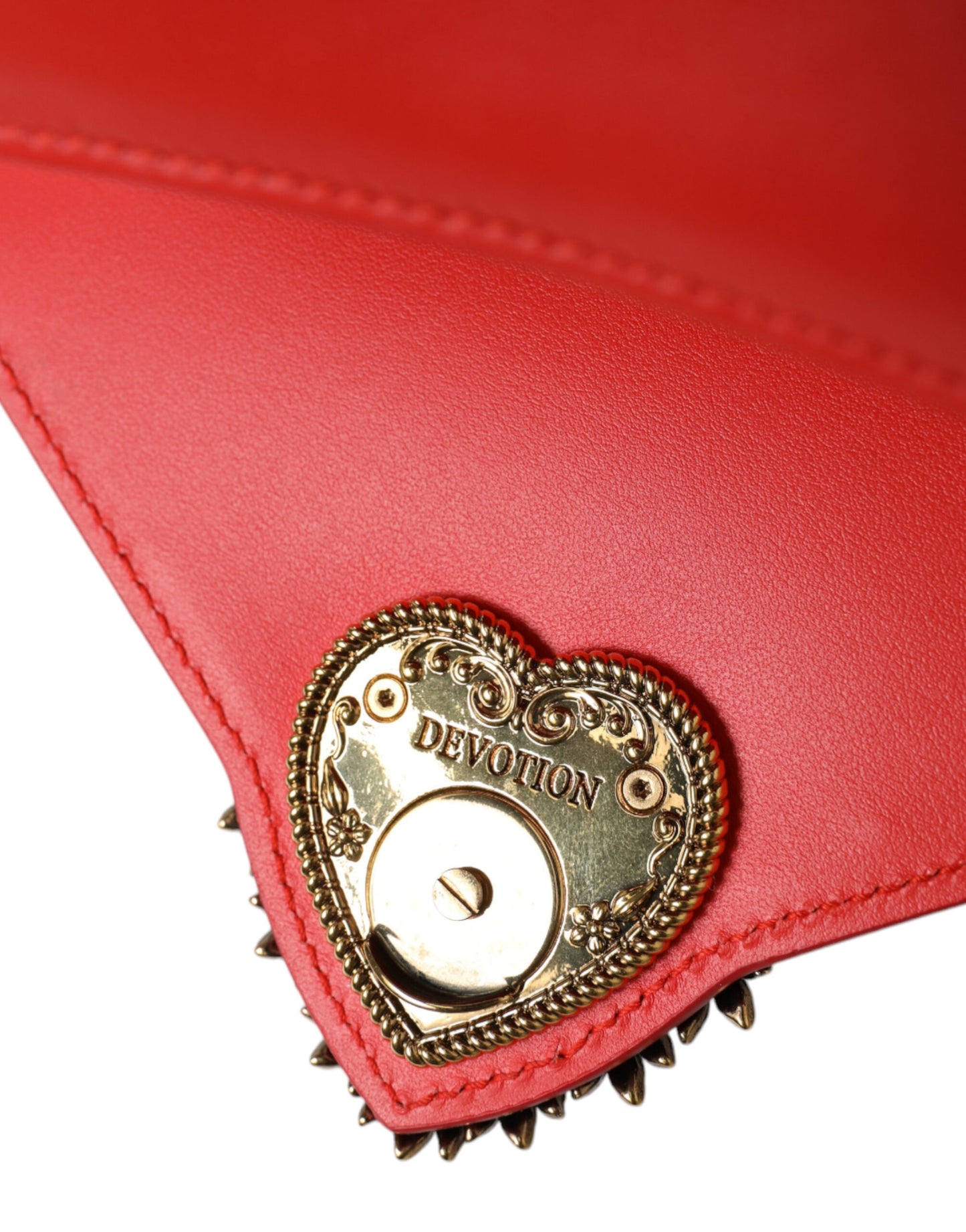 Indulge in the embodiment of luxury with our exquisite Dolce & Gabbana calfskin small Devotion envelope top handle bag. This stunning accessory is not just a bag, but a statement of elegance and commitment to high fashion. Boasting a vibrant red hue, complemented by lustrous gold metal detailing, it’s a truly gorgeous addition to any ensemble. The sleek magnetic closure unfolds to reveal a soft red inner lining, providing a sanctuary for your essentials. Impeccable Italian craftsmanship assures a timeless appeal and durability that befits the most discerning fashion aficionado.