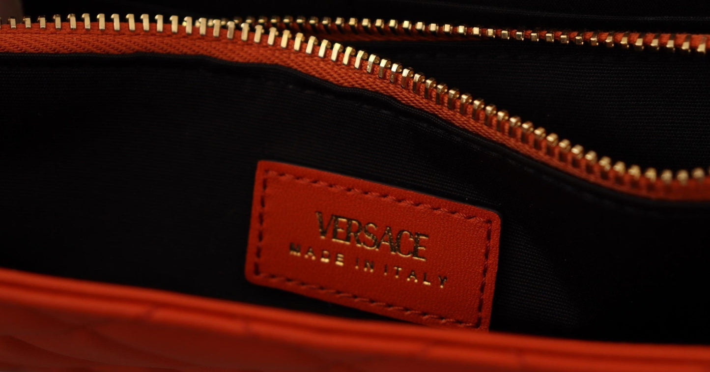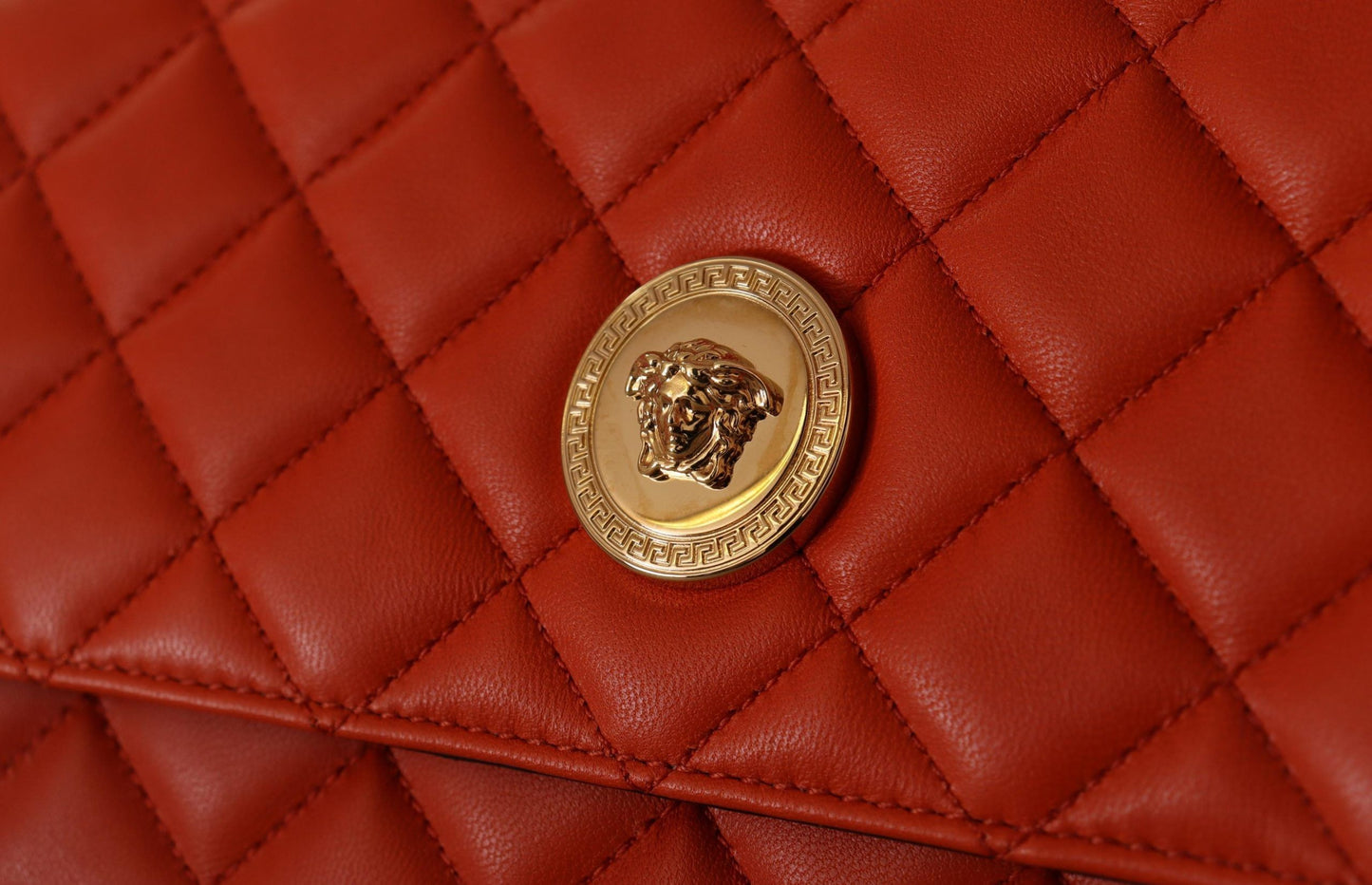Indulge in the opulence of Versace with this stunning Red Nappa Leather Evening Bag, perfect for any sophisticated outing. A radiant gold-tone medusa head logo embellishes the front, enhancing its elegant appeal. This exquisite piece features a practical flap snap closure, leading to two main compartments with an additional interior zip compartment, ensuring your essentials are organized and secure. The stylish bag is completed with a removable chain shoulder strap, offering versatile carry options as a shoulder or crossbody bag.