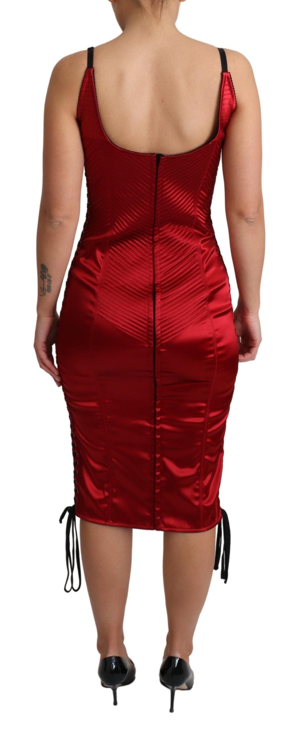 Step into the spotlight with this stunning Dolce & Gabbana bright red midi dress. Crafted from luxurious satin that intensifies its vivid hue, the dress features a flattering fitted silhouette. Its corset bodice, complete with side lacing, not only enhances your figure but also adds an element of classical elegance. Perfect for creating a statement at any high-end event, this garment promises Italian craftsmanship and distinguished Dolce & Gabbana style. Detailed with a discreet zipper closure and logo accents, this dress is a testament to superior tailoring.