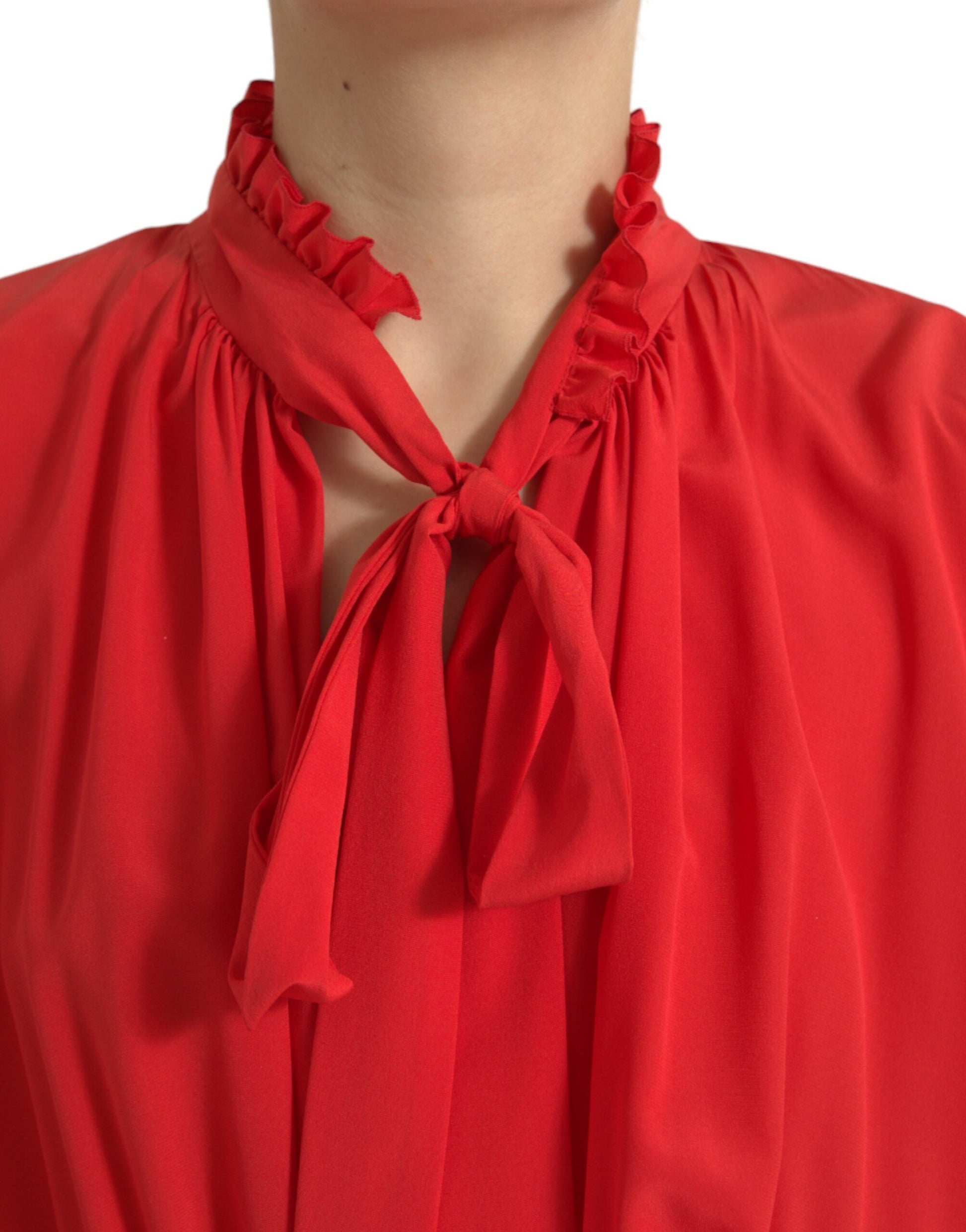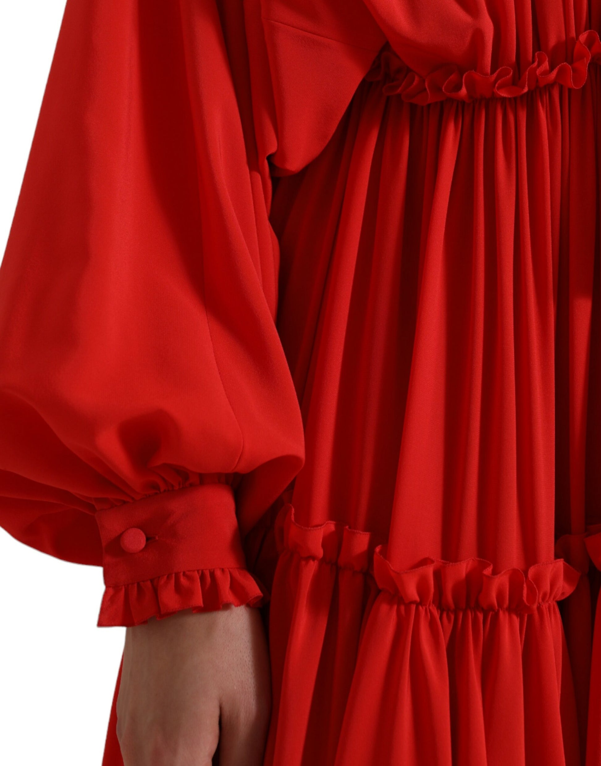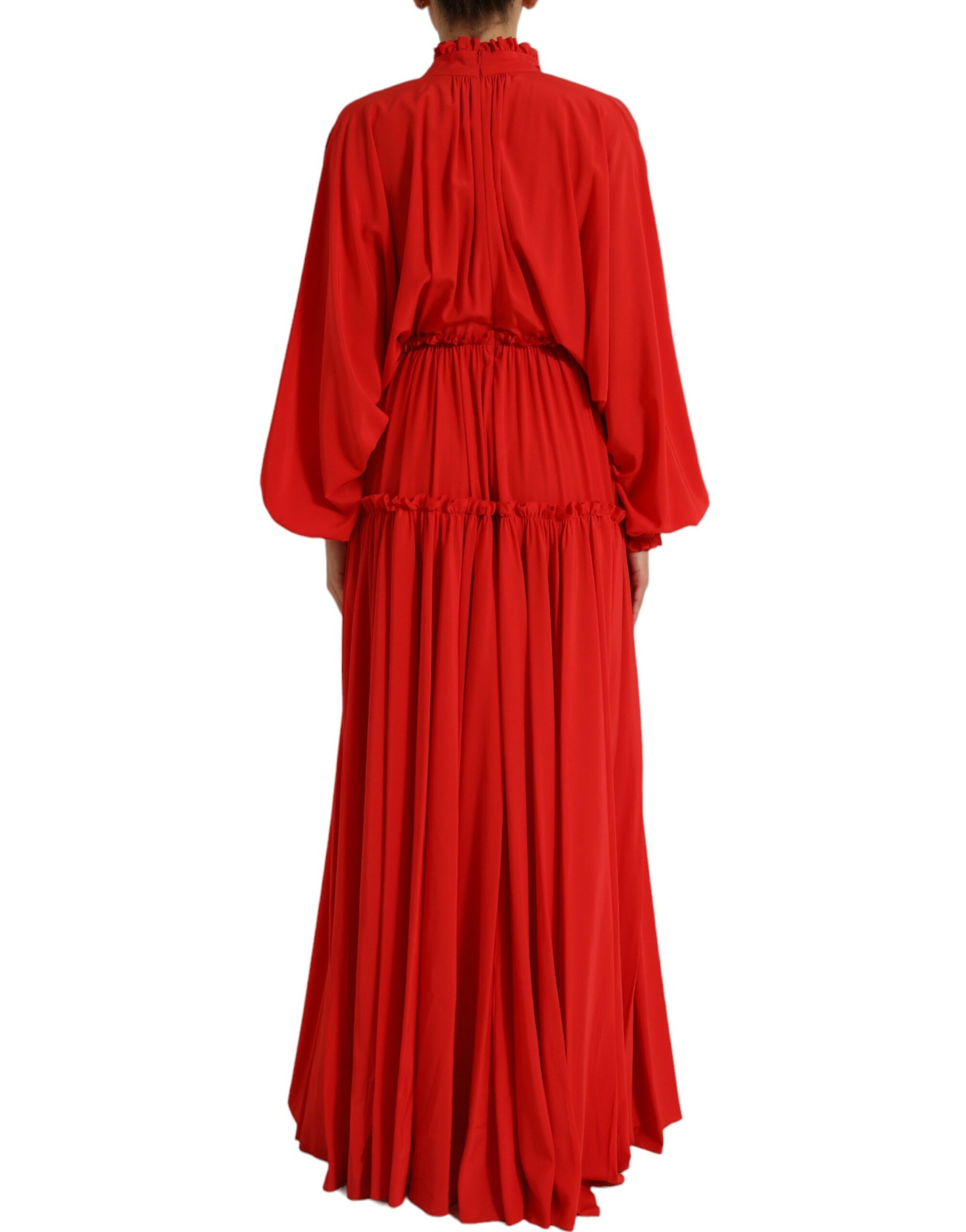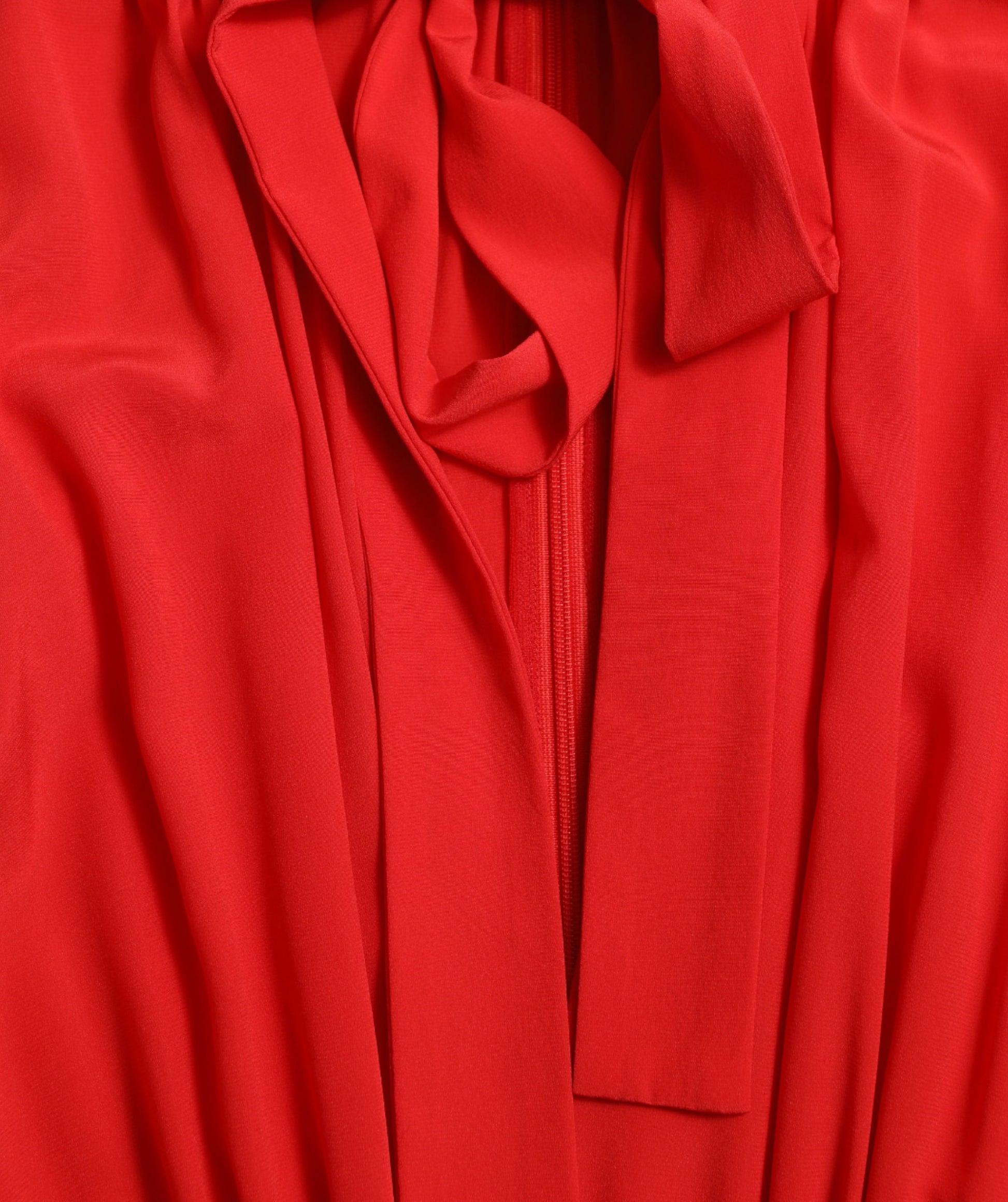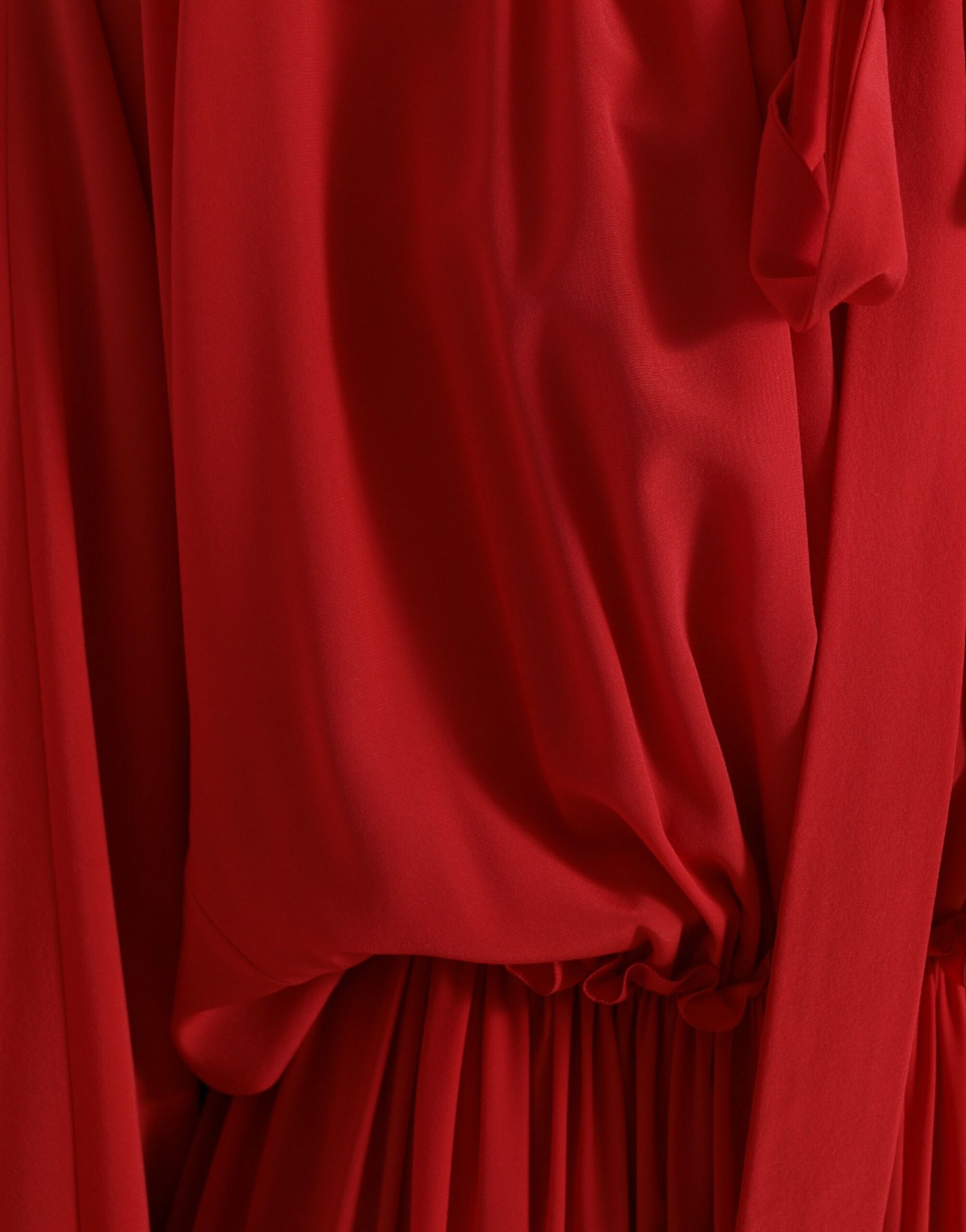 Red Silk Long Gown Pleated Ascot Collar Dress