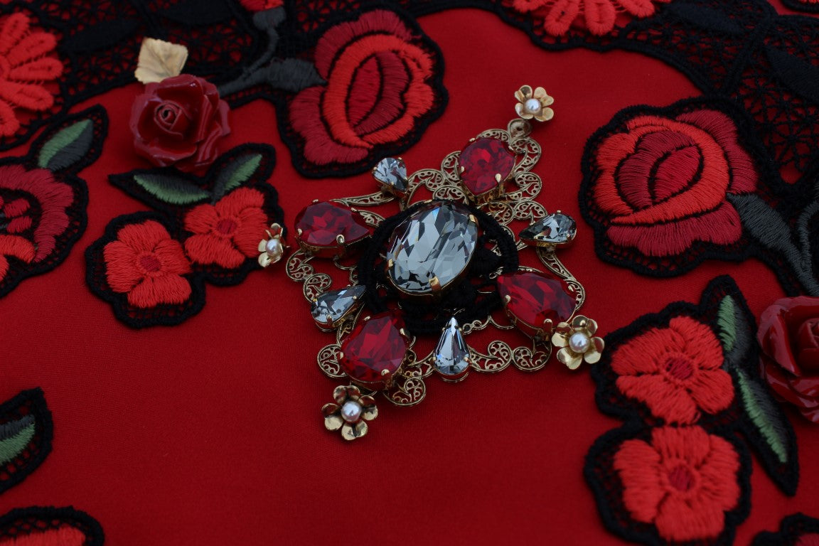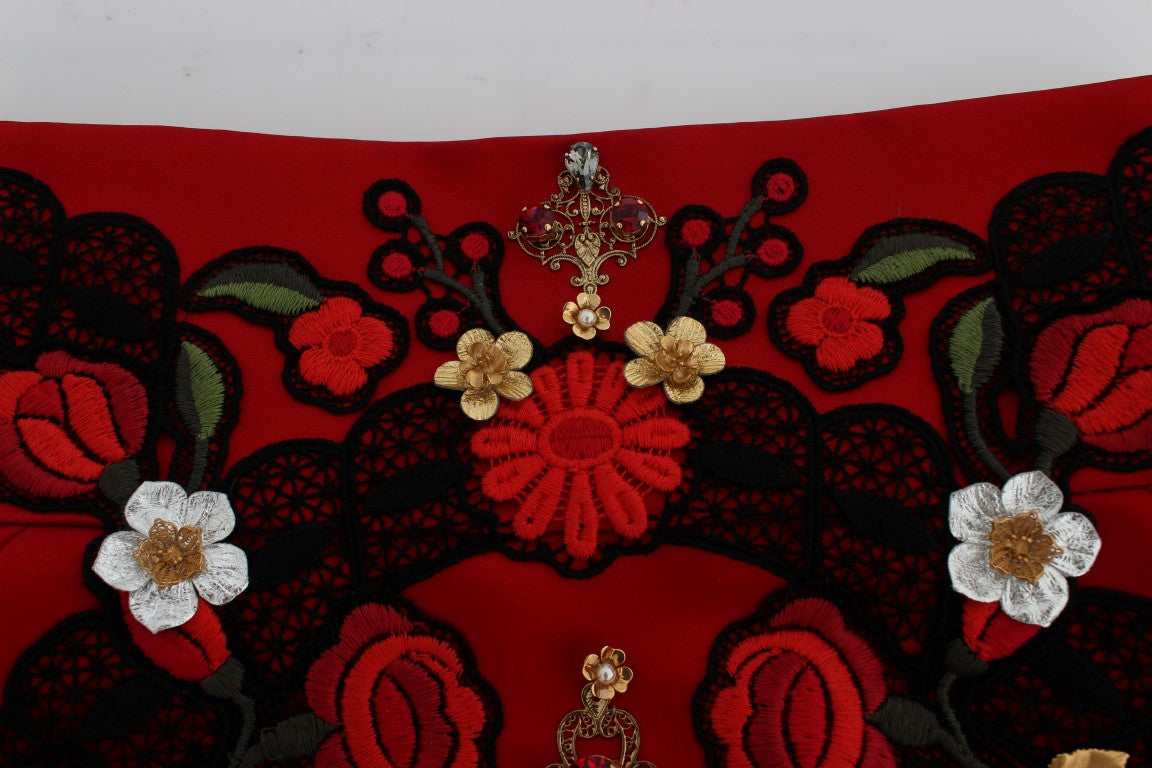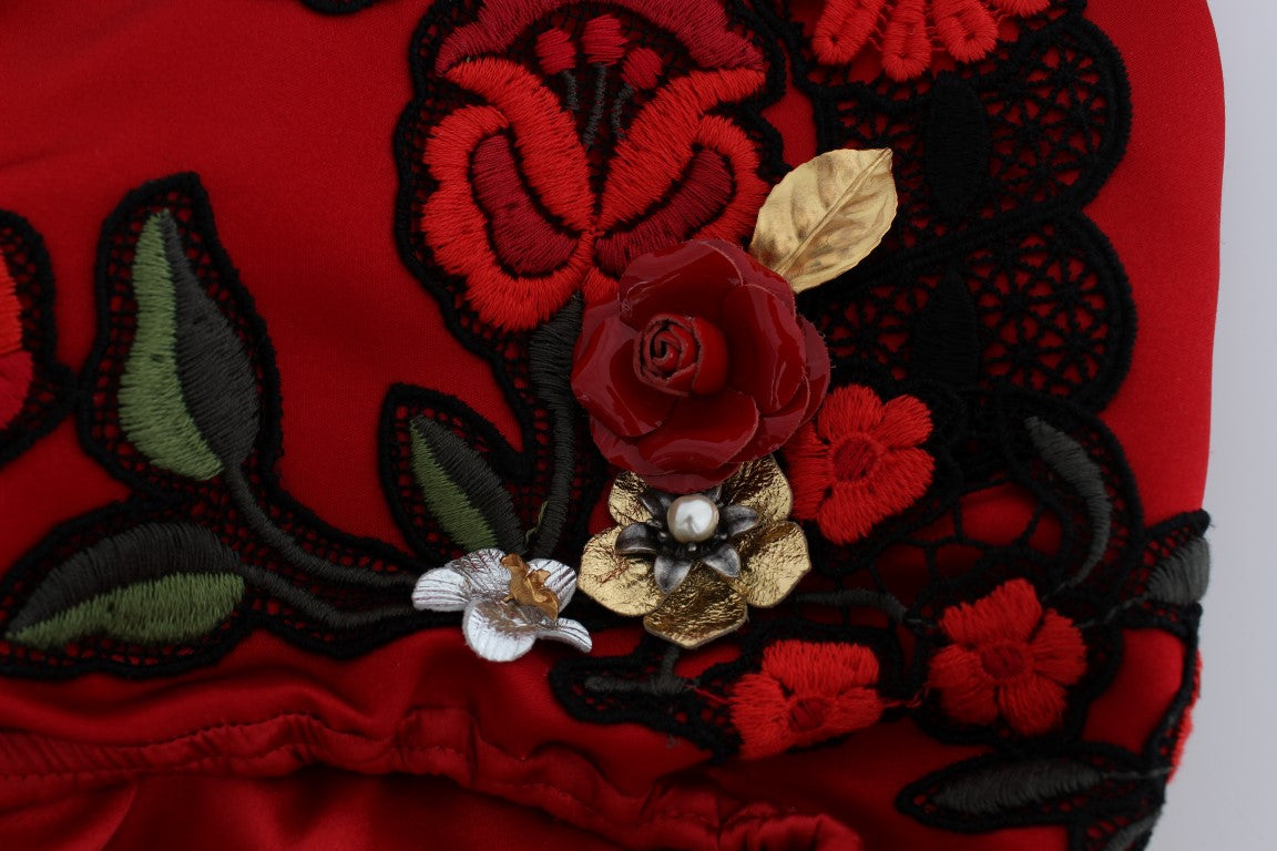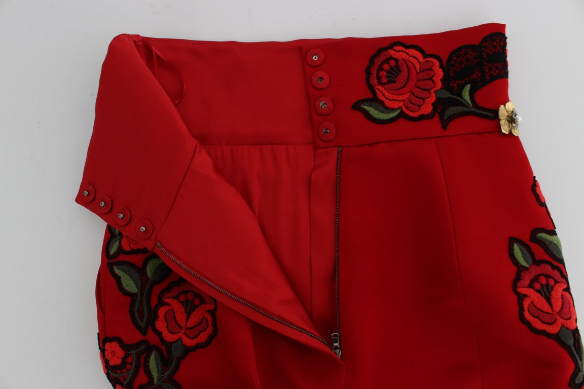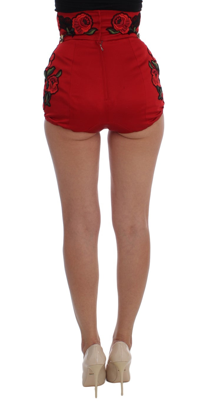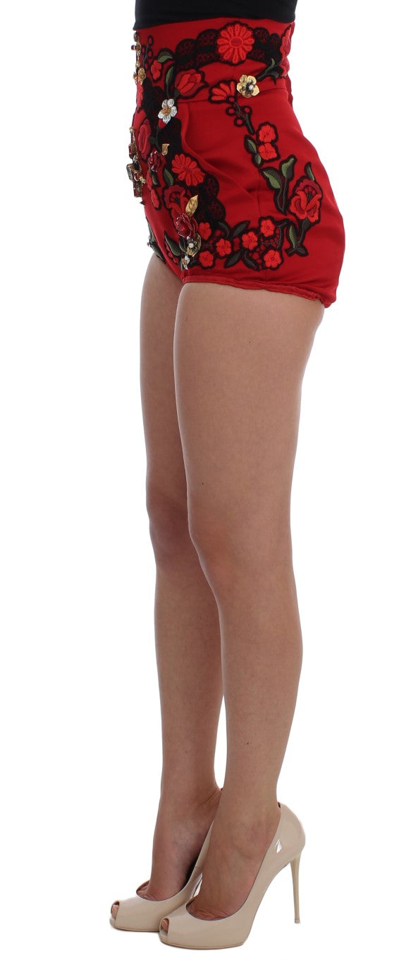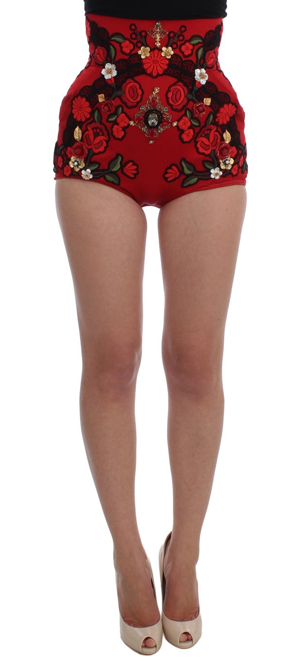 Discover the epitome of luxury with our high waist, red silk shorts adorned with intricate rose embroidery and sparkling crystal details. These beautifully crafted shorts are a testament to Dolce & Gabbana’s commitment to excellence, as part of their MainLine Collection. Perfect for a glamorous statement, these shorts pair exquisitely with elegant tops for an enchanting ensemble.