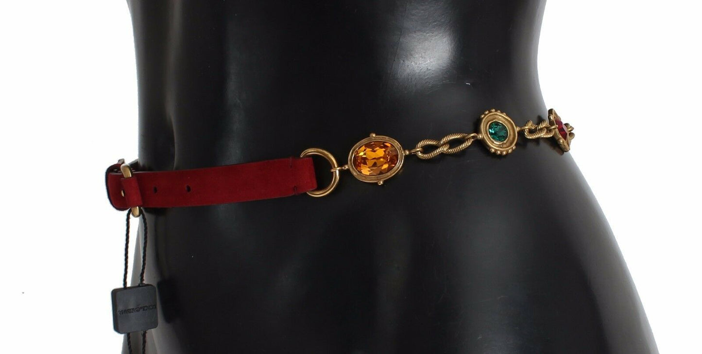Enhance your silhouette with the opulent touch of this red suede baroque waist belt by Dolce & Gabbana. Adorned with multicolor crystals and gold metal detailing, this luxurious accessory is a statement piece designed to elevate any outfit. Made in Italy, it epitomizes the brand’s commitment to craftsmanship and style.