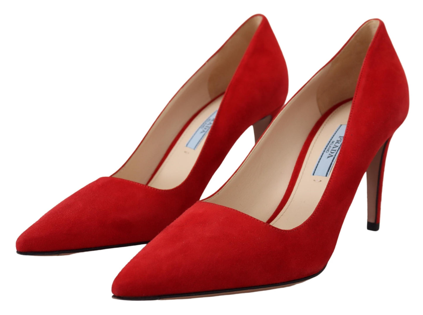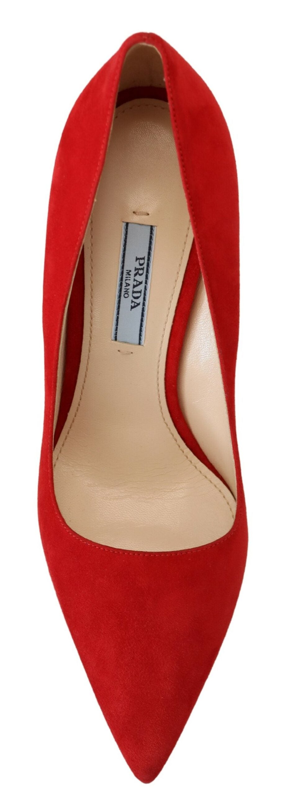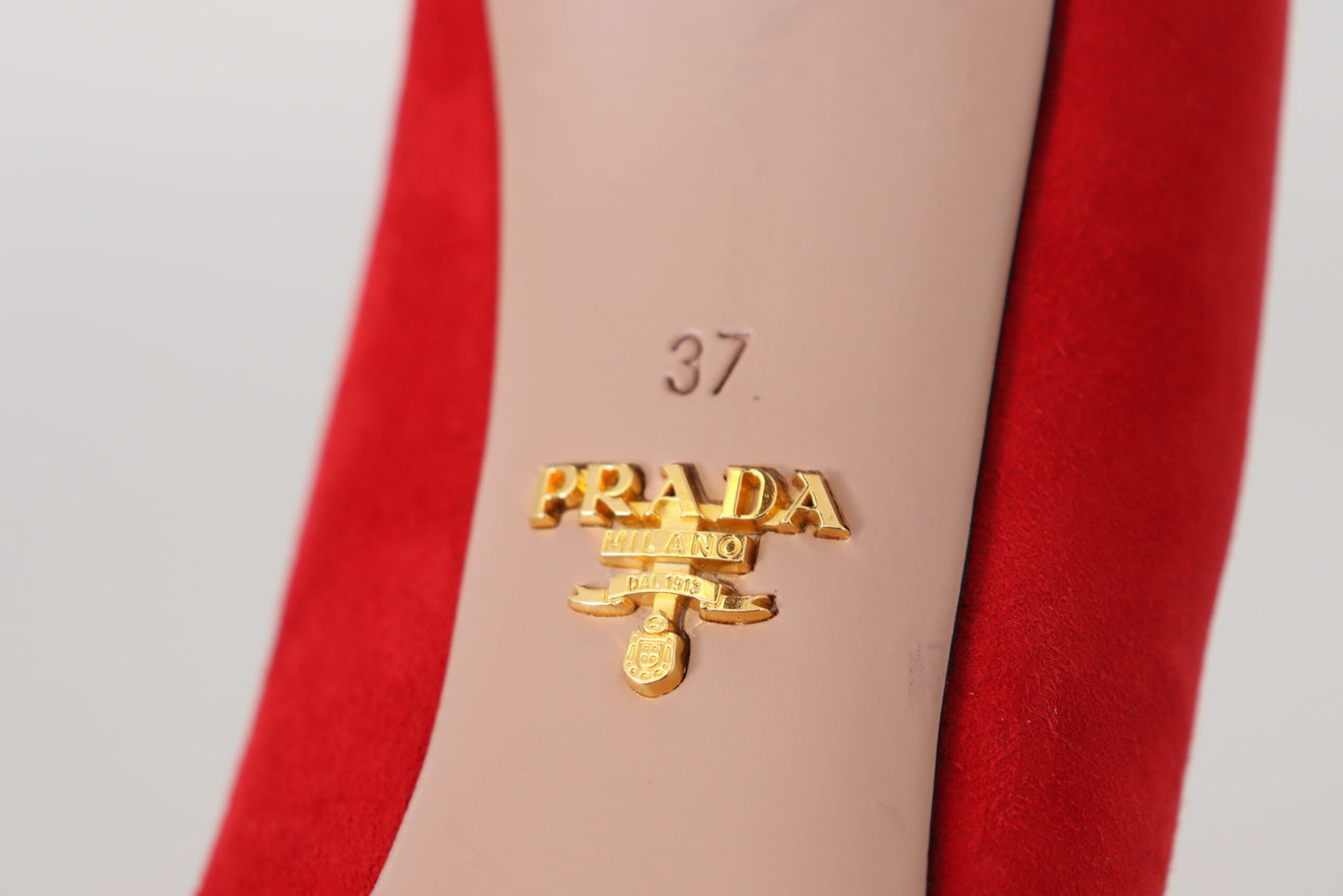 Step into luxury with these stunning red suede heels from Prada, perfect for adding a splash of color and sophistication to any ensemble. Crafted in Italy, these shoes exemplify high craftsmanship with their delicate logo details and are designed to offer comfort without compromising on style. Whether for a special occasion or to elevate your everyday look, these pumps will be a cherished addition to your footwear collection.