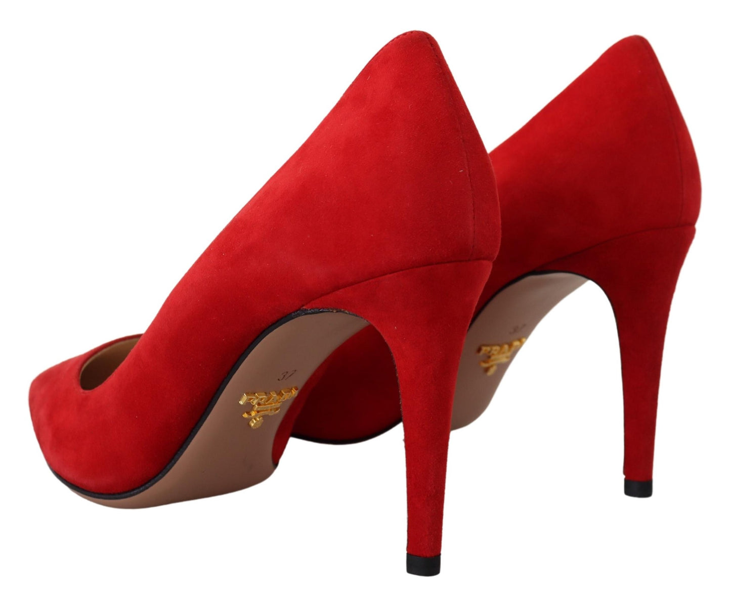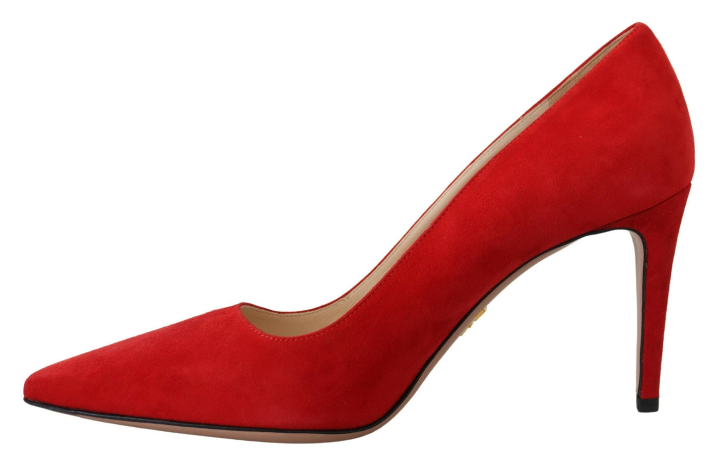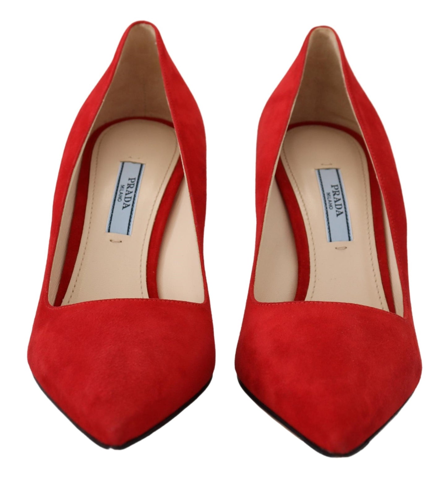 Step into luxury with these stunning red suede heels from Prada, perfect for adding a splash of color and sophistication to any ensemble. Crafted in Italy, these shoes exemplify high craftsmanship with their delicate logo details and are designed to offer comfort without compromising on style. Whether for a special occasion or to elevate your everyday look, these pumps will be a cherished addition to your footwear collection.