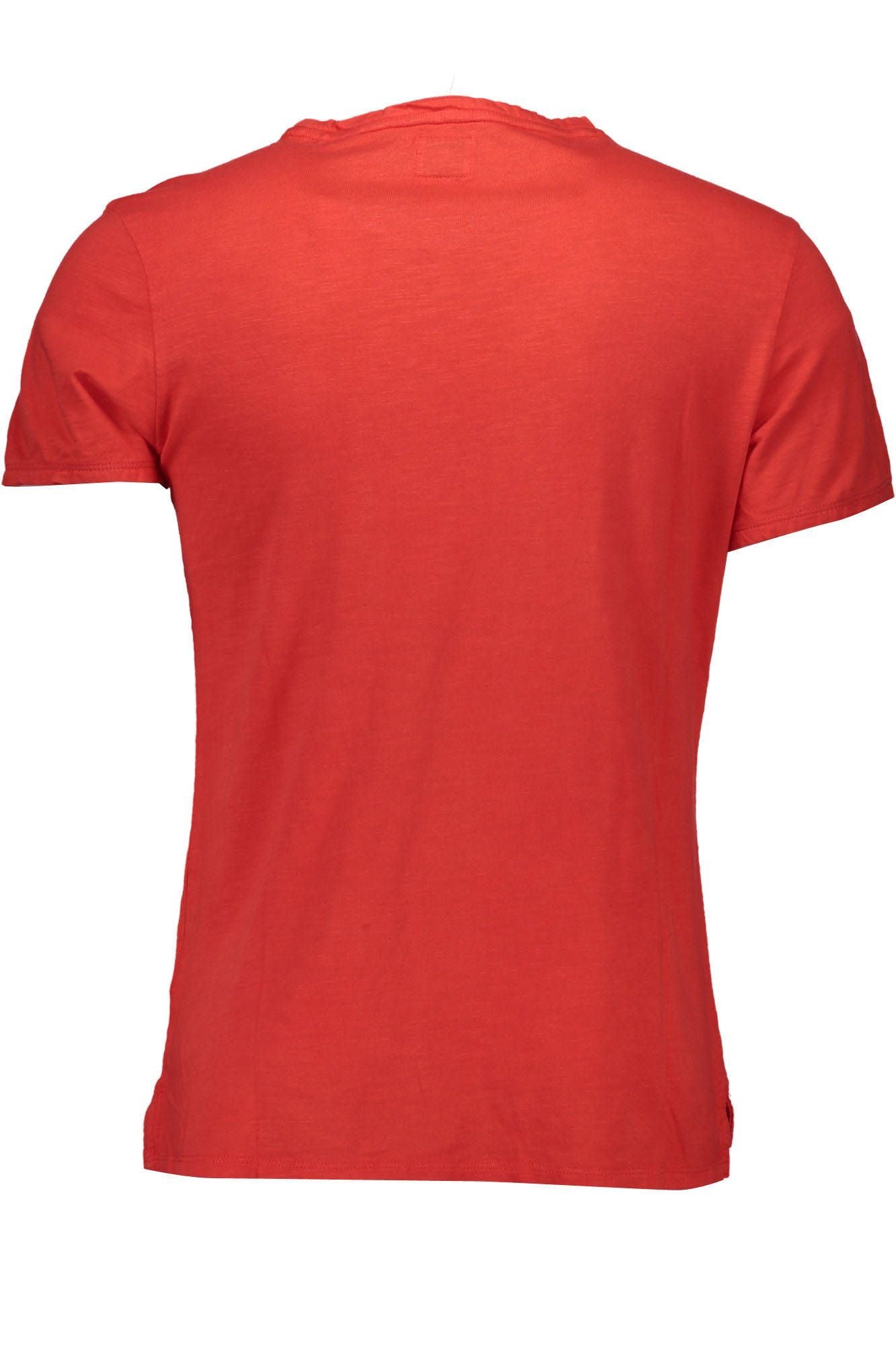 Indulge in the casual elegance of this vibrant red t-shirt, boasting a sleek round neck design and adorned with the iconic Guess Jeans logo. Perfect for adding a pop of color and style to your everyday wardrobe.