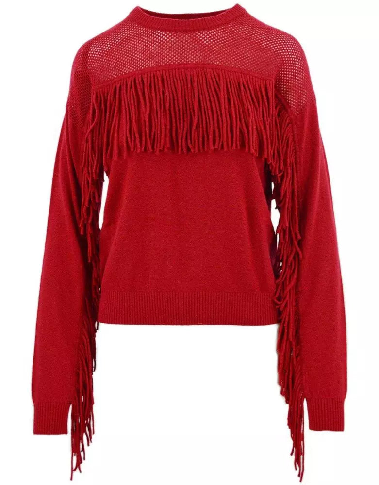 Perforated Crew-Neck Red Sweater with Fringe Detail