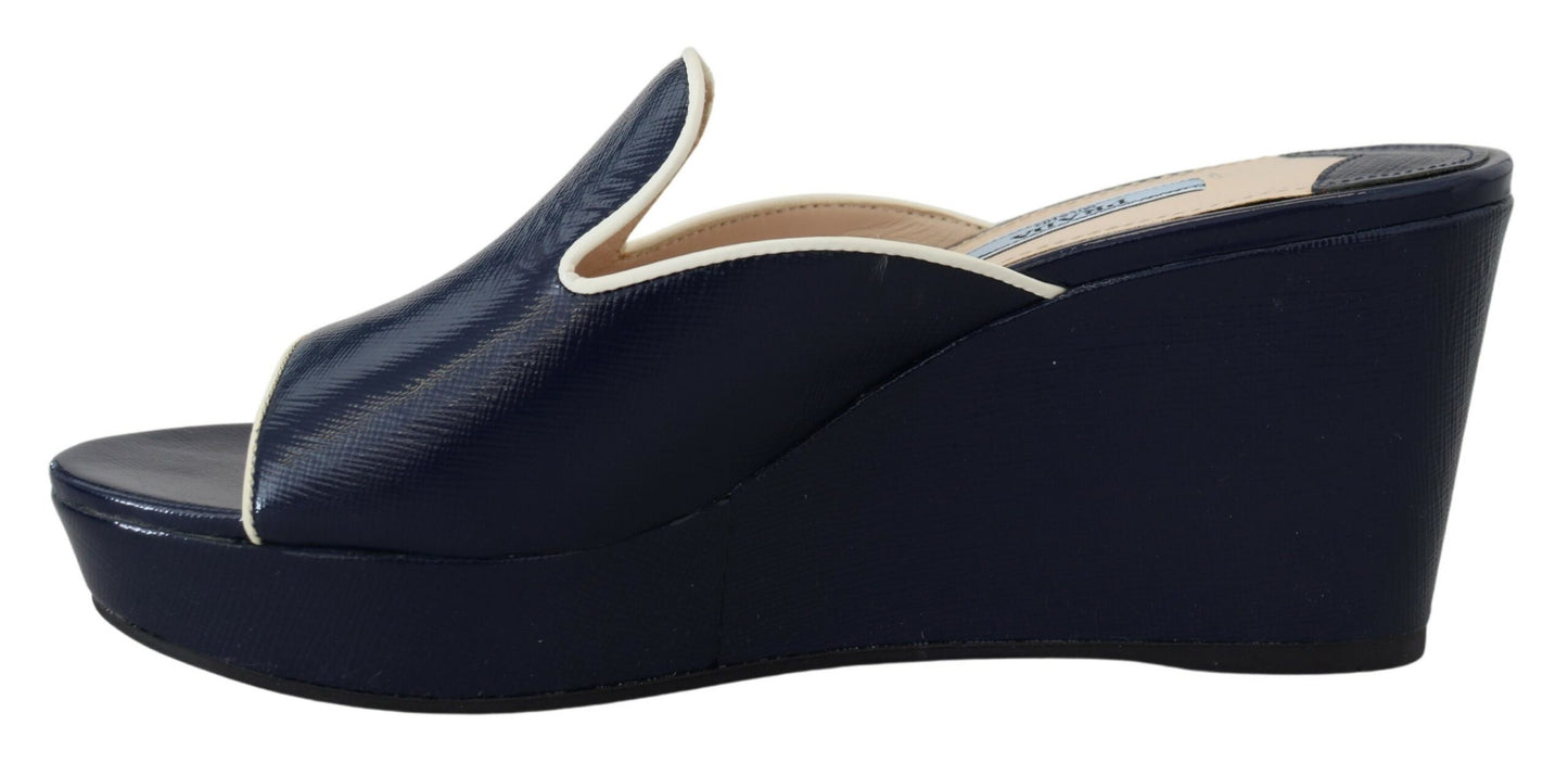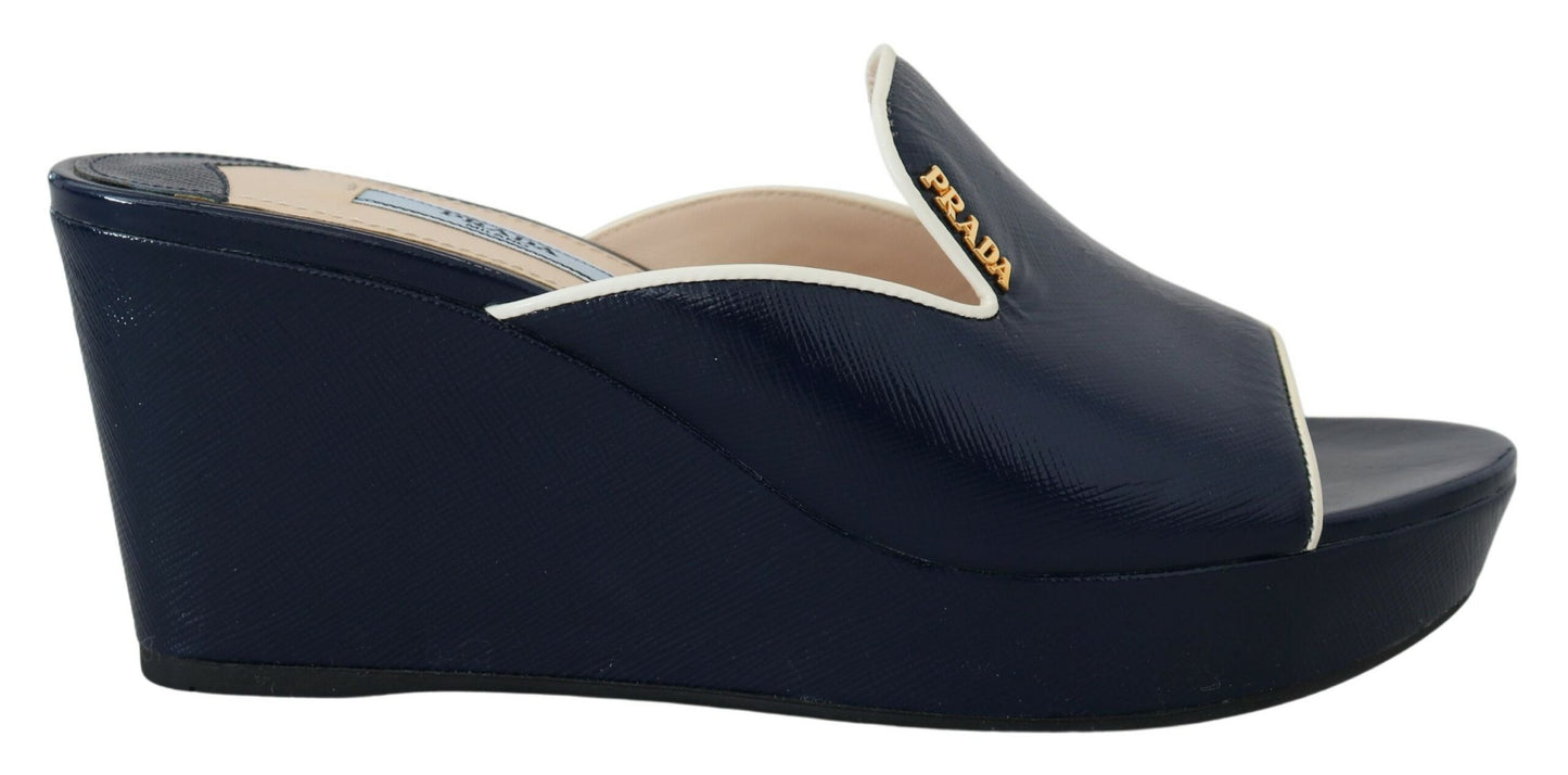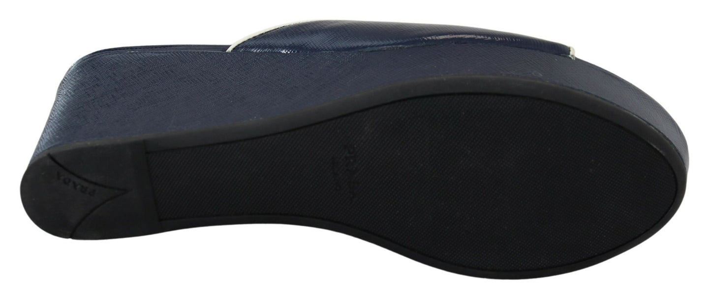Step into luxury with these stunning Royal Blue Wedge Sandals by Prada. These brand new sandals come with their original tags, ensuring their authenticity and pristine condition. Crafted with high-quality leather and featuring an eye-catching royal blue hue, these wedges are the epitome of exclusive design and superior craftsmanship. Made in Italy and boasting the iconic Prada logo, these sandals are perfect for adding a pop of color and elegance to your ensemble. With a comfortable rubber sole, these shoes are as practical as they are stylish, making them a must-have for any fashion-forward wardrobe.