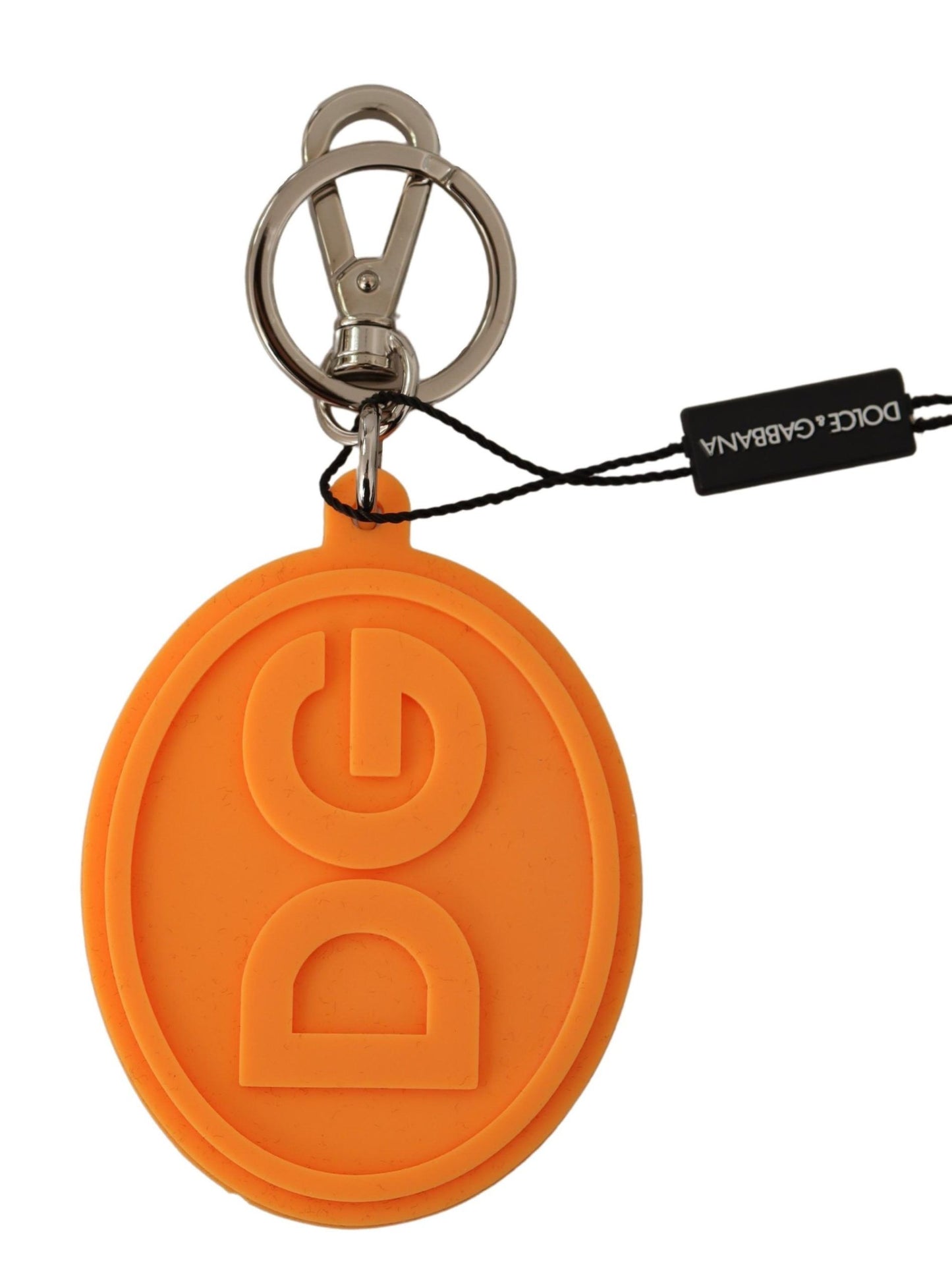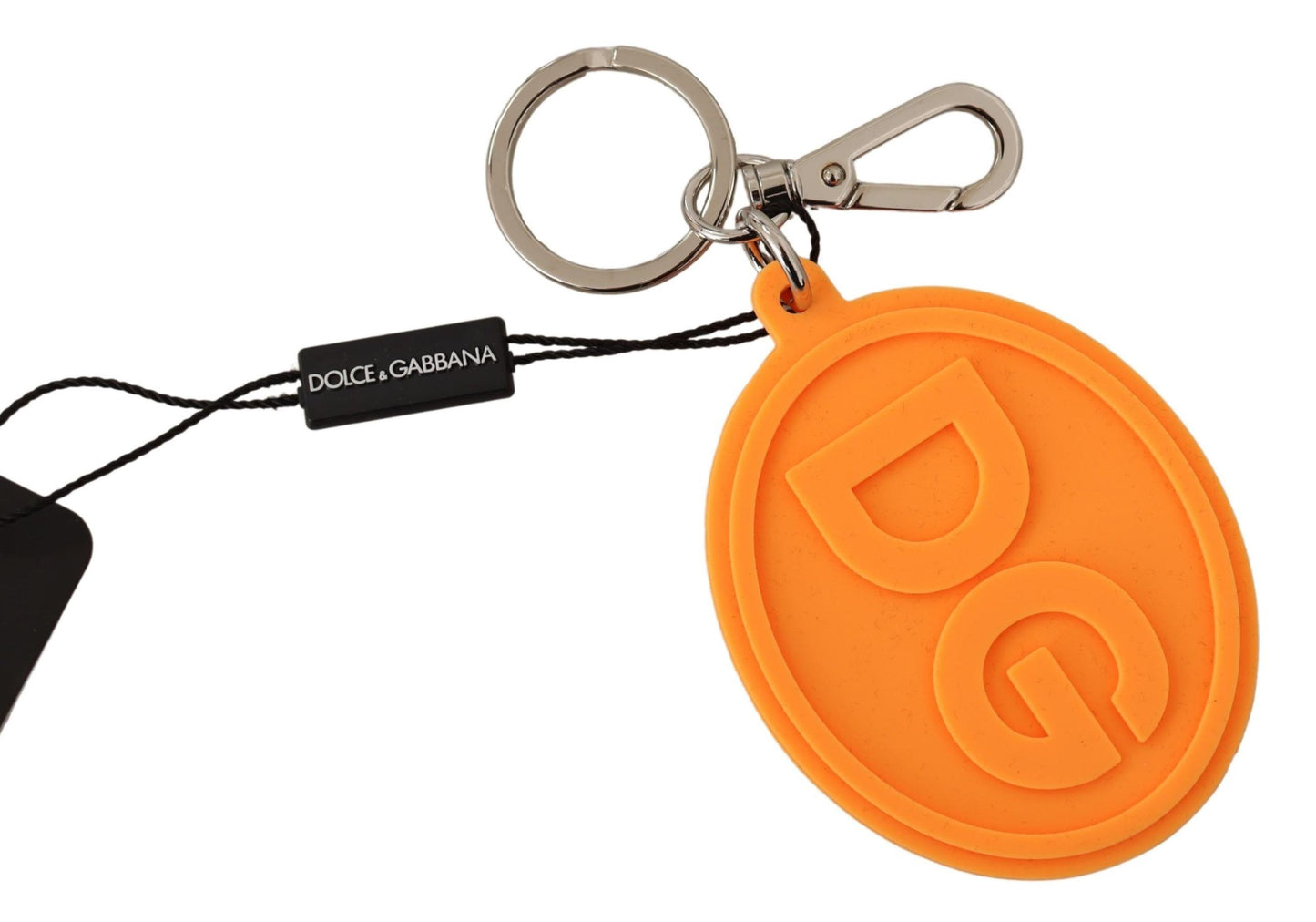 Accentuate your style with this stunning and authentic keychain from Dolce & Gabbana. With its eye-catching orange hue and silver accents, this accessory is not only practical but a statement of elegance. Featuring a sturdy brass ring and logo-engraved metal hardware, this keychain adds a touch of luxury to your everyday essentials. Made in Italy, it embodies the quality and sophistication synonymous with the brand.