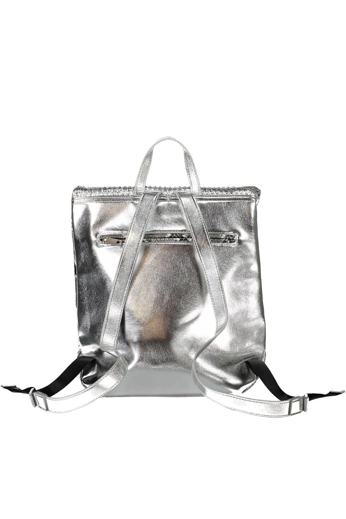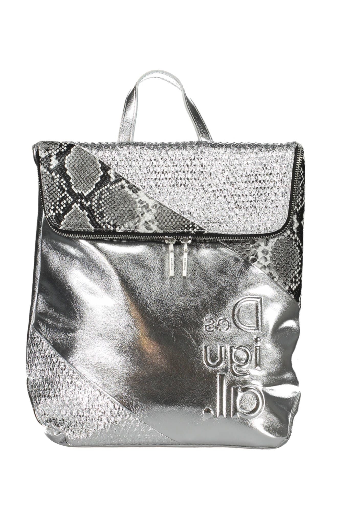 Make a statement with this striking silver backpack from Desigual, perfect for the modern woman on the go. It features an ergonomic handle for easy carrying, adjustable straps ensuring a comfortable fit, and a secure zip and magnet closure to keep your belongings safe. The backpack boasts an external back pocket for quick access items and two internal pockets to help keep everything organized. Contrasting details add a touch of elegance to this practical accessory.