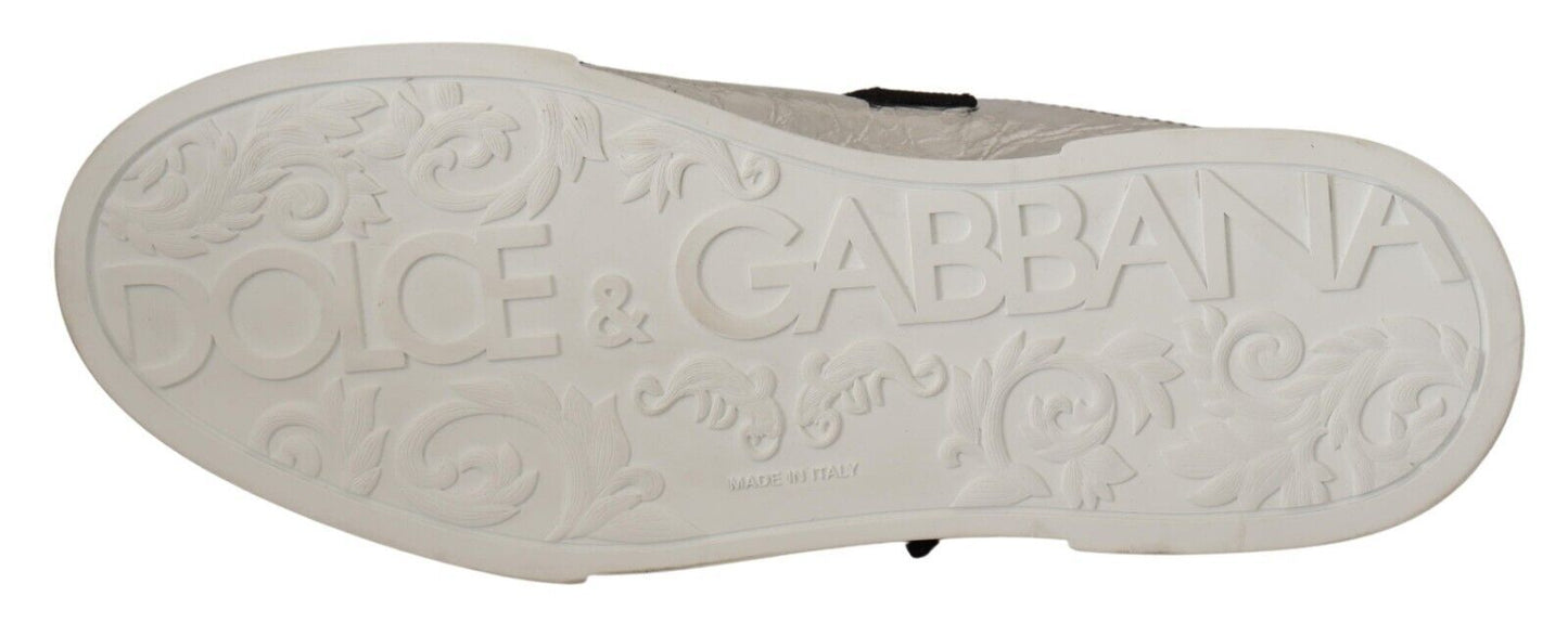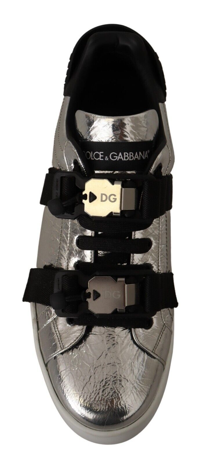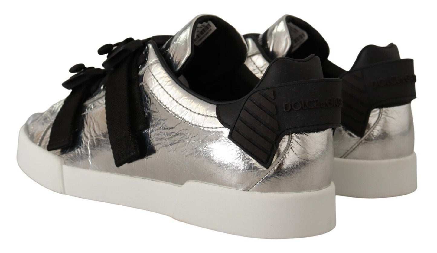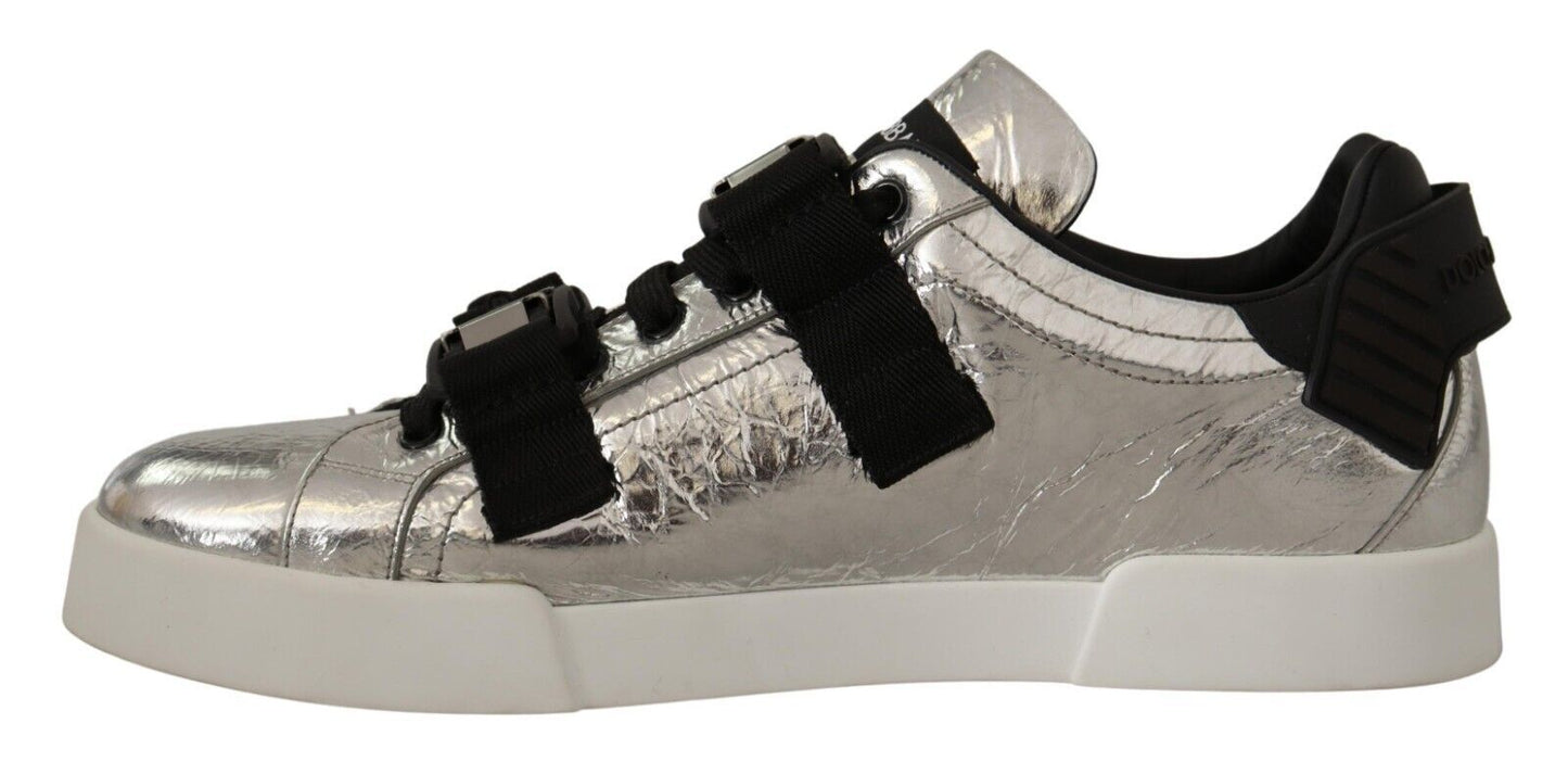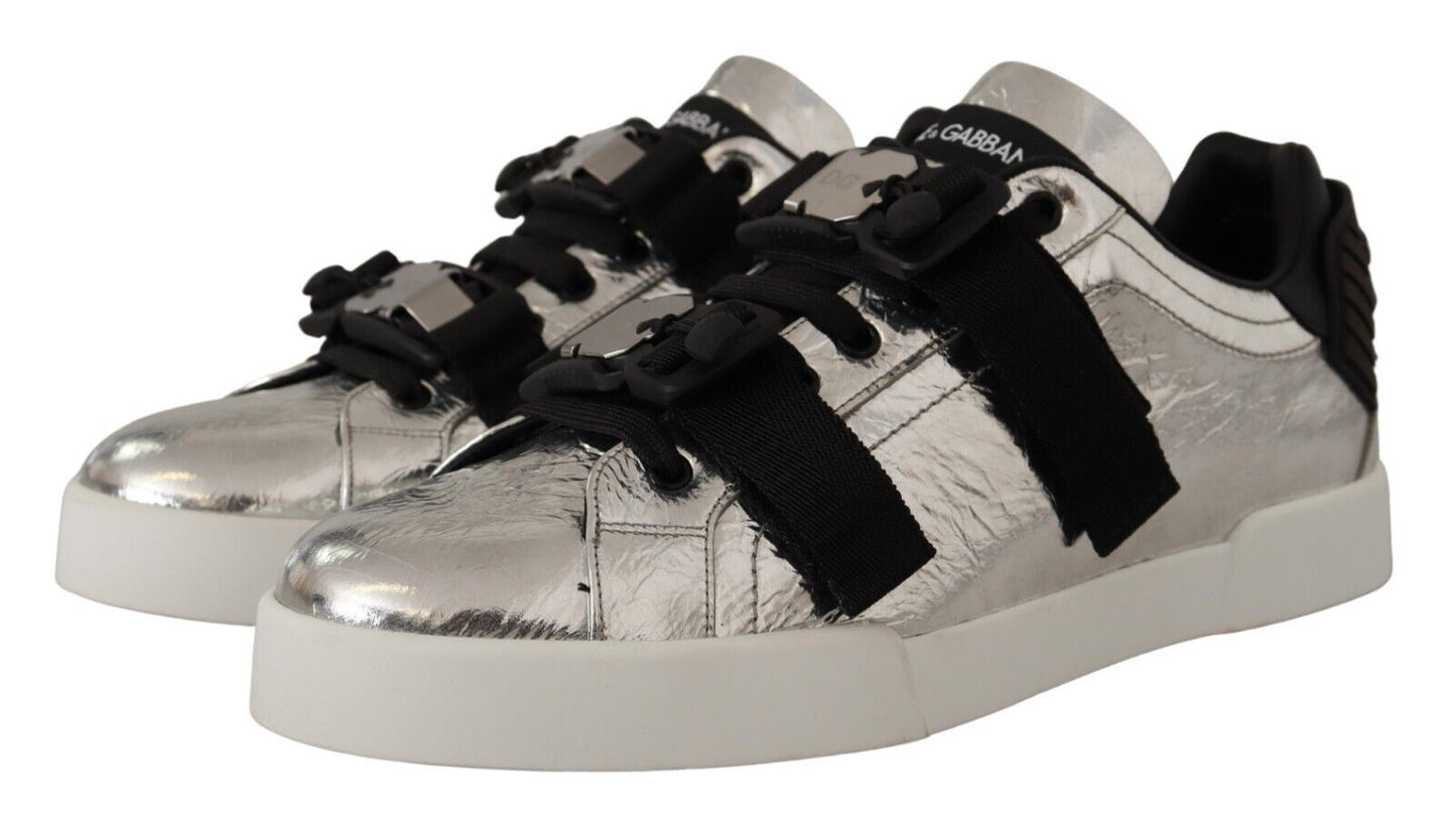 Step into luxury and style with these 100% Authentic sneakers from Dolce & Gabbana. These black and silver low top casual sneakers are a testament to Italian craftsmanship, perfect for adding a touch of elegance to your footwear collection. The sleek leather construction pairs with a lace and buckle strap closure for a secure and stylish fit. Finished with the iconic logo detail and set on a durable rubber sole, they are as practical as they are fashionable. A must-have for any fashion-forward individual.