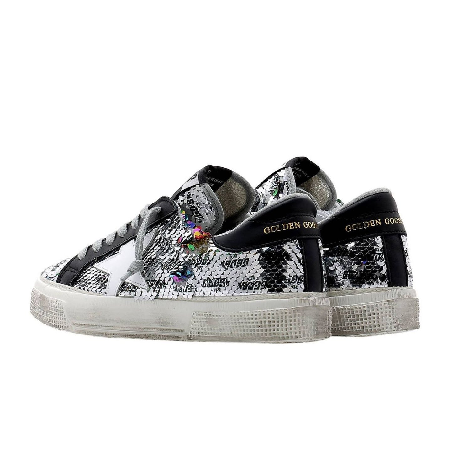 Step into irresistible Italian elegance with these dazzling Golden Goose sequined calfskin sneakers. Offering a blend of luxurious materials and signature details, these kicks are perfect for adding a sparkle to your casual ensembles. The contrast of the black leather heel counter and the iconic white leather star logo complements the lush gray sequins, ensuring that your every step glistens with sophistication. All crafted on a comfortable rubber sole for all-day wear.