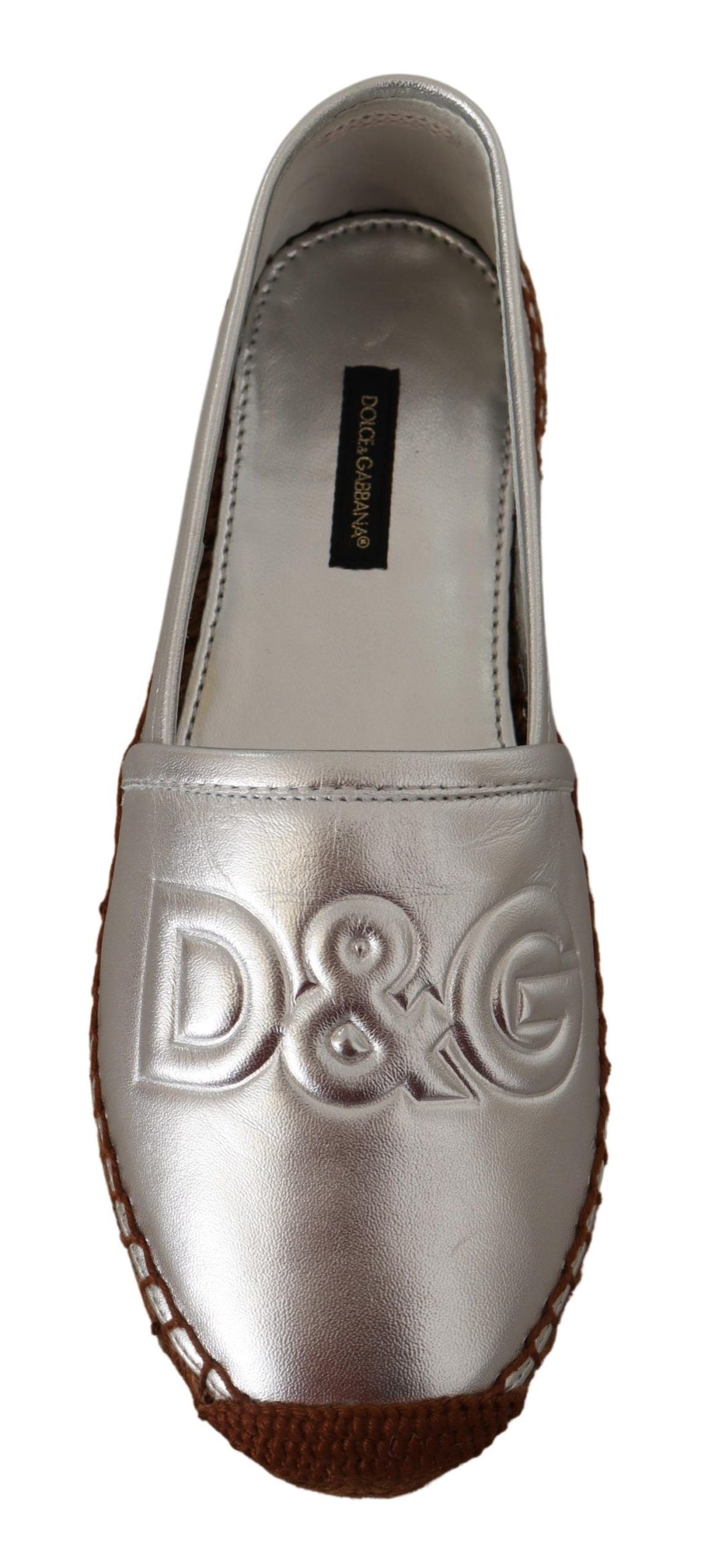 Step into luxury with these gorgeous, 100% Authentic espadrilles flat shoes. Fresh from the latest collection, these stunning silver flats are crafted from premium leather and boast a sleek design with logo details. Perfect for adding a touch of elegance to your casual ensemble, they feature a comfortable leather sole, ensuring style doesn’t come at the expense of comfort. Proudly made in Italy by Dolce & Gabbana, they’re a versatile addition to any fashionista’s wardrobe.